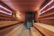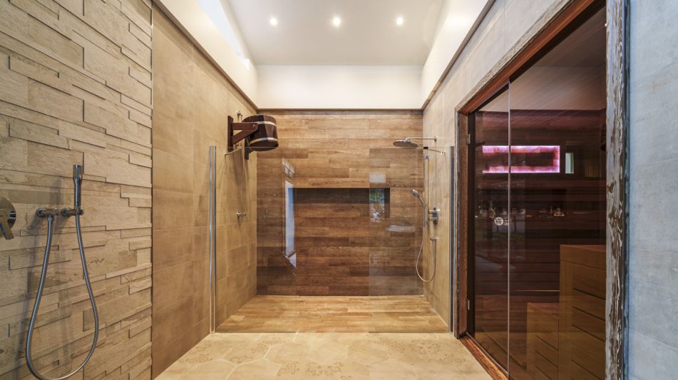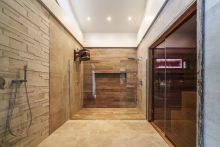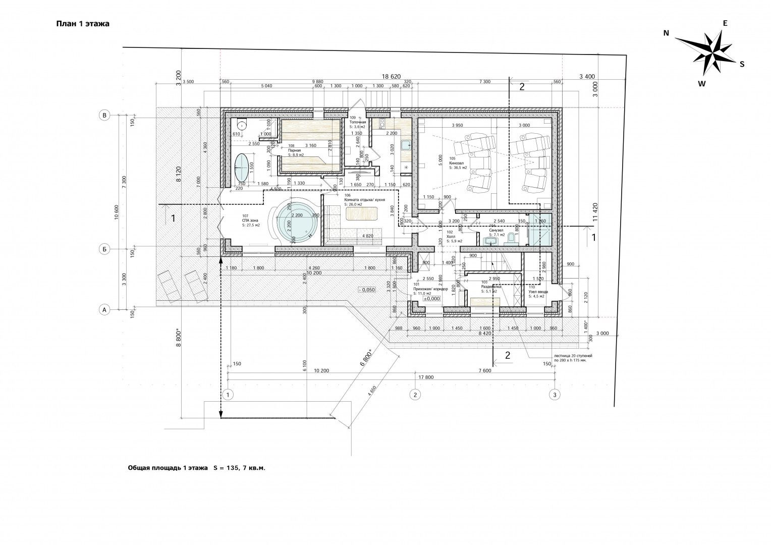 Первый этаж: гардеробная с постирочной, домашний кинотеатр, кухня, гостиная, топочная, санузел, Зона СПА: гидромассажная ванна, душевая с ведром для обливания, парная и выход на террасу