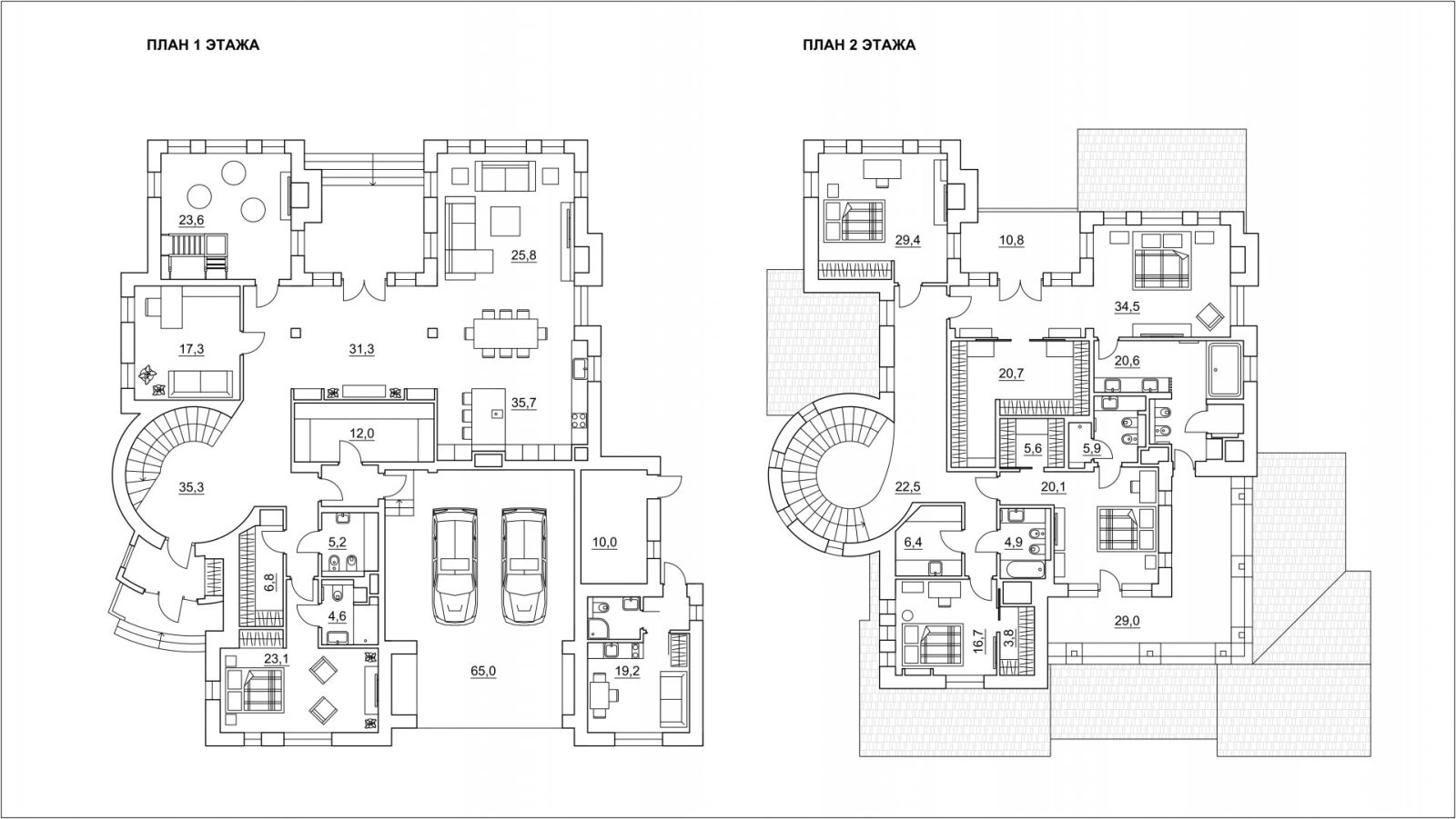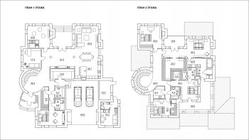 Первый этаж: Холл, гостевой блок: спальня и санузел, гардеробная, гостевой санузел, кладовая, гараж на 2 машино-места, кабинет, детская игровая, выход на террасу, объединённая кухня, столовая, гостиная с камином, котельная, блок для персонала