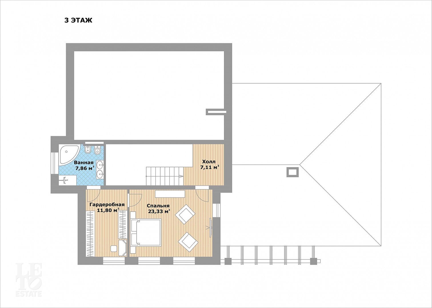 Третий этаж: мастер-спальня с ванной и гардеробной, холл.