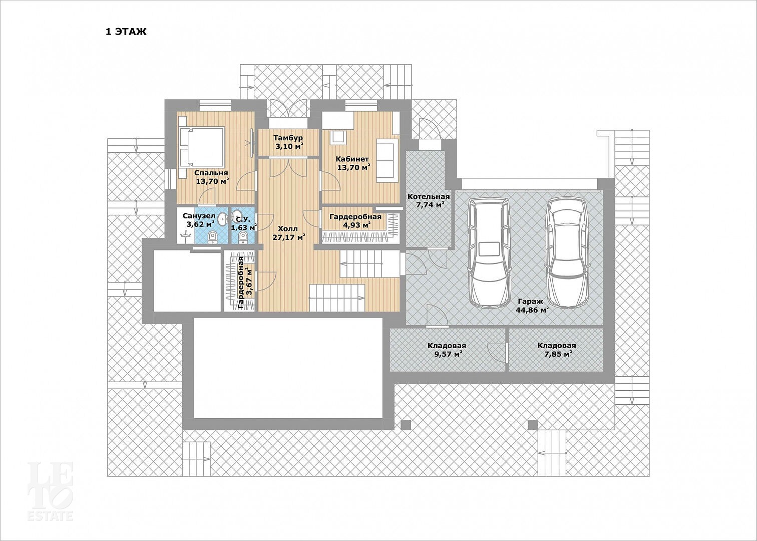 Первый этаж: тамбур, парадный холл, 2 гардеробные, гостевая спальня с ванной, кабинет, гостевой санузел, гараж на 2 м/м, котельная, 2 кладовые.