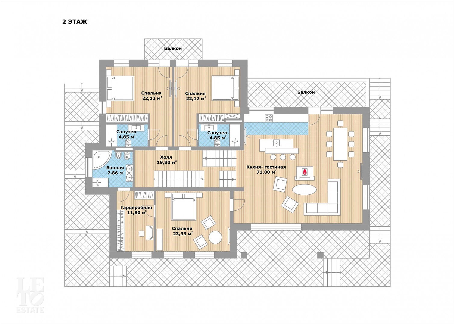 Второй этаж: кухня-гостиная с выходом на балкон, холл, мастер-спальня с ванной и гардеробной, 2 комнаты с ванными и выходами на общий балкон.
