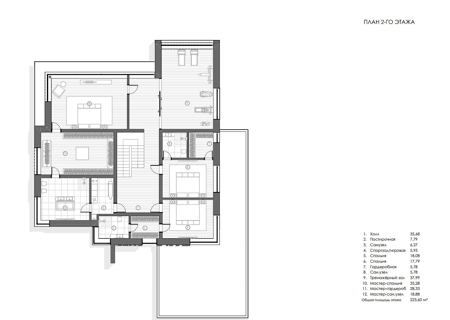 Второй этаж: холл, постирочная, санузел, спортзал/игровая, спальня, спальня, гардеробная, санузел, тренажерный зал, мастер спальня с гардеробной и санузлом.