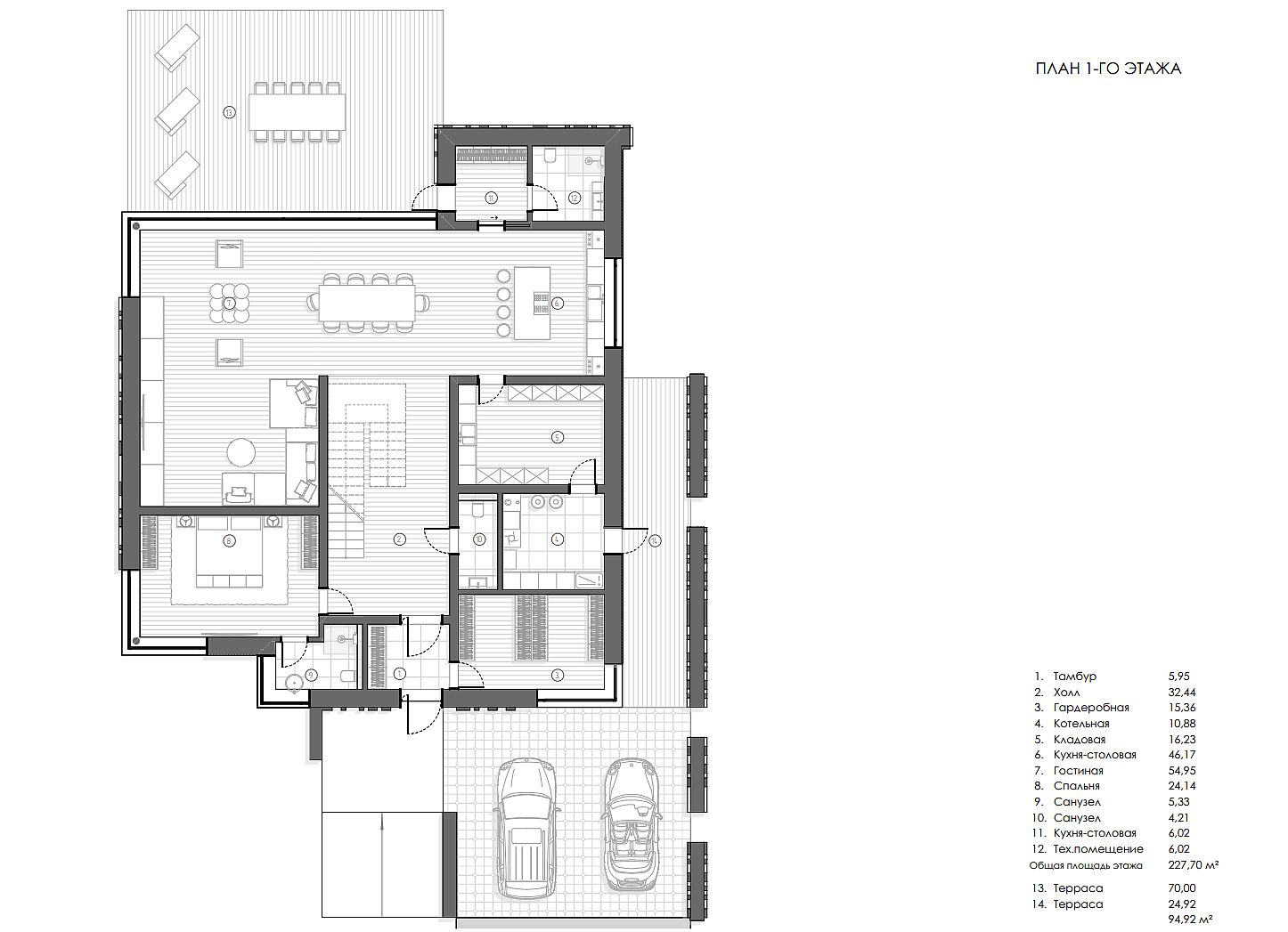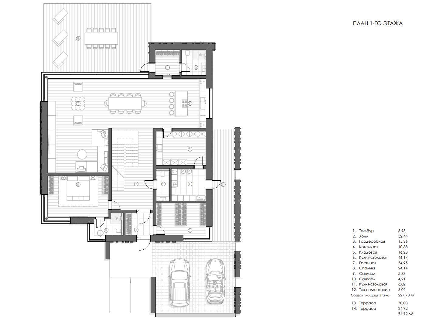 Первый этаж: холл, гардеробная, котельная, кладовая, кухня-столовая, гостиная, спальня, санузел, санузел, рабочая кухня, техническое помещение;