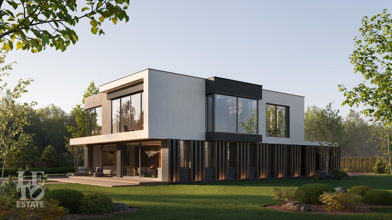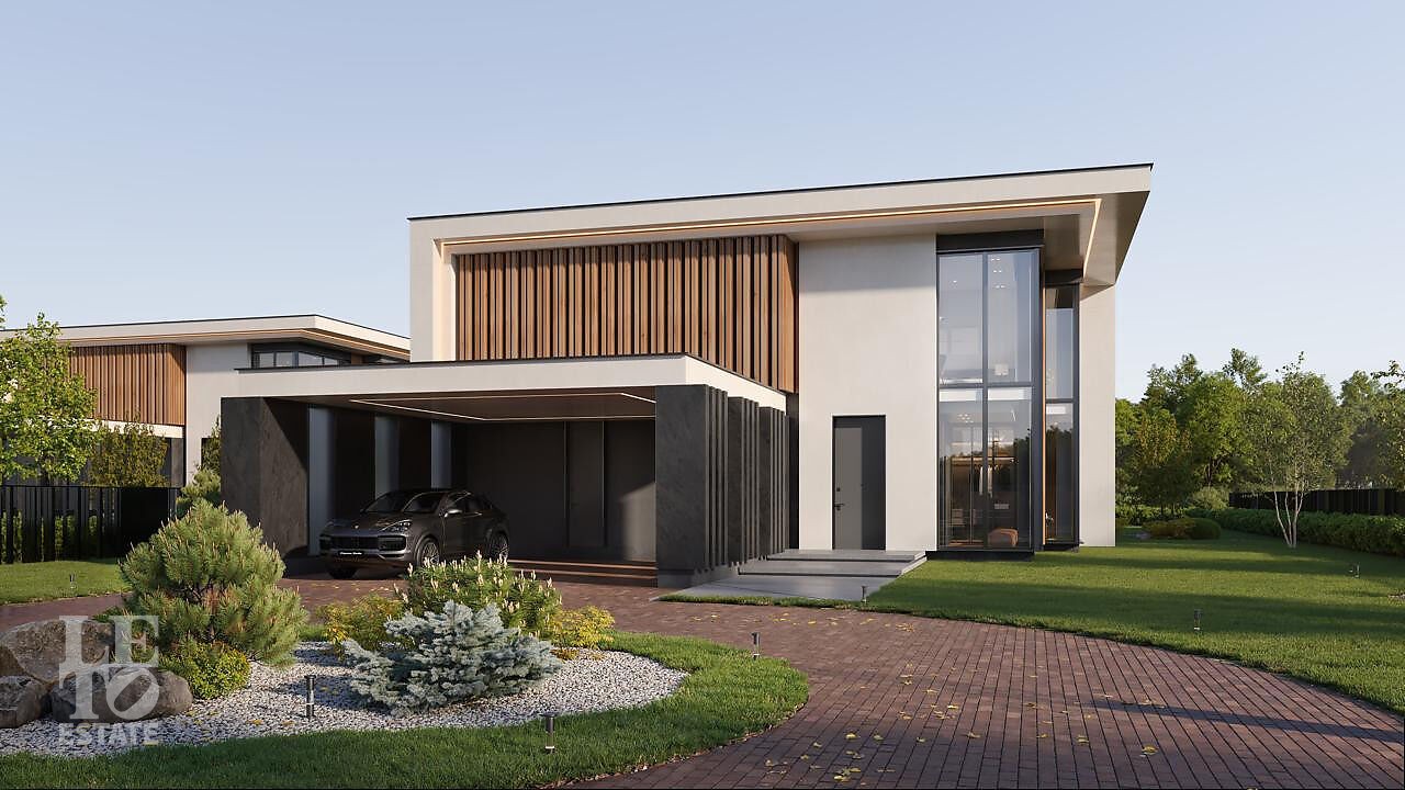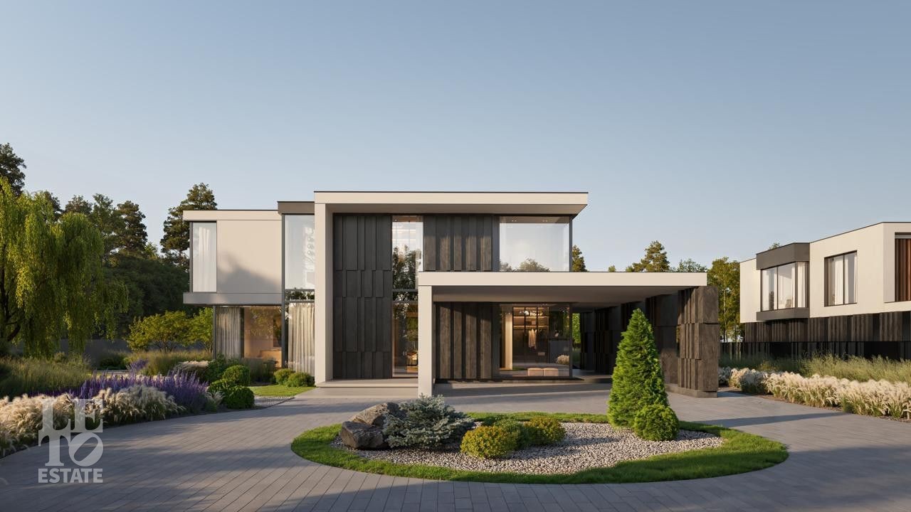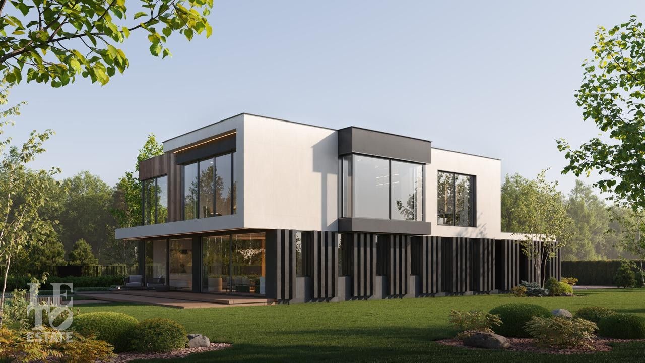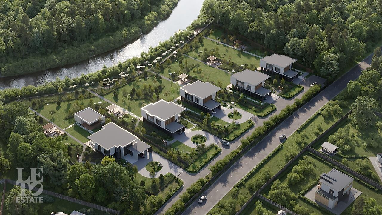 Здесь вас ждут четыре просторных дома площадью 380 кв.м. и одна флагманская вилла. Архитектура — современная европейская классика: панорамные окна, стирающие границу между просторным интерьером и природой, натуральные материалы и уютные террасы с видом на большой участок и реку.