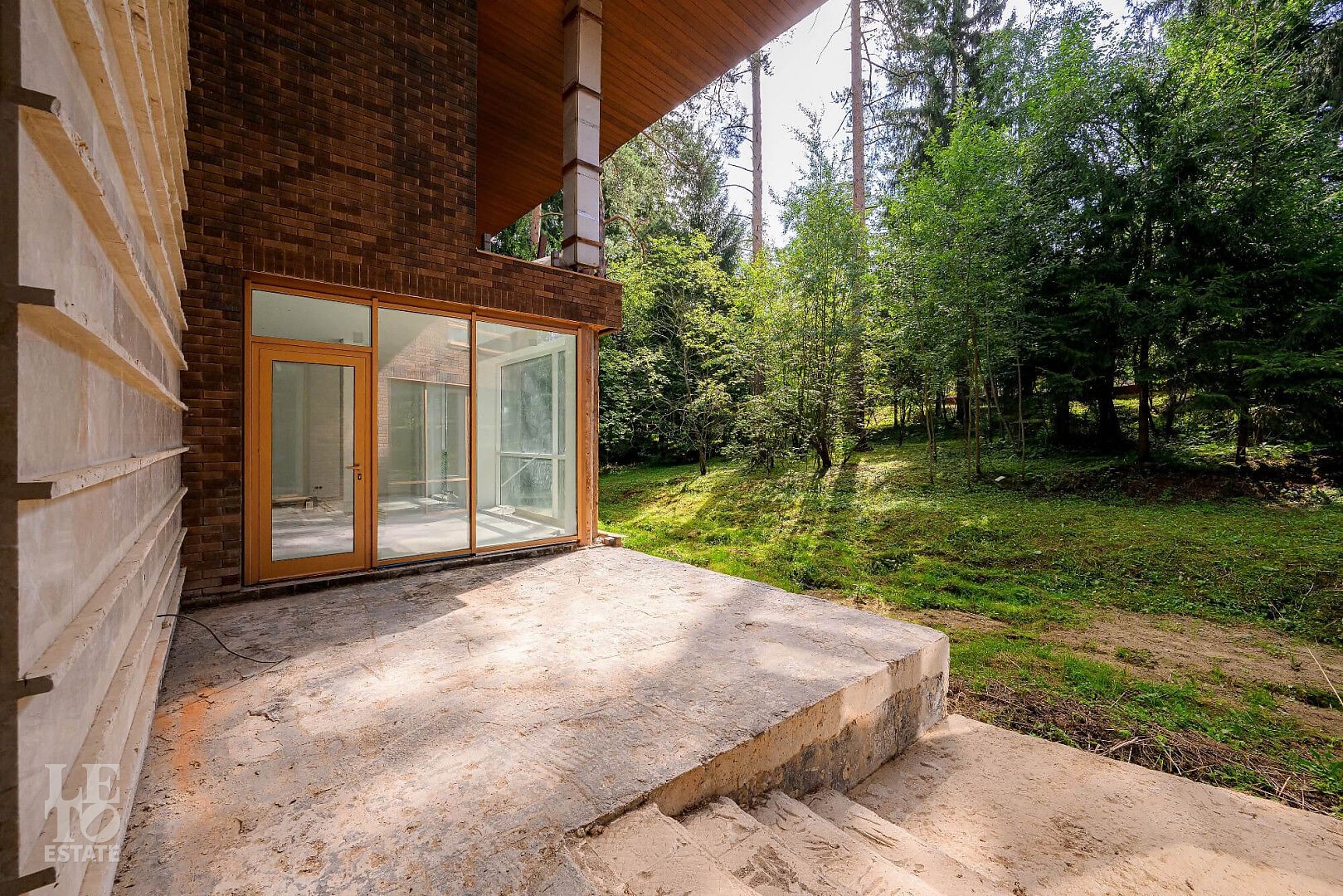Фасад дома отделан клинкерным кирпичом, мрамором и лиственницей. Фундамент и перекрытия выполнены из ж/б монолита, стены из кирпича. Крыша - мягкая черепица.