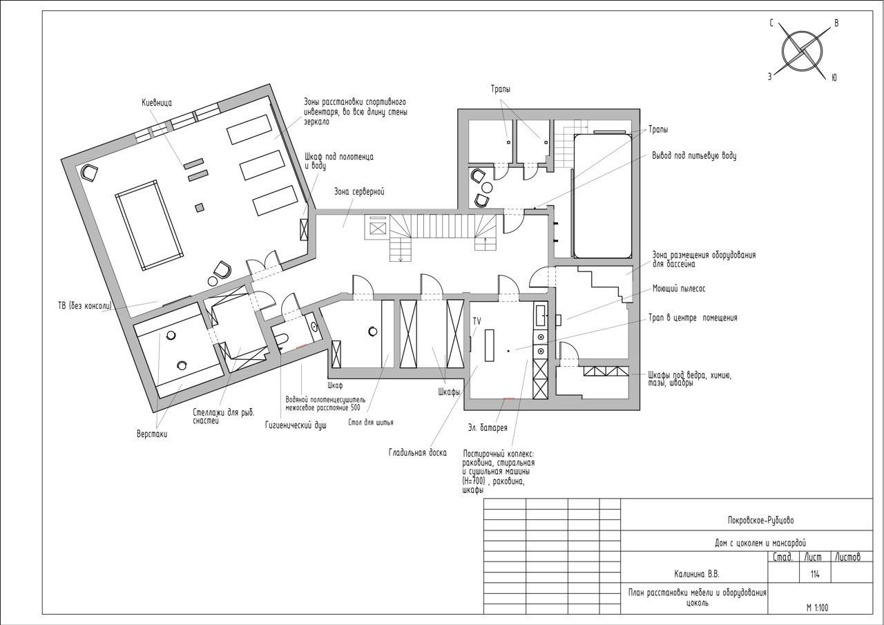 Цокольный этаж: зона размещения оборудования для бассейна, постирочная, бильярдная, санузел.
