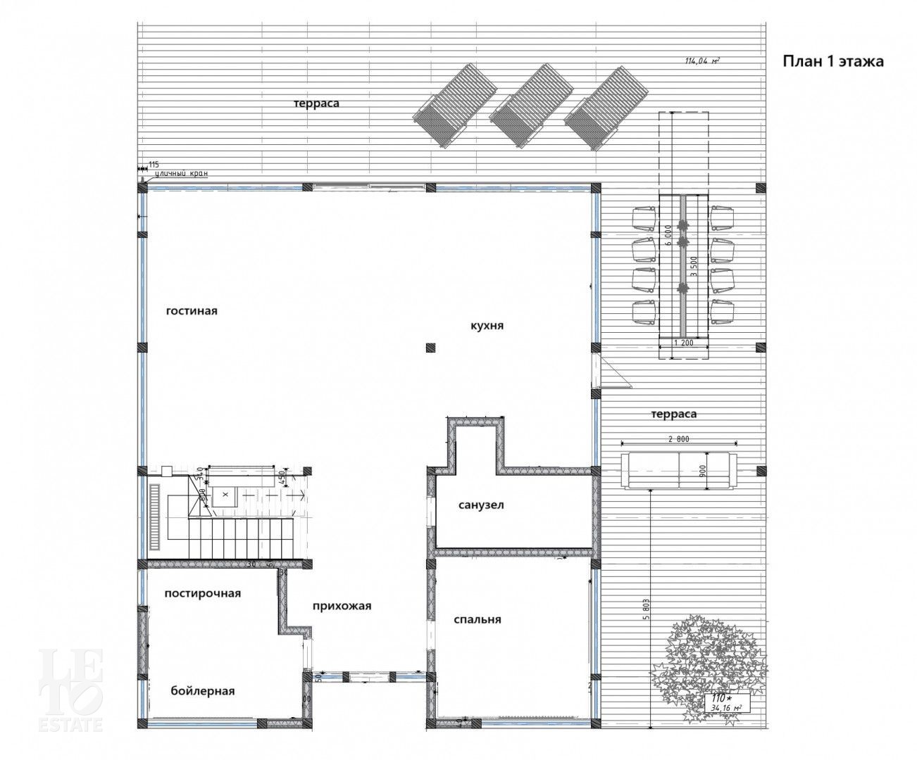 Первый этаж: прихожая, постирочная с бойлерной, гостиная, кухня-столовая, санузел с турецкой баней (хаммам), спальня;