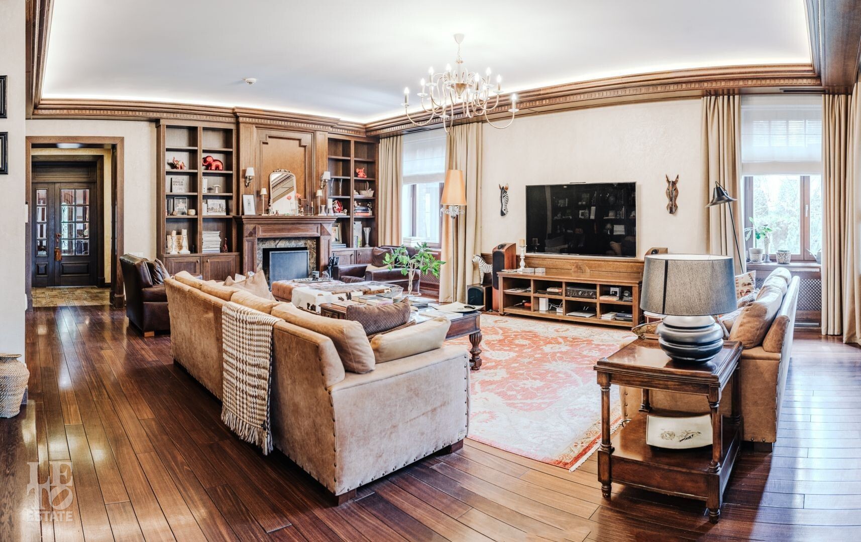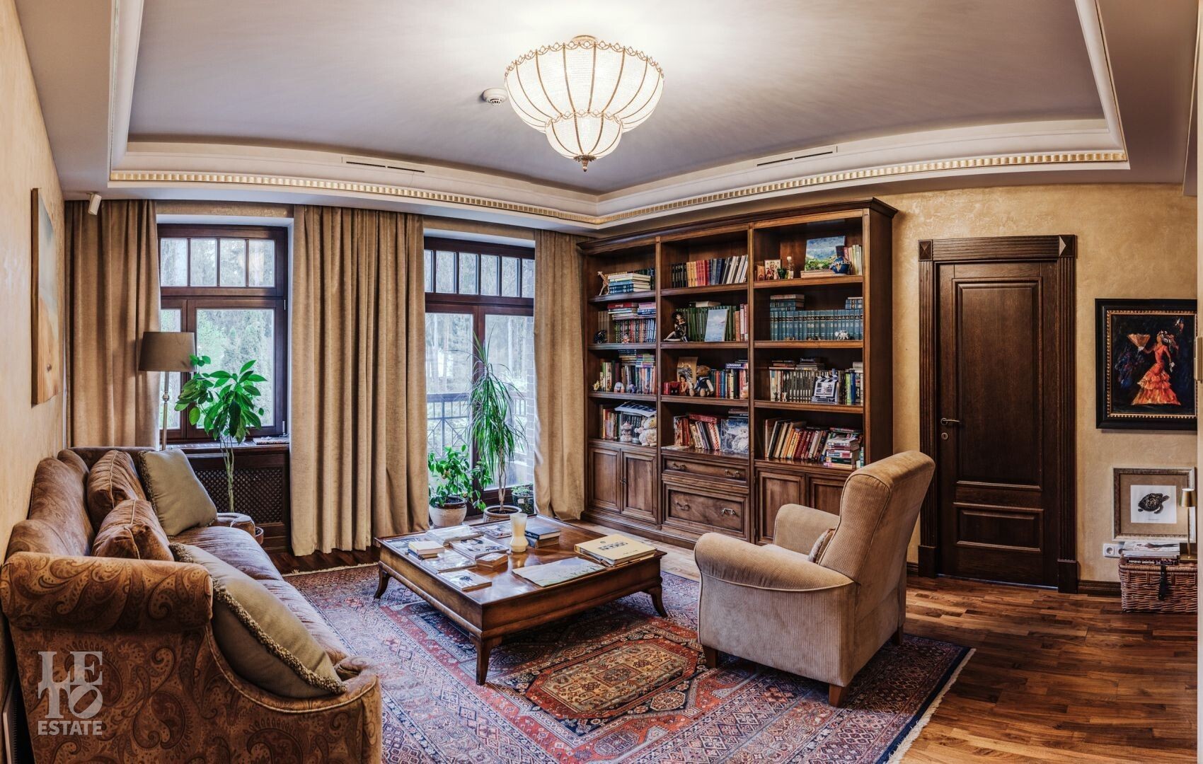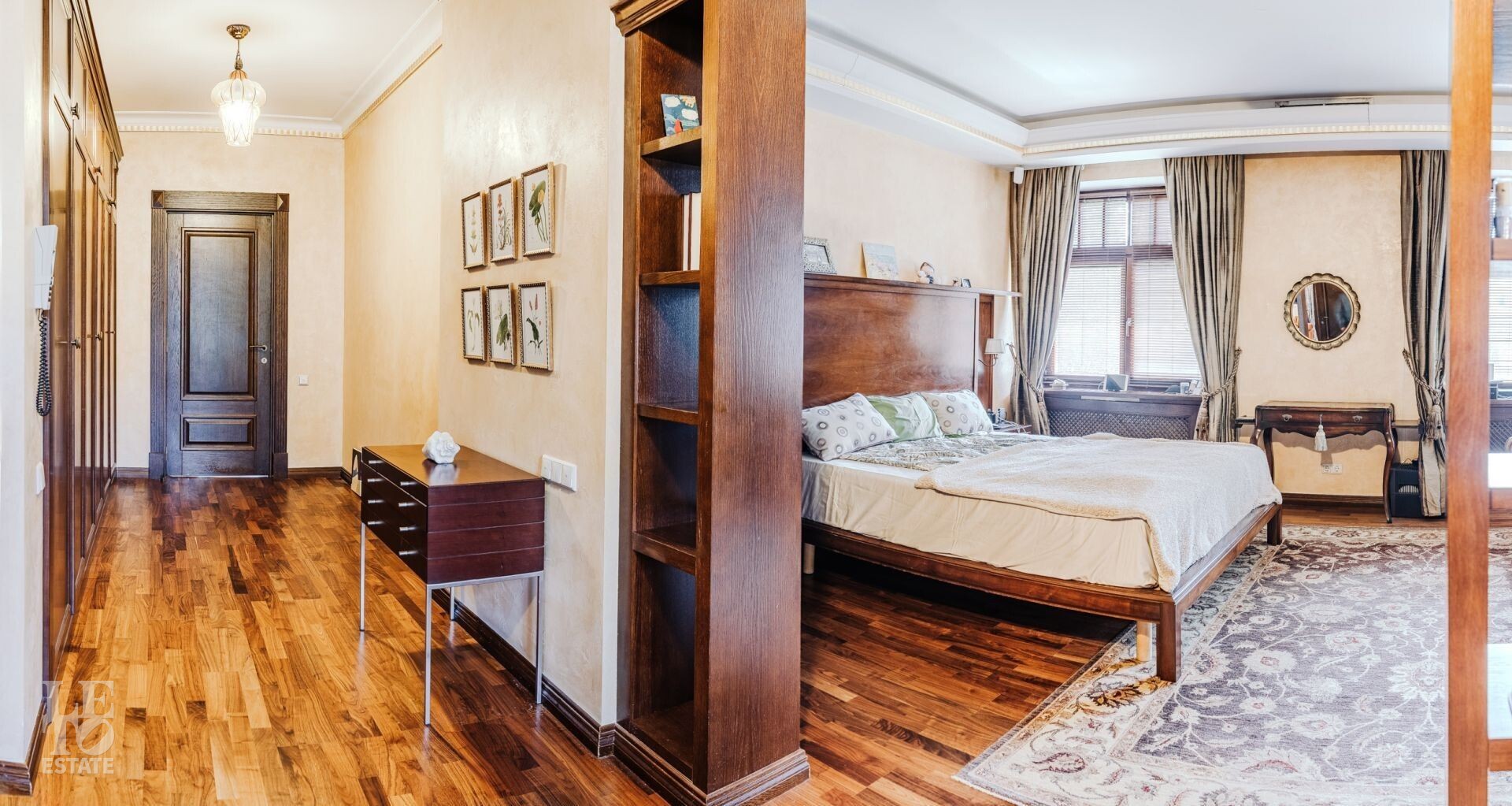 Второй этаж: мастер-спальня с будуаром с выходом на балкон, кабинетом, гардеробной, санузлом с душем и ванной, библиотека с выходом на балкон, спальня с санузлом и гардеробной, спальня с санузлом, гардеробной и выходом на балкон;