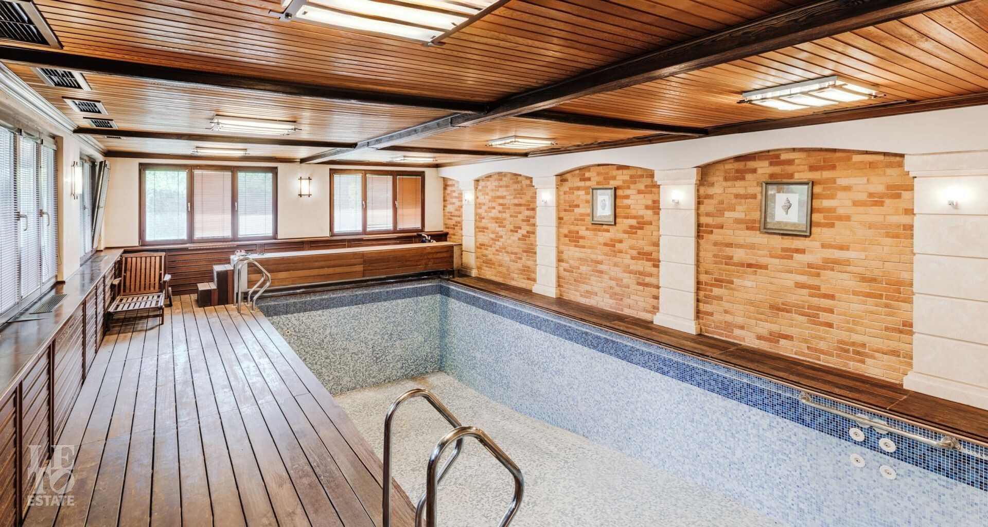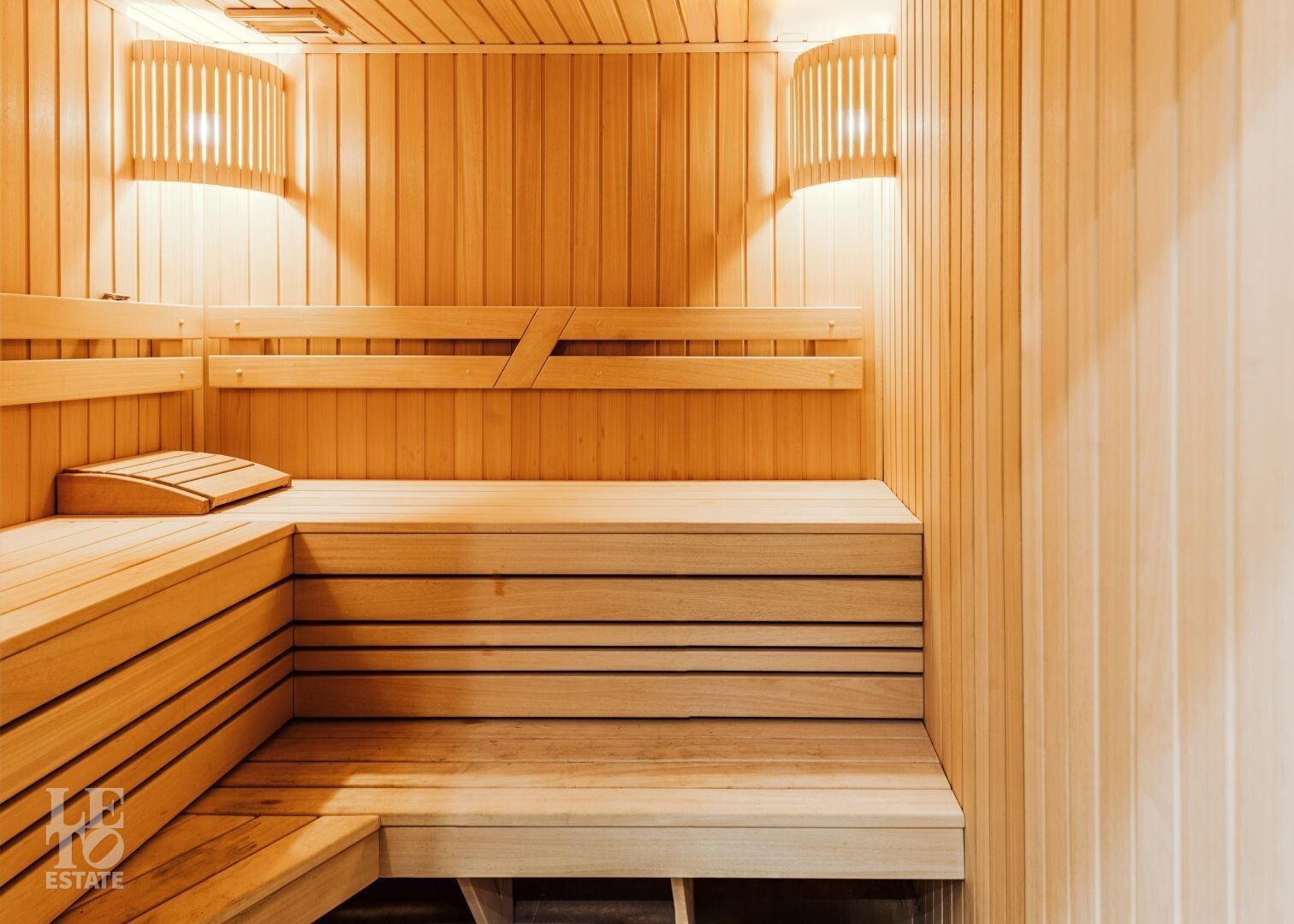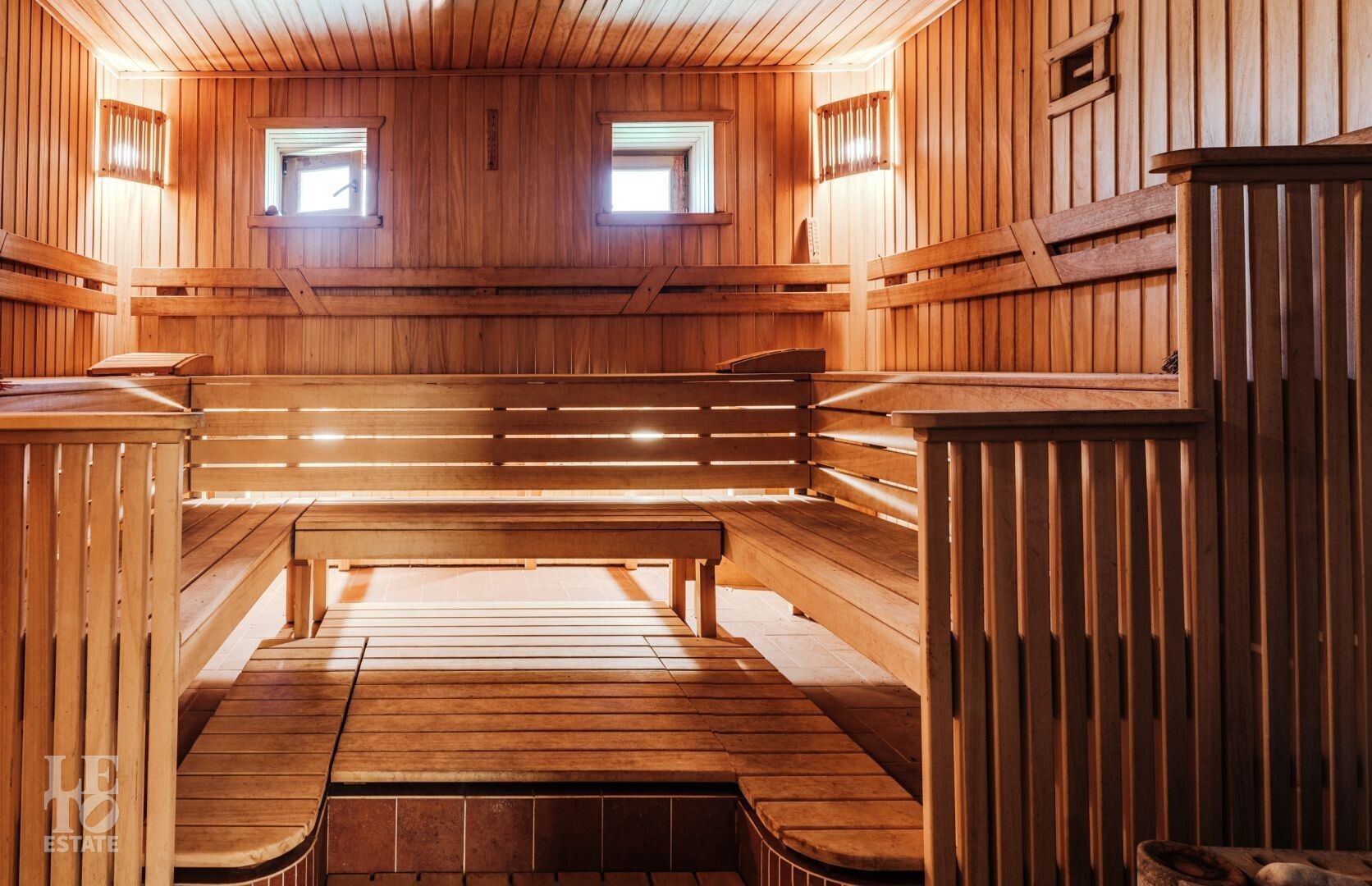 B приватной части участка расположен СПА-комплекс, включающий в себя бассейн, просторную парную, купель с душевыми, зону отдыха и полноценную кухню. Во внутренней отделке СПА-зоны использованы натуральное дерево и керамическая мозаика. Также на участке находится гостевой дом, планировки которого включают в себя: прихожую, гостиную- столовую с возможностью оборудовать кухню, санузел с душем, спальню, два оружейных сейфа и генераторную комнату с отдельным входом.