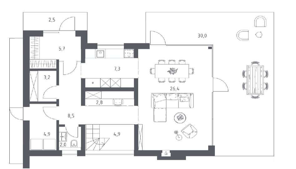 Первый этаж: прихожая, кухня-гостиная, холл с рабочей зоной, котельная, санузел, терраса.