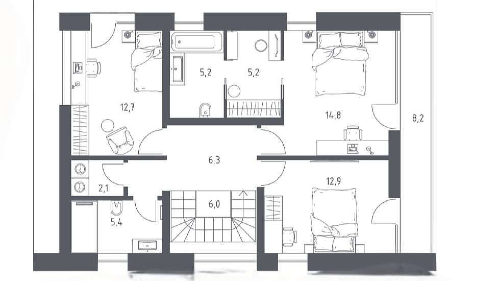 Второй этаж: мастер-спальня с гардеробной и ванной комнатой, две спальни, ванная комната, балкон.