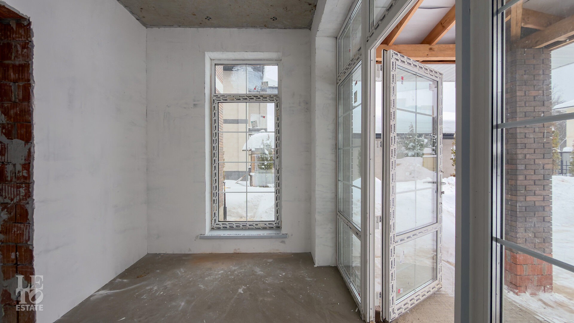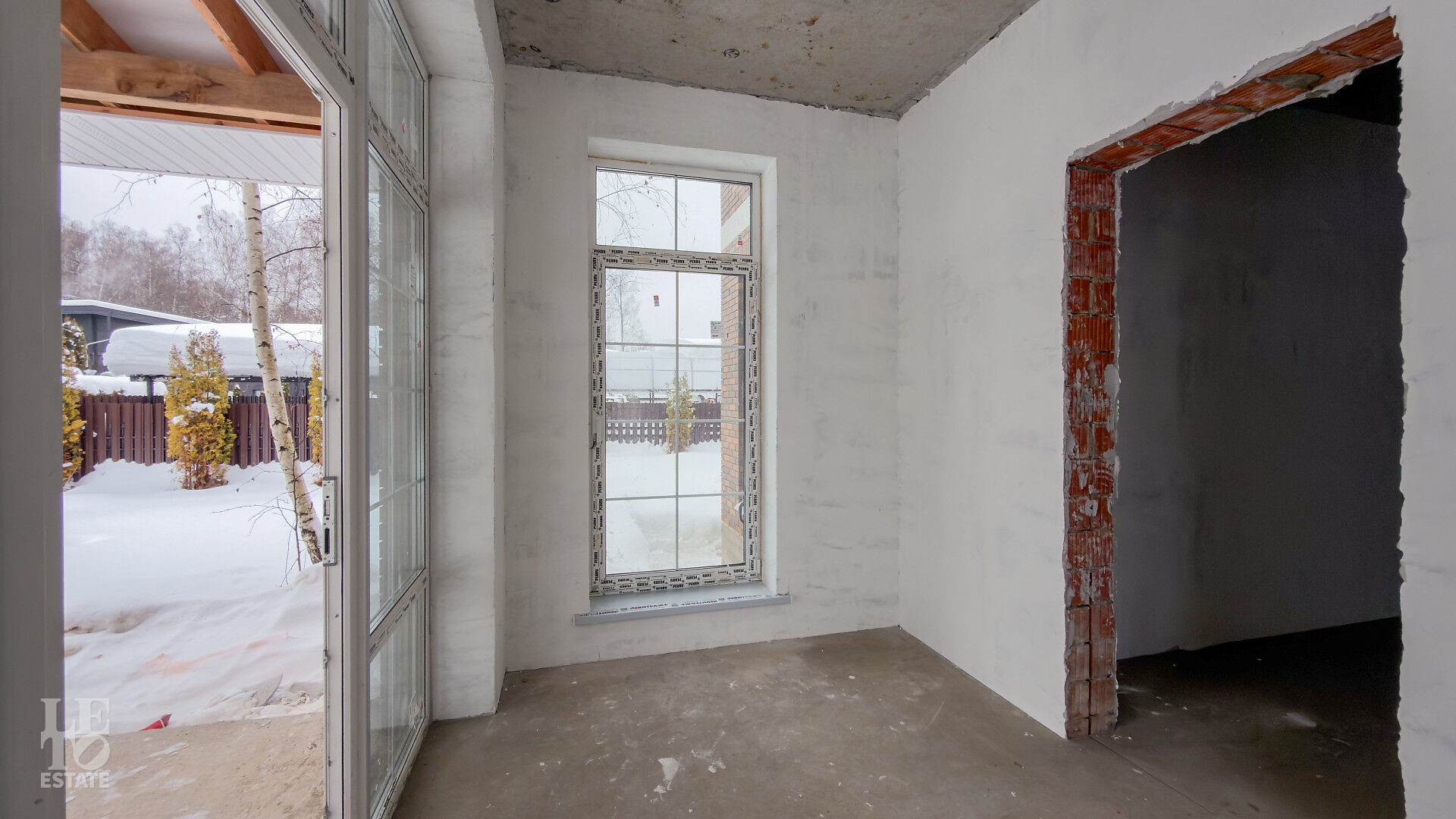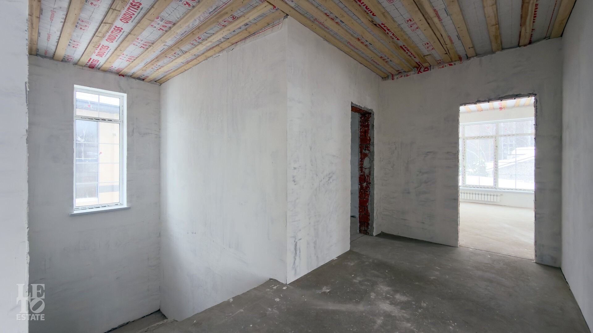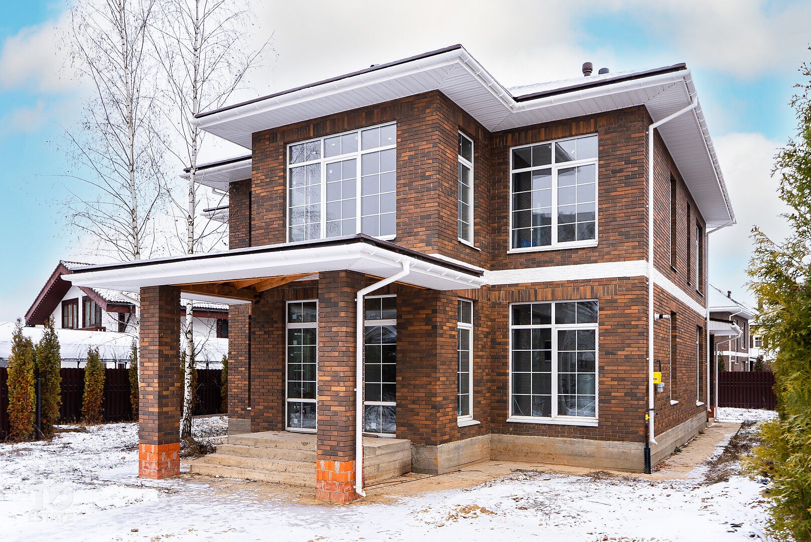 Дом построен из кирпича. Выполнена внутренняя отделка "White Box" - выровнены и отштукатурены стены под финишное покрытие. Установлены панорамные окна Rehau.