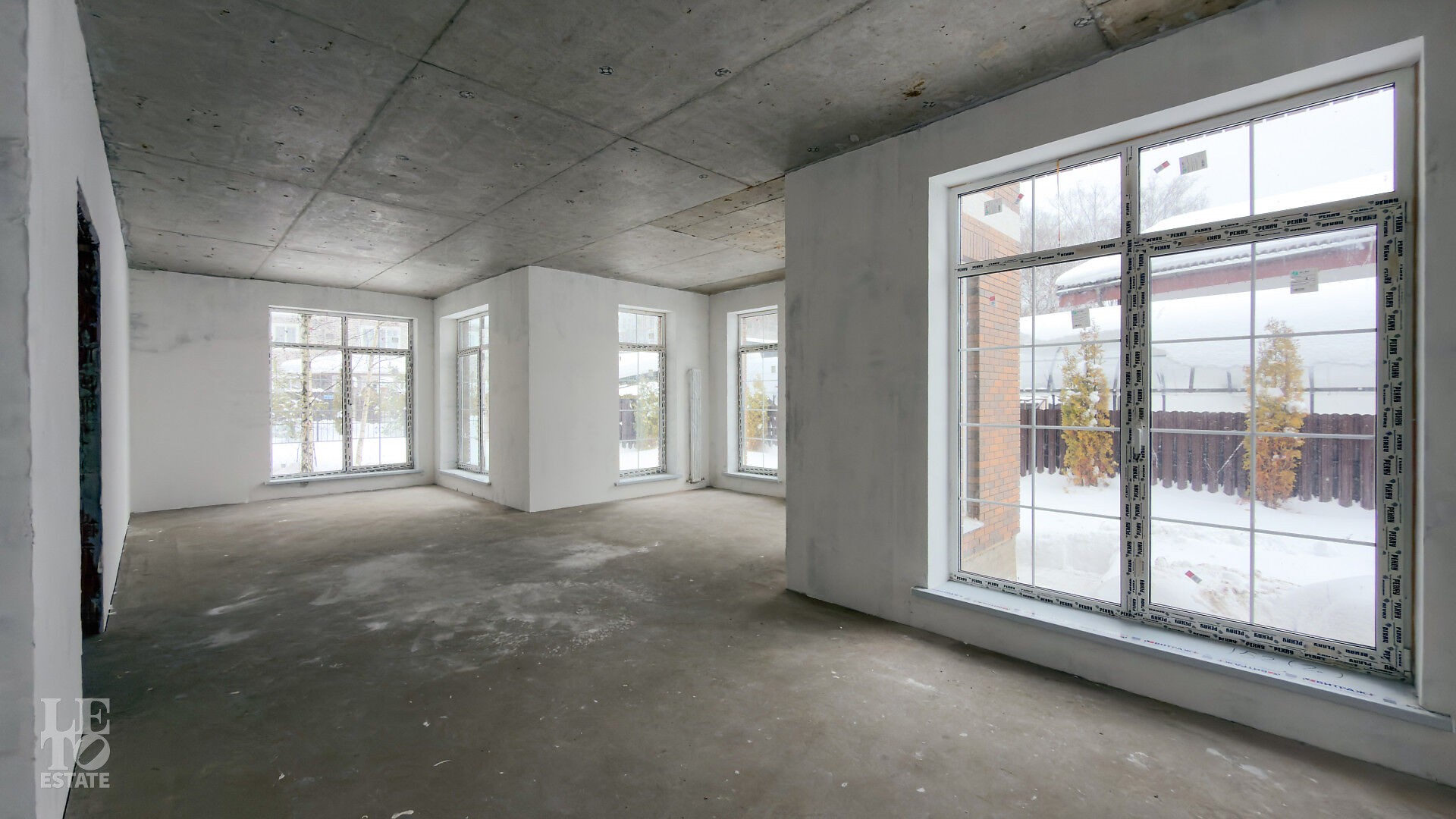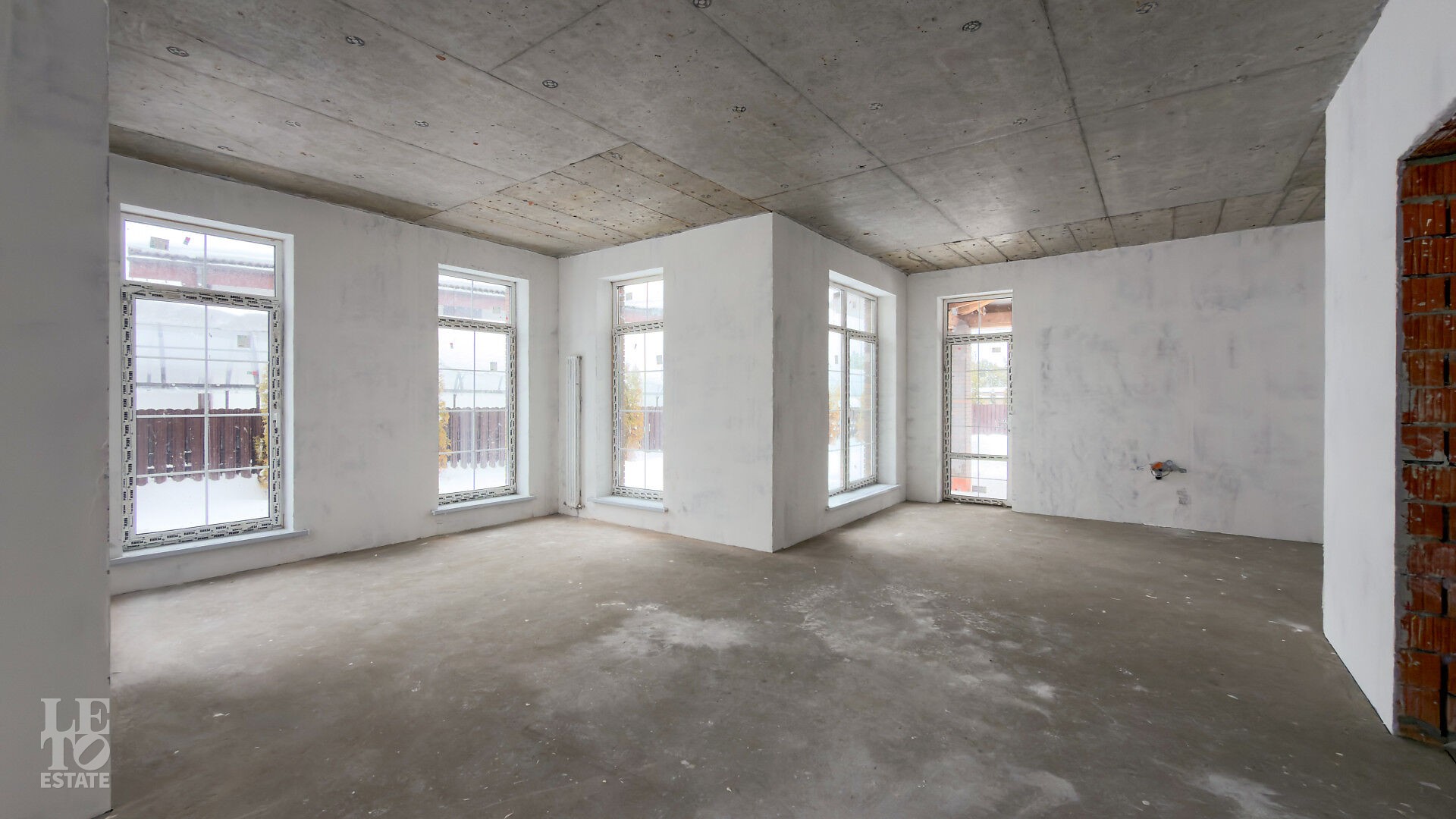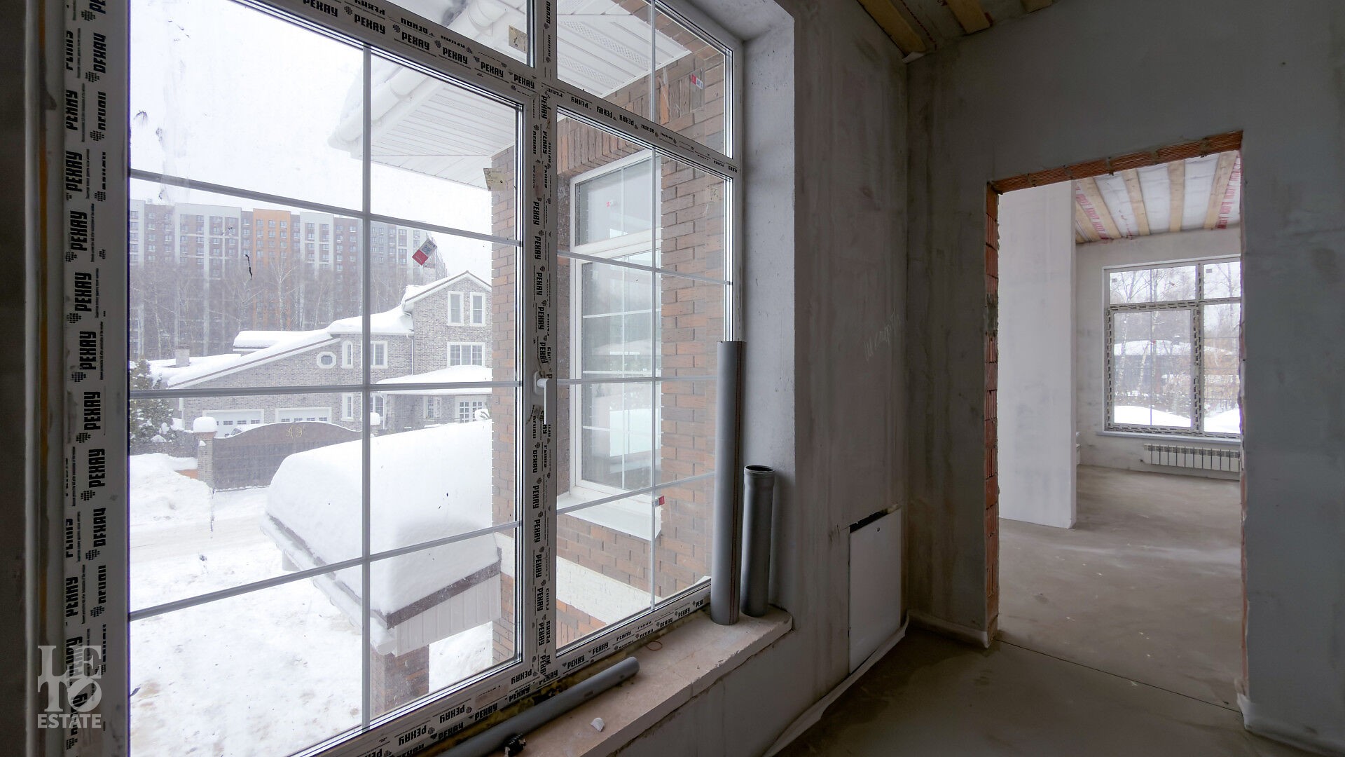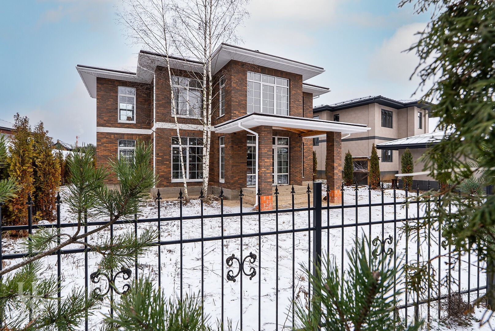 Дом построен из кирпича. Выполнена внутренняя отделка "White Box" - выровнены и отштукатурены стены под финишное покрытие. Установлены панорамные окна Rehau.