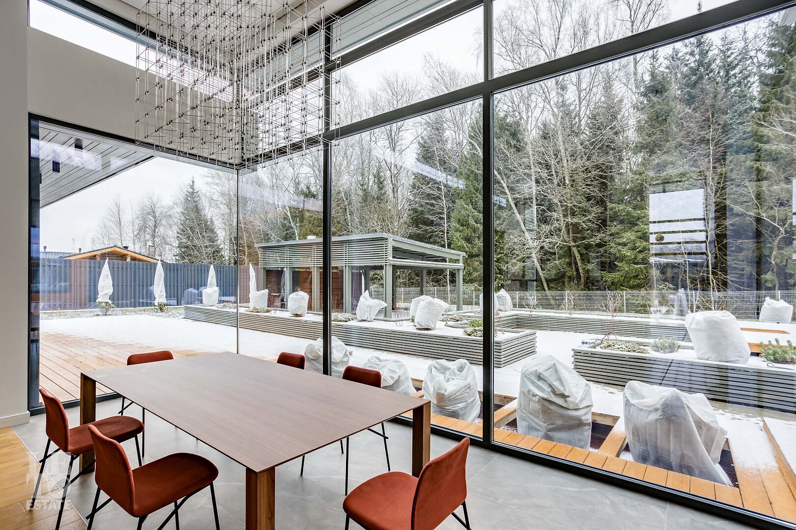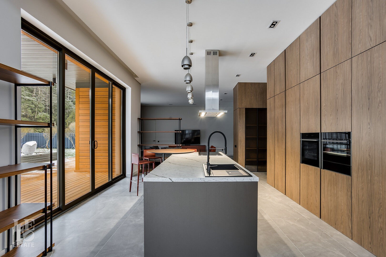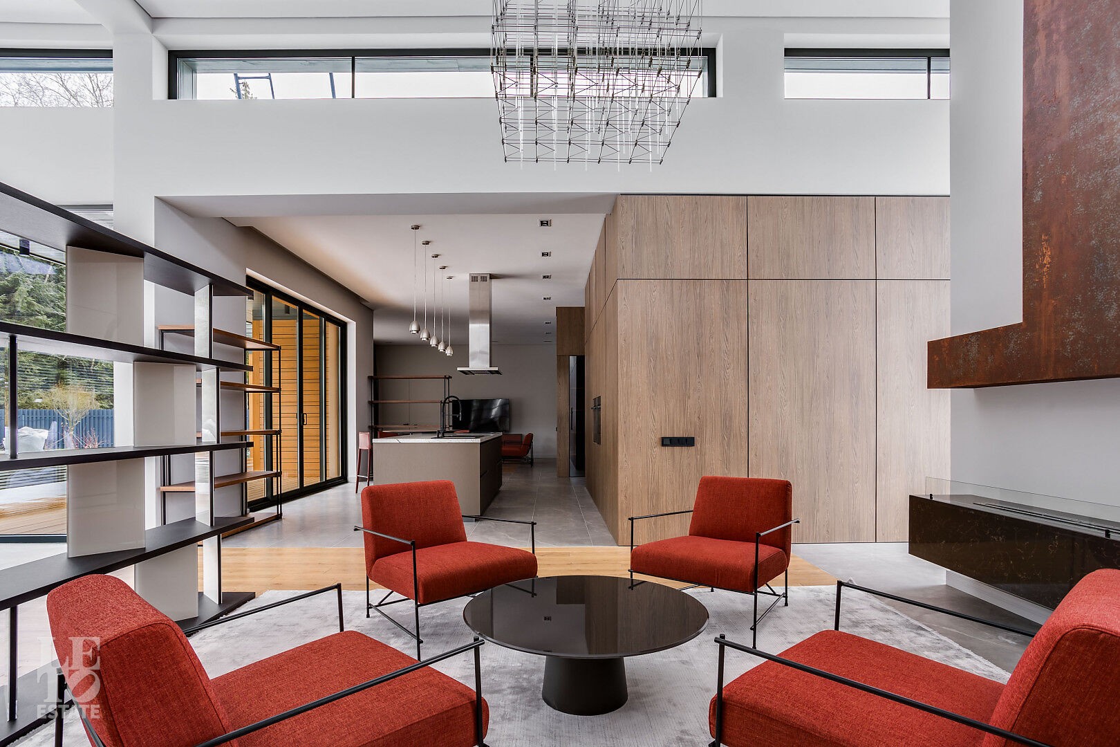 Гостиная‑столовая с панорамным остеклением, биокамином длиной 3 м, диваном, журнальным столиком, обеденной группой и зоной отдыха с диваном Bo Concept.
