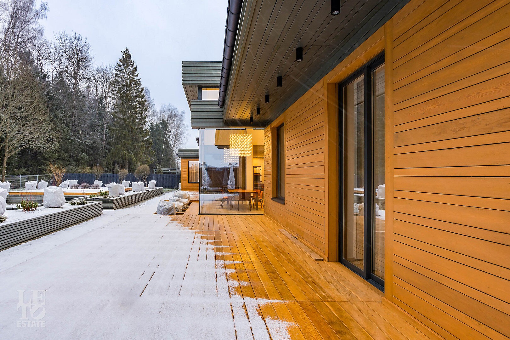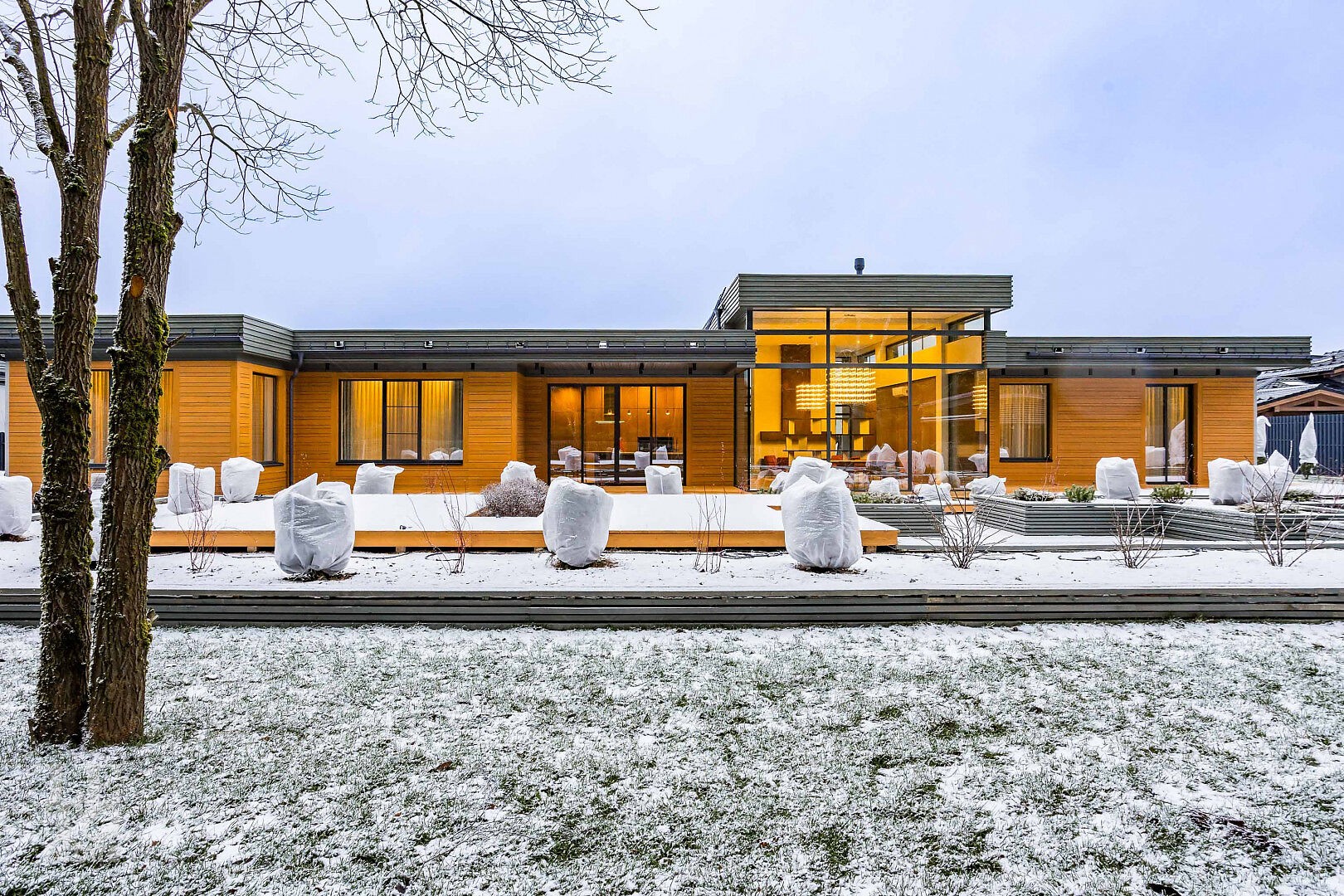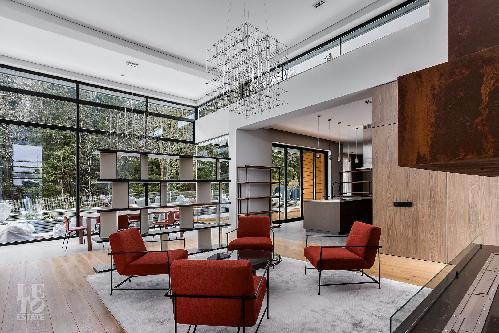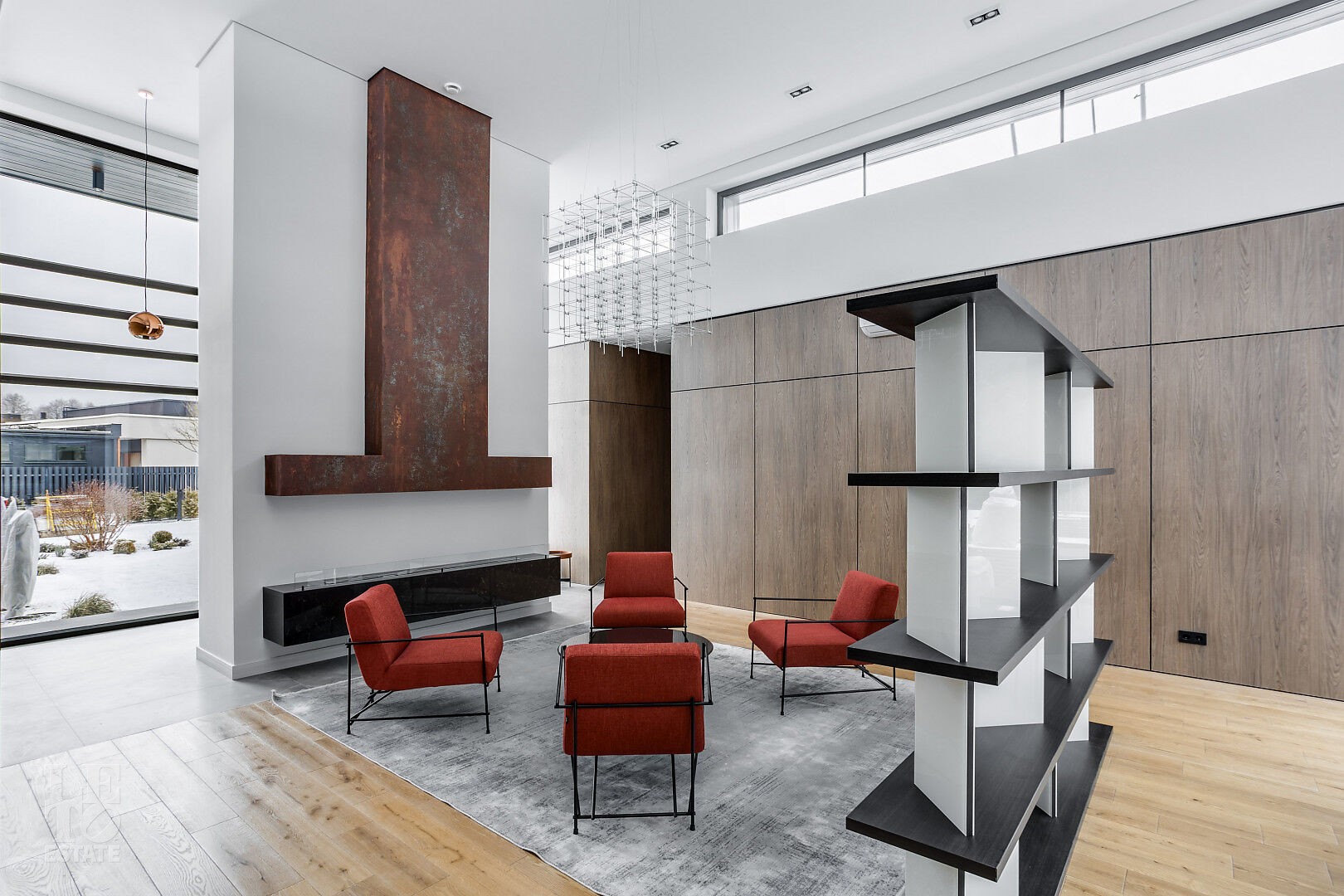 Гостиная‑столовая с панорамным остеклением, биокамином длиной 3 м, диваном, журнальным столиком, обеденной группой и зоной отдыха с диваном Bo Concept.