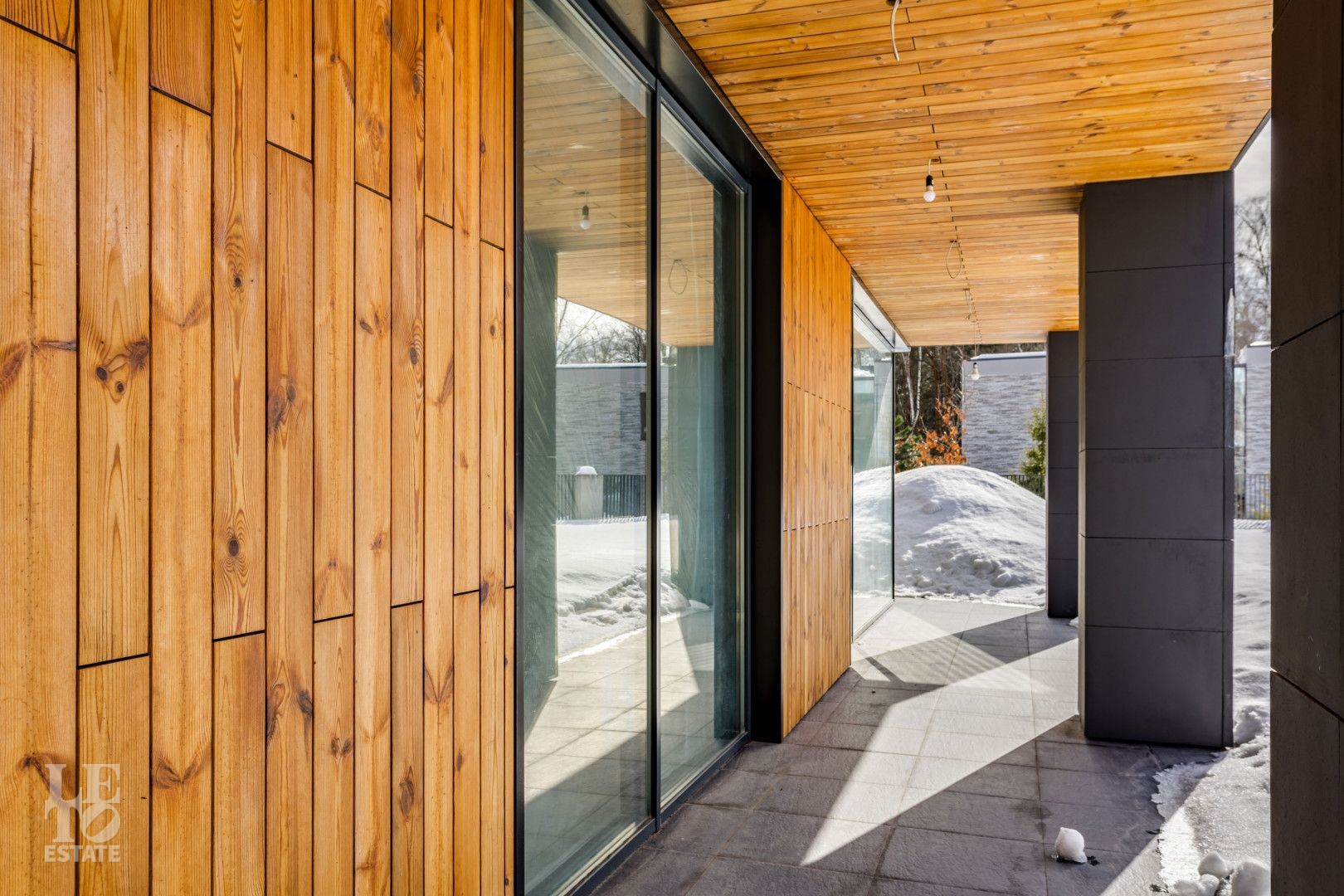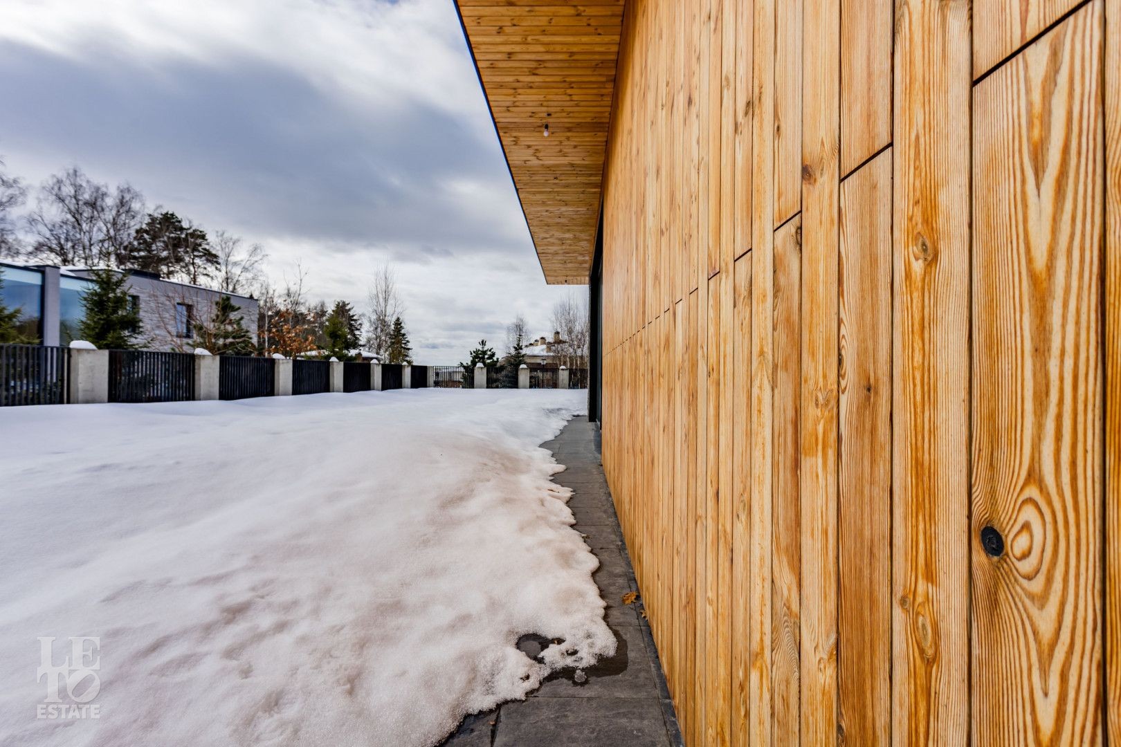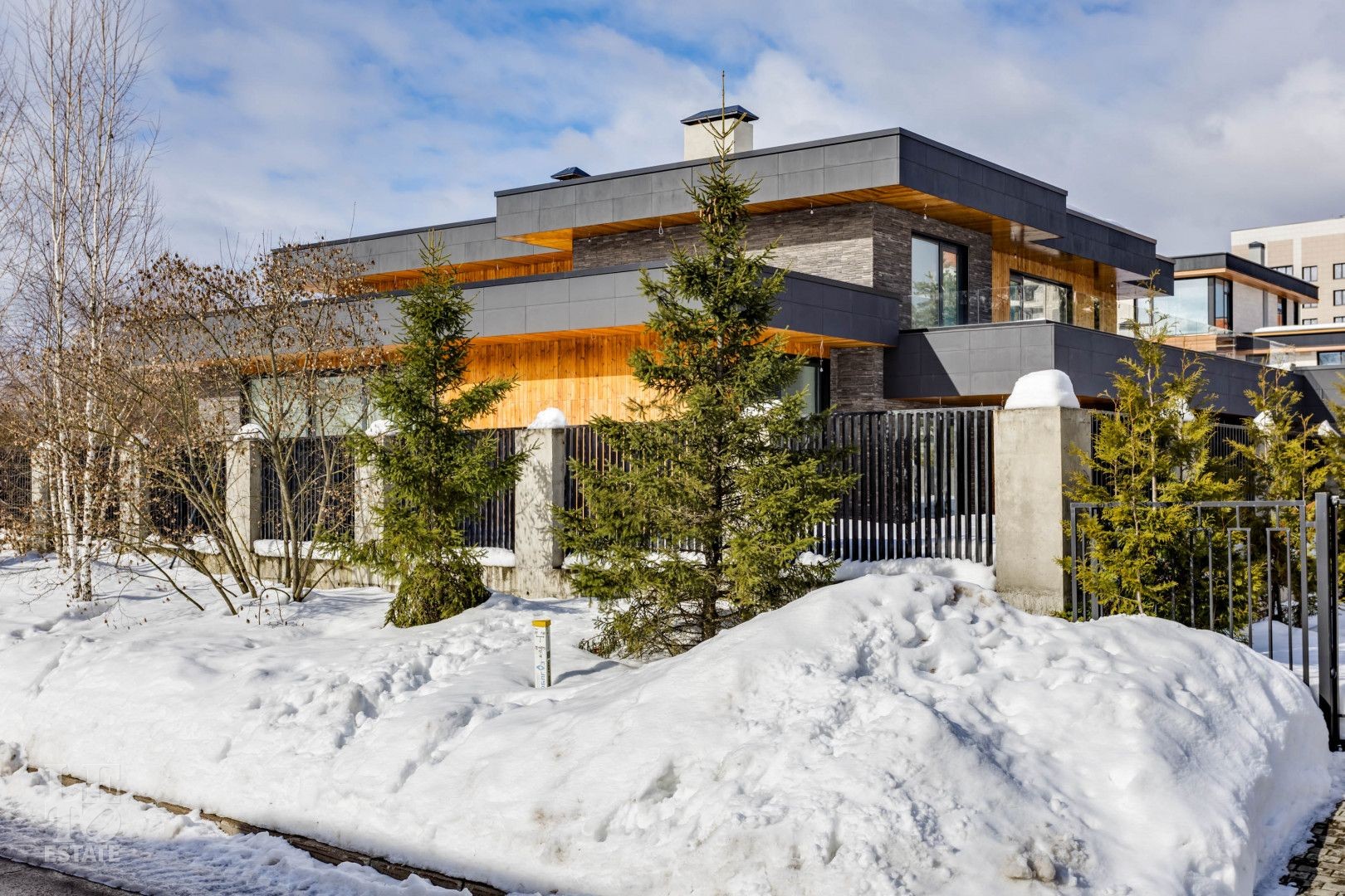 Просторный участок площадью 25 соток с хвойными и лиственными деревьями позволяет воплотить любые ландшафтные задумки. Современный многоуровневый фасад с отделкой из дерева, камня и темных панелей гармонично вписан в природное окружение. На придомовой территории уже выполнены дорожки и установлено декоративное ограждение с воротами. Развитая инфраструктура поселка и его близость к столице делают это место идеальным для постоянного проживания.