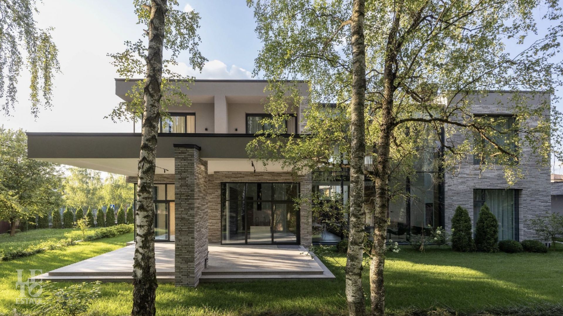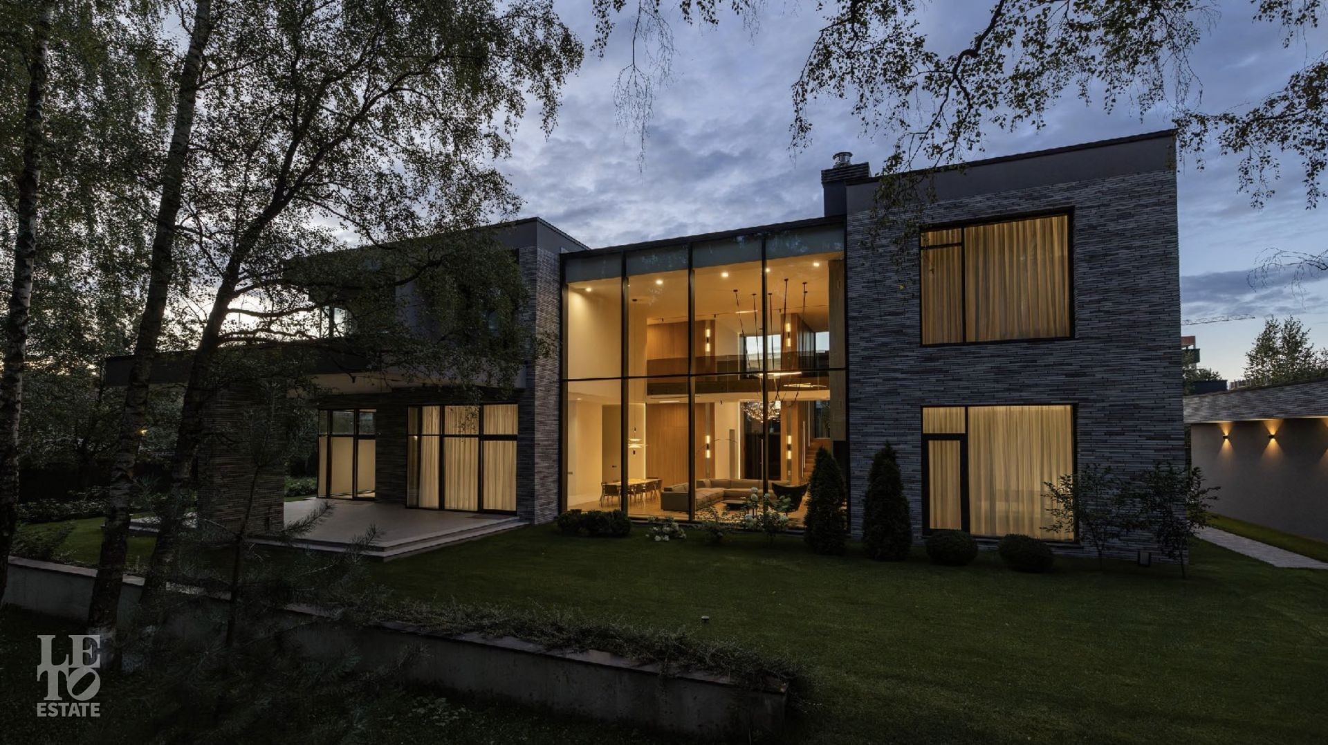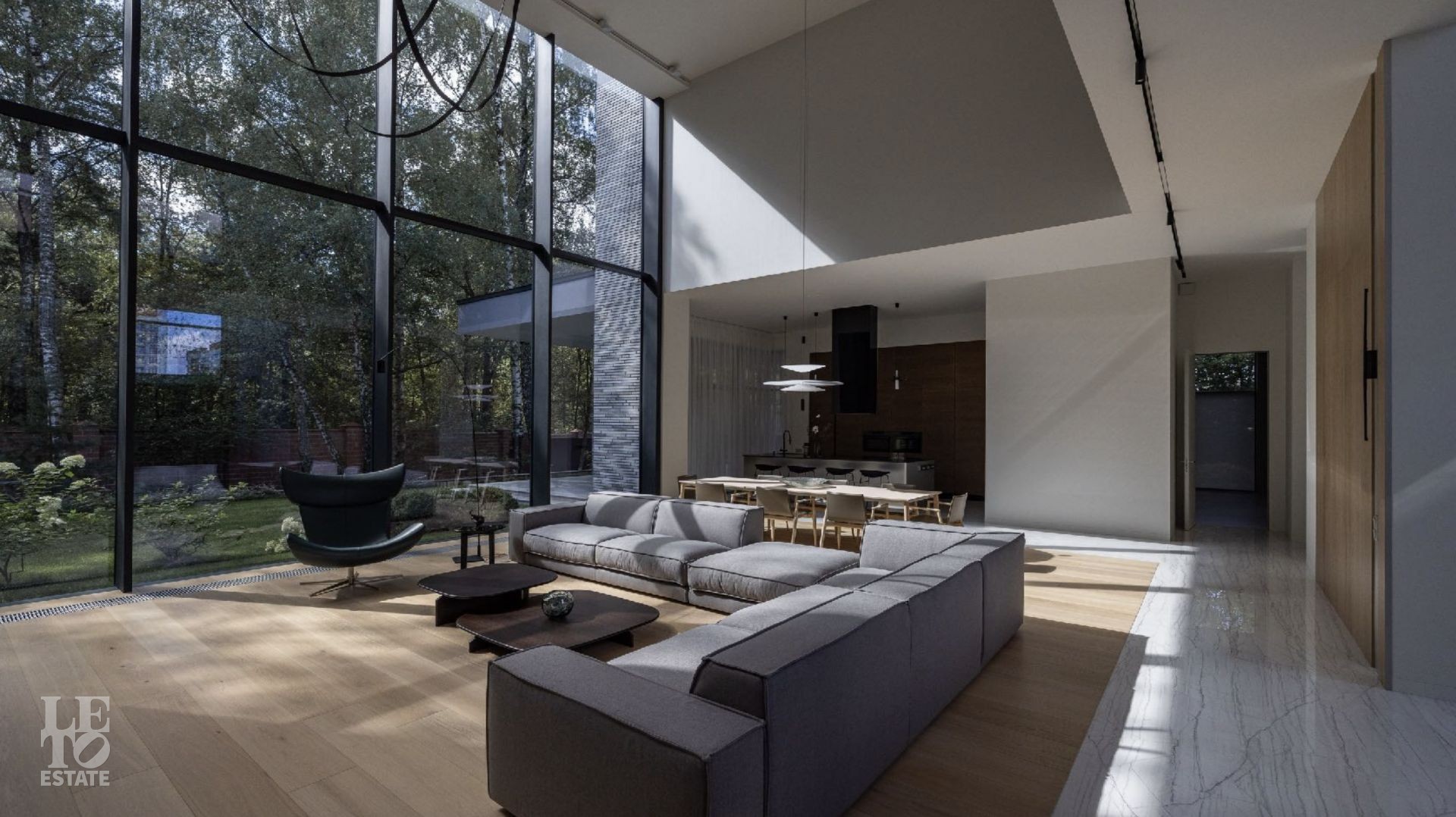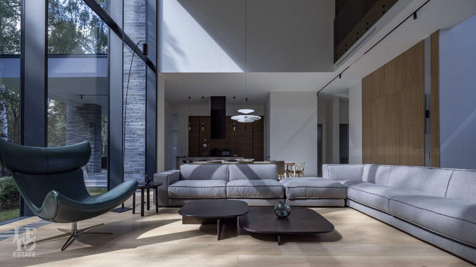 Дом 586 кв метров с панорамным остеклением и вторым светом располагается на участке 21 сотка, который примыкает к лесу.