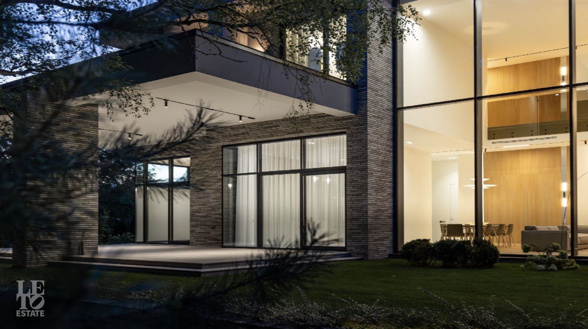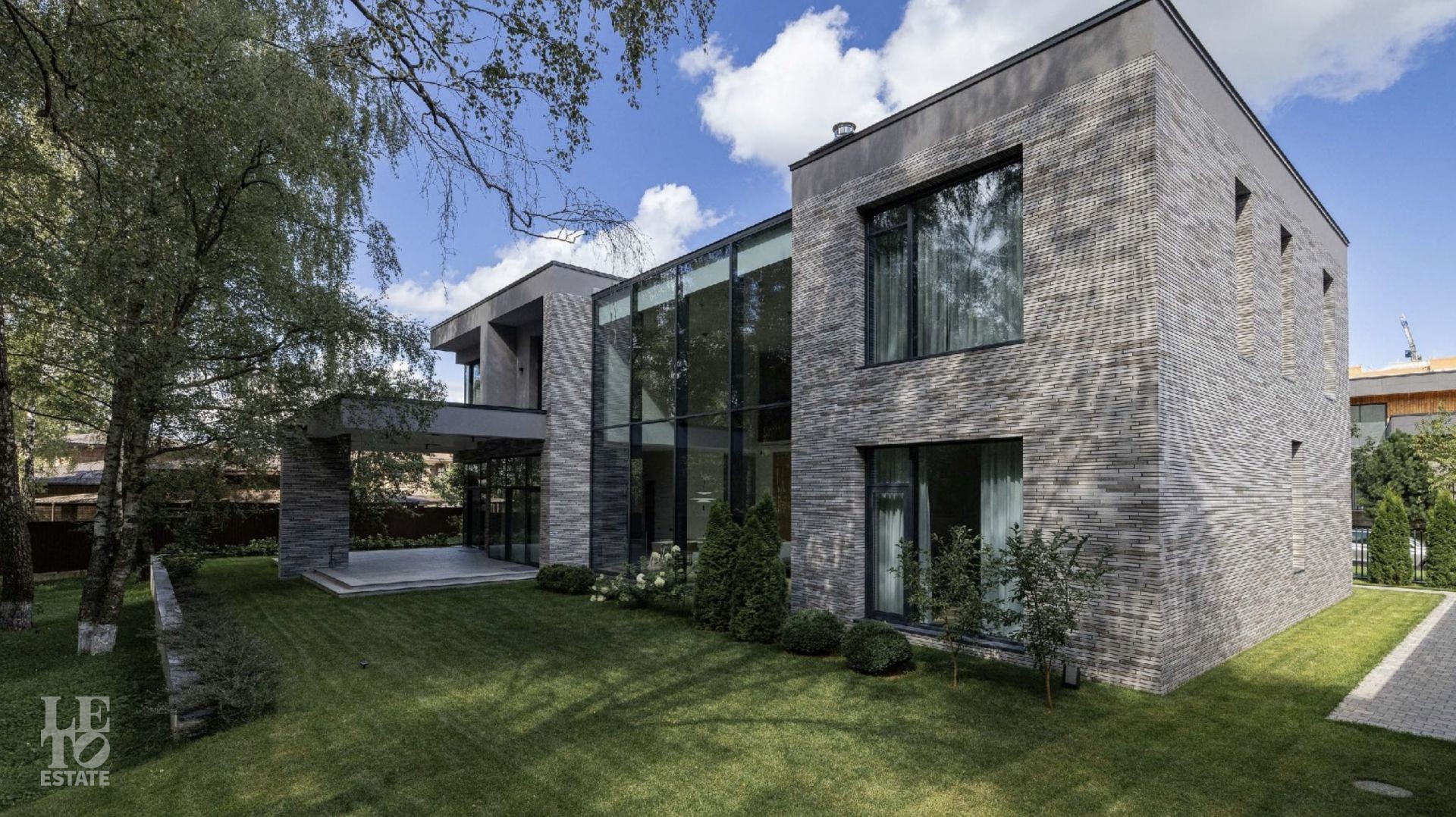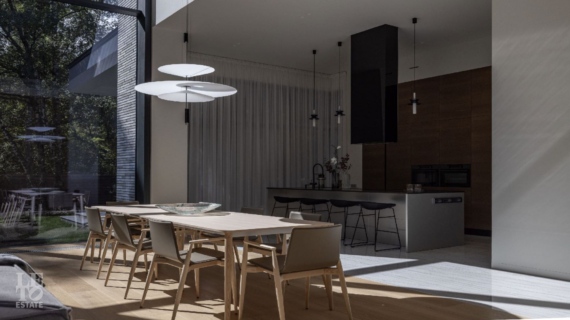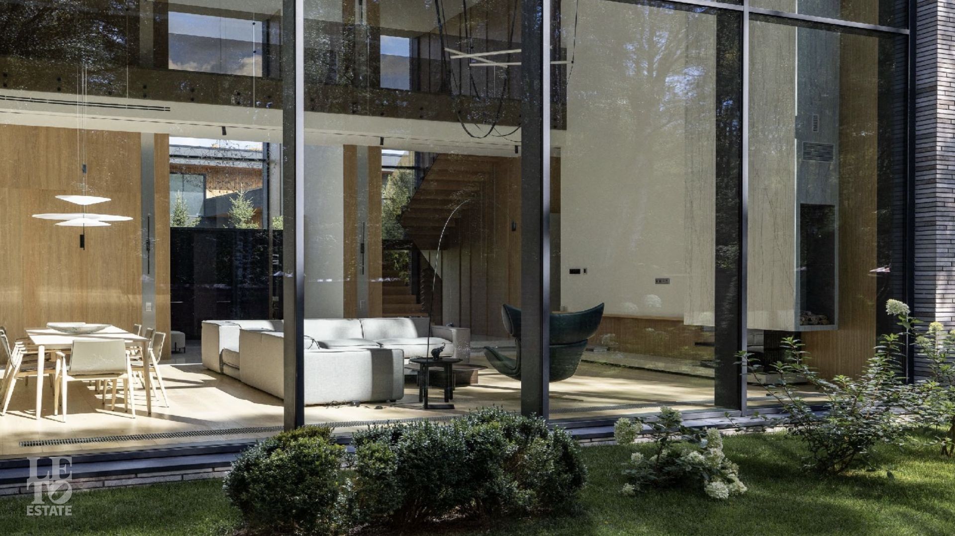 Дом 586 кв метров с панорамным остеклением и вторым светом располагается на участке 21 сотка, который примыкает к лесу.
