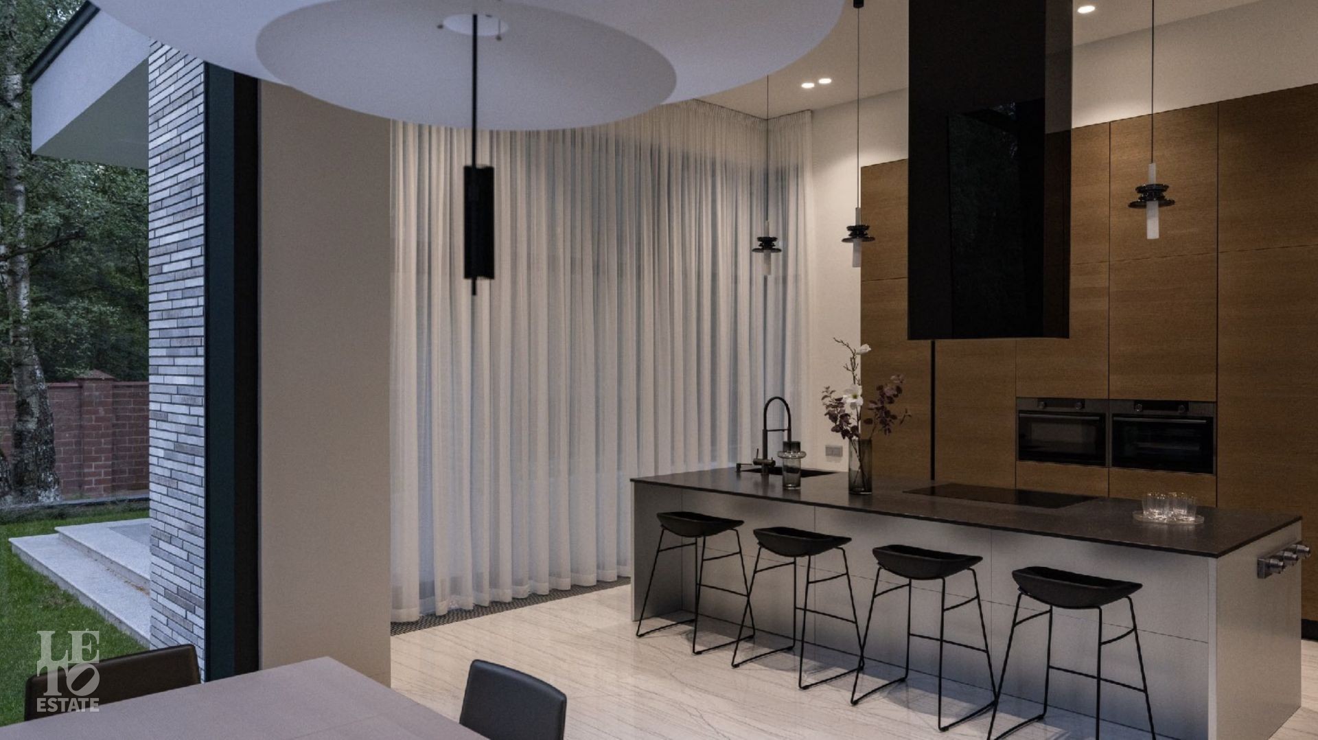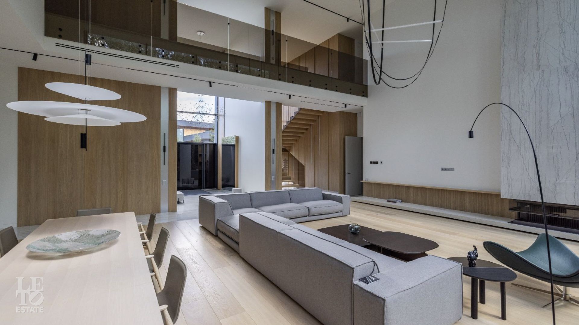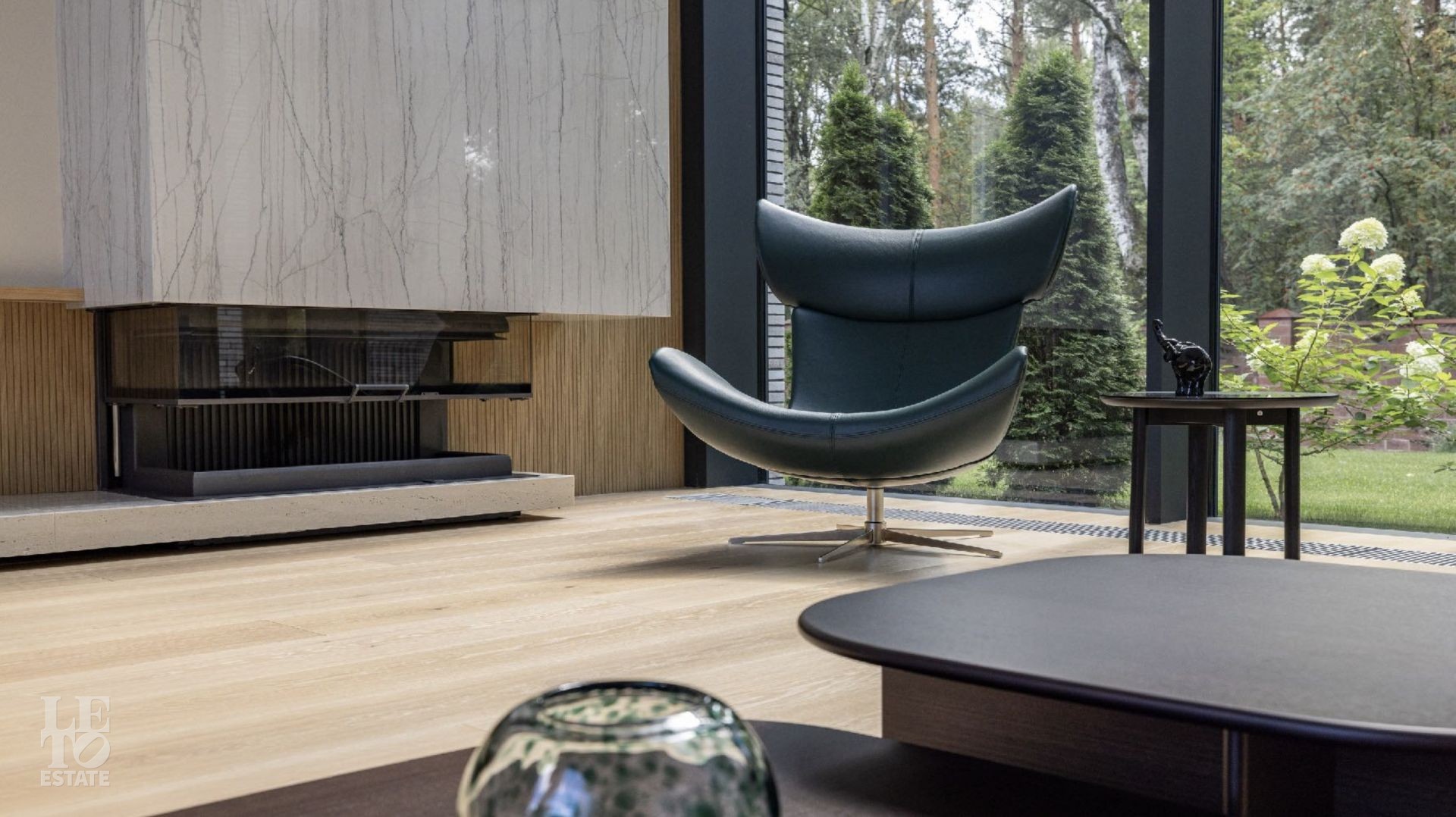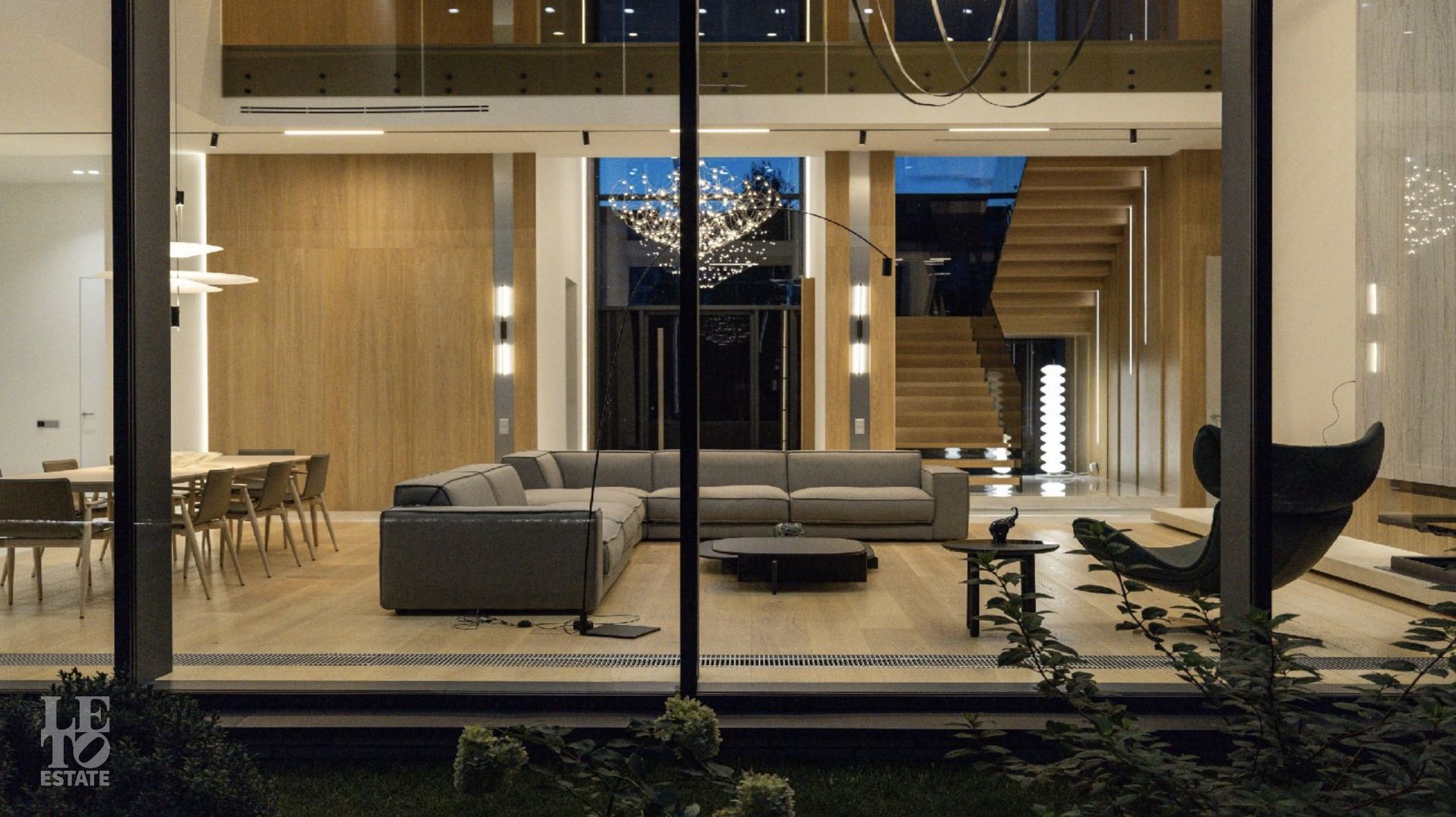 Дом 586 кв метров с панорамным остеклением и вторым светом располагается на участке 21 сотка, который примыкает к лесу.
