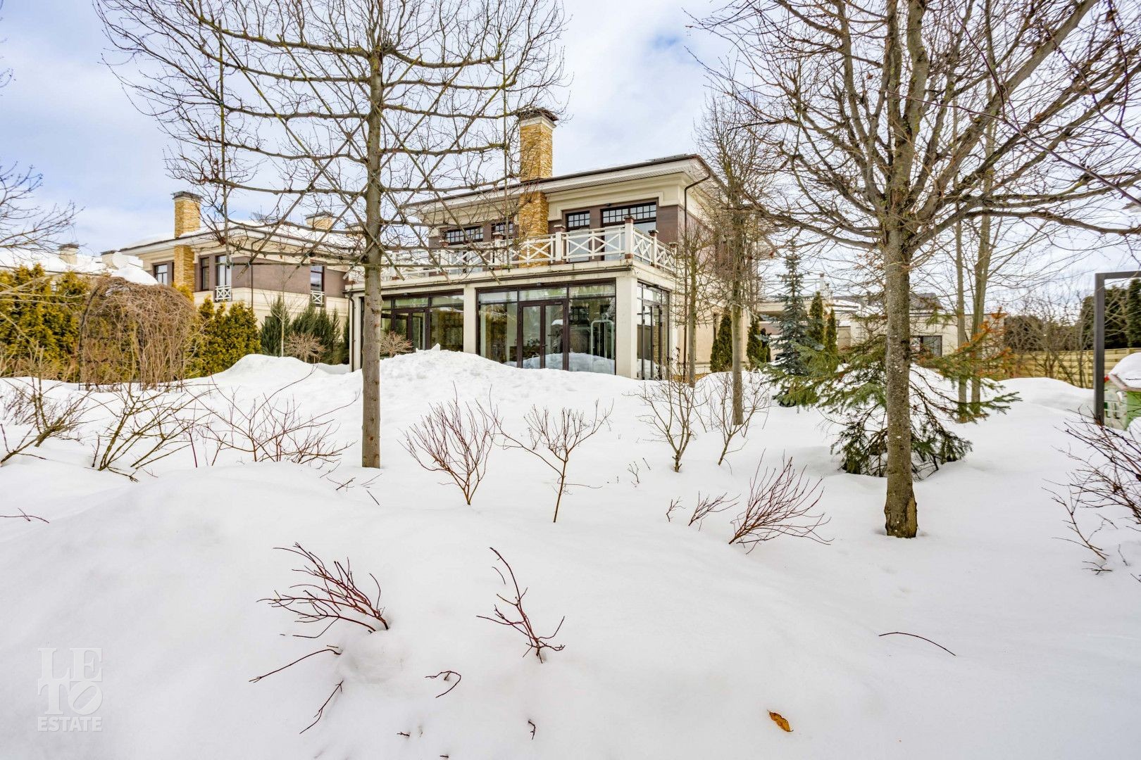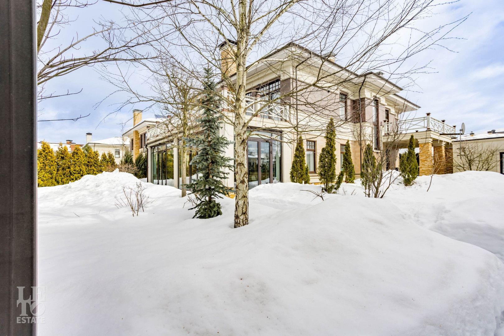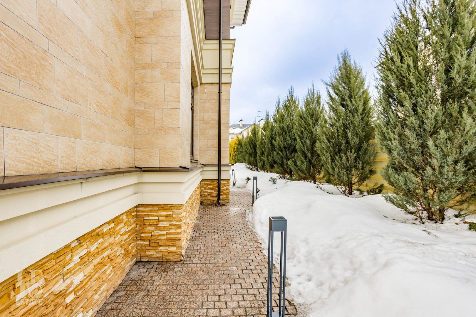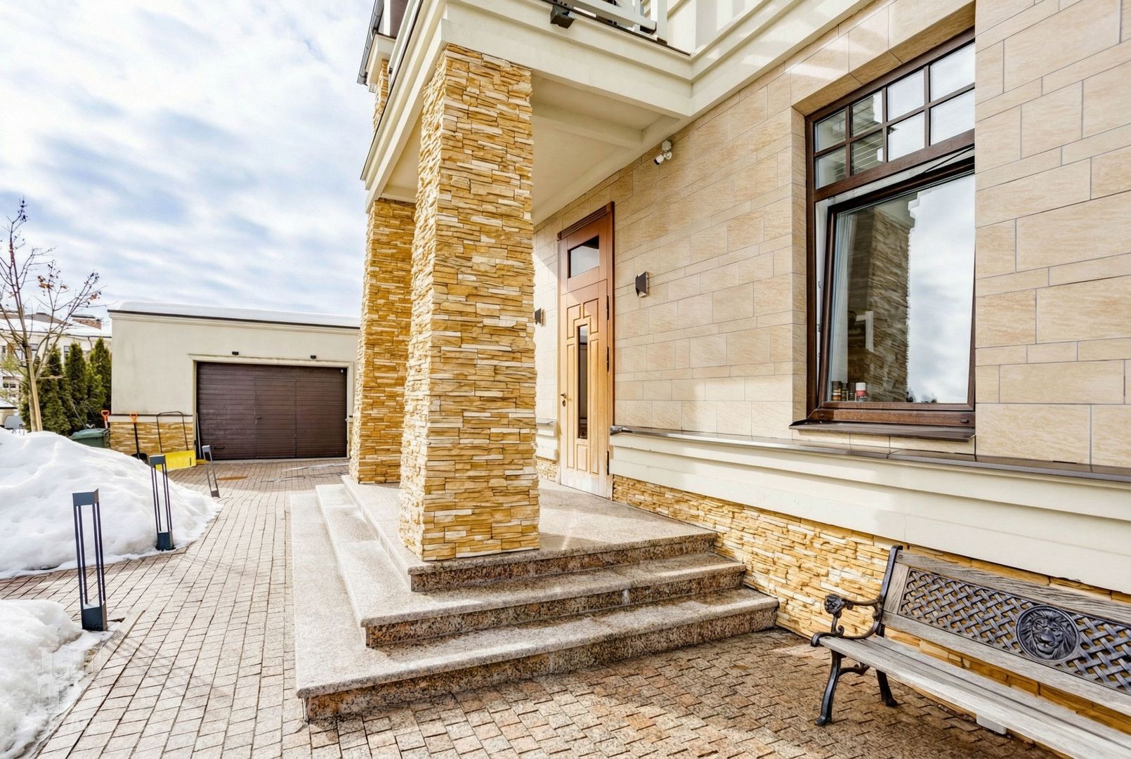 Архитектура особняка выдержана в классическом стиле, а фасад полностью облицован натуральным камнем, подчеркивая статус и долговечность строения.