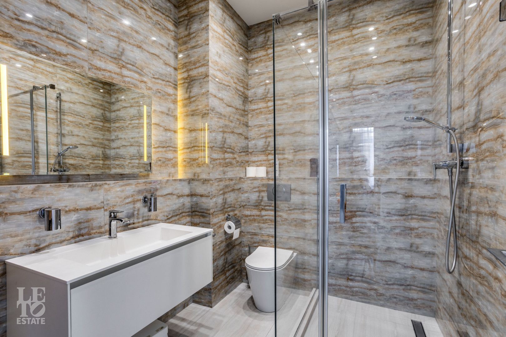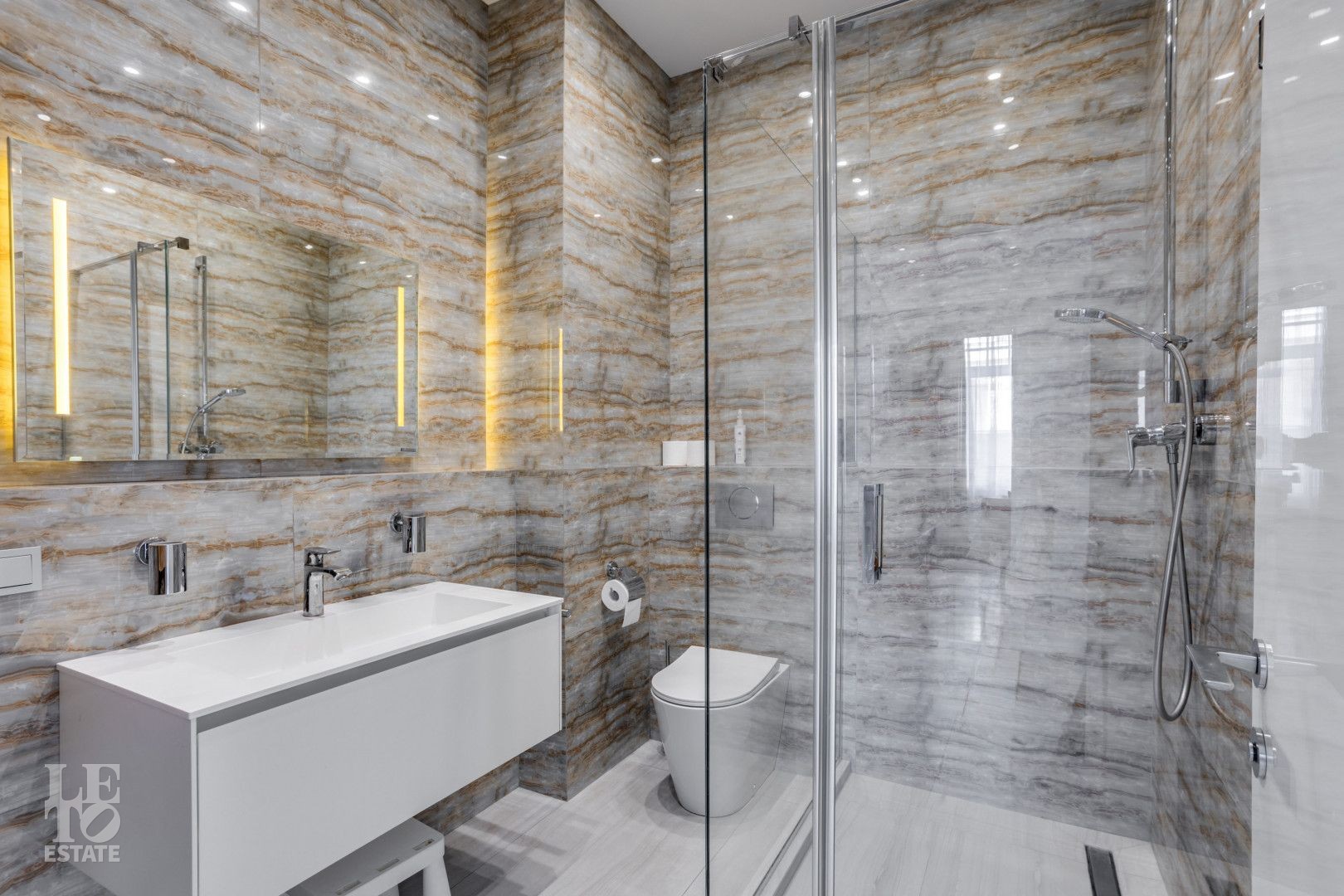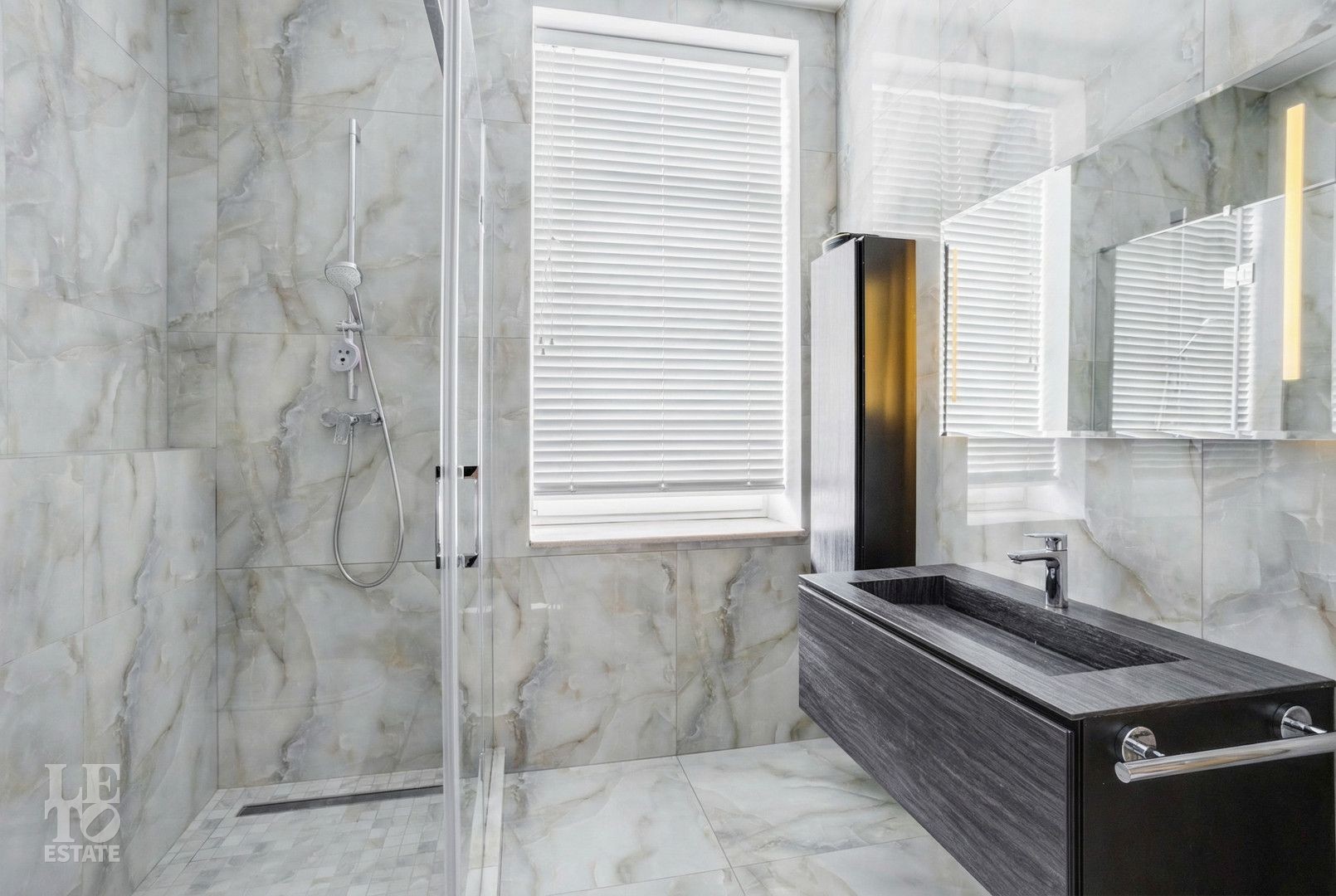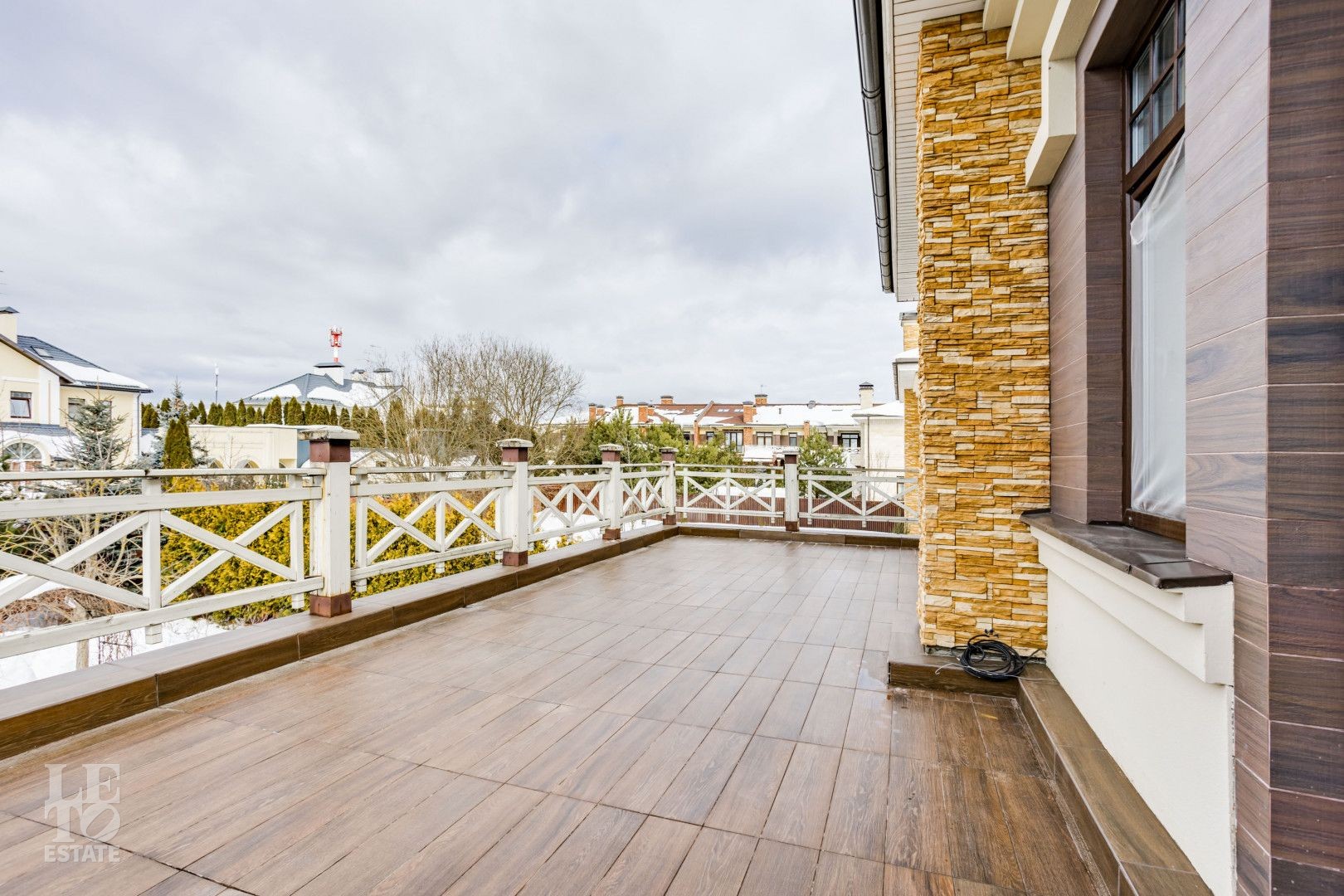Архитектура особняка выдержана в классическом стиле, а фасад полностью облицован натуральным камнем, подчеркивая статус и долговечность строения.