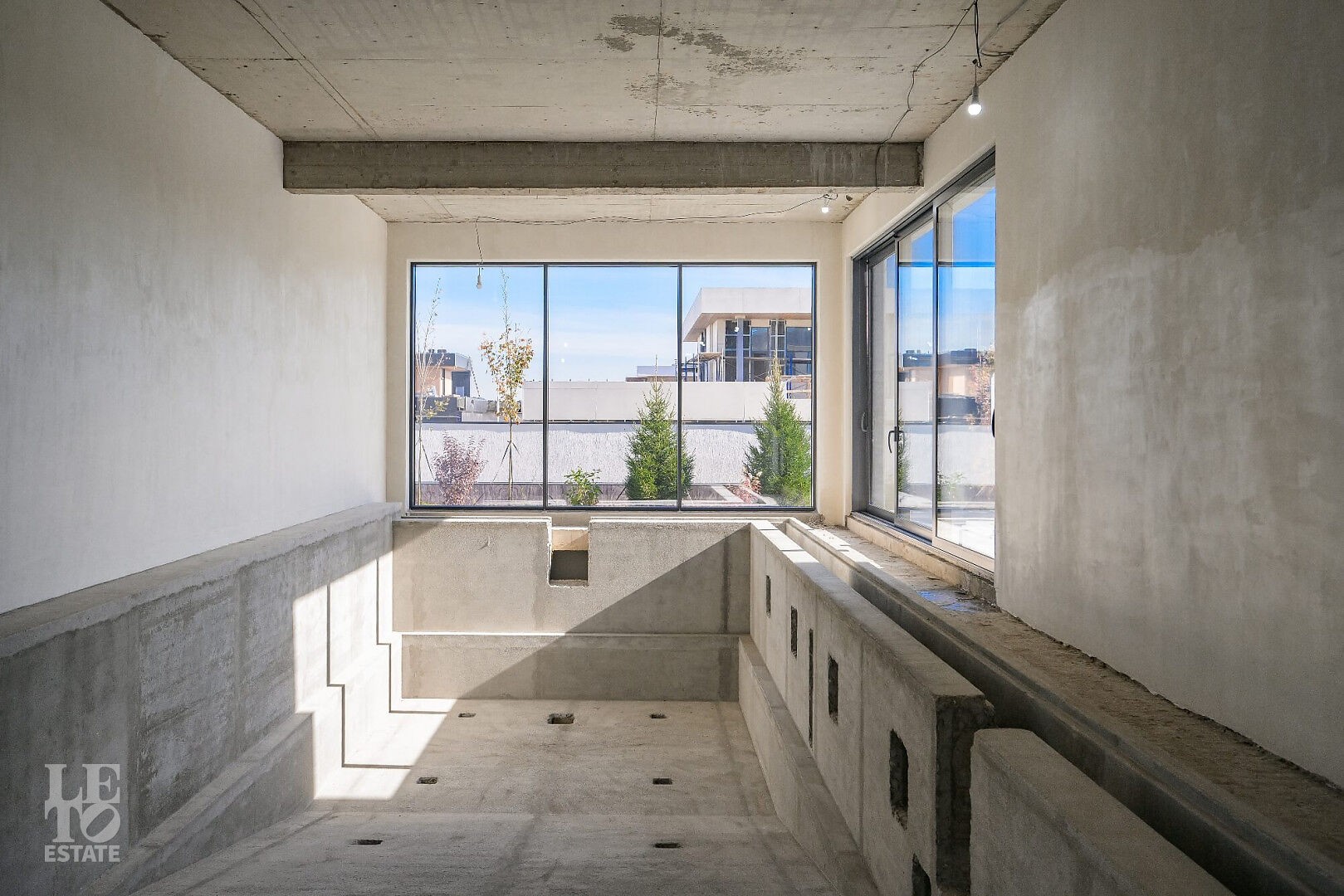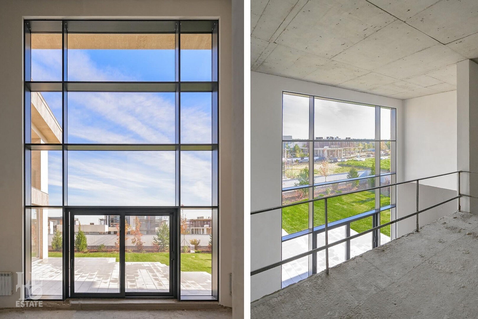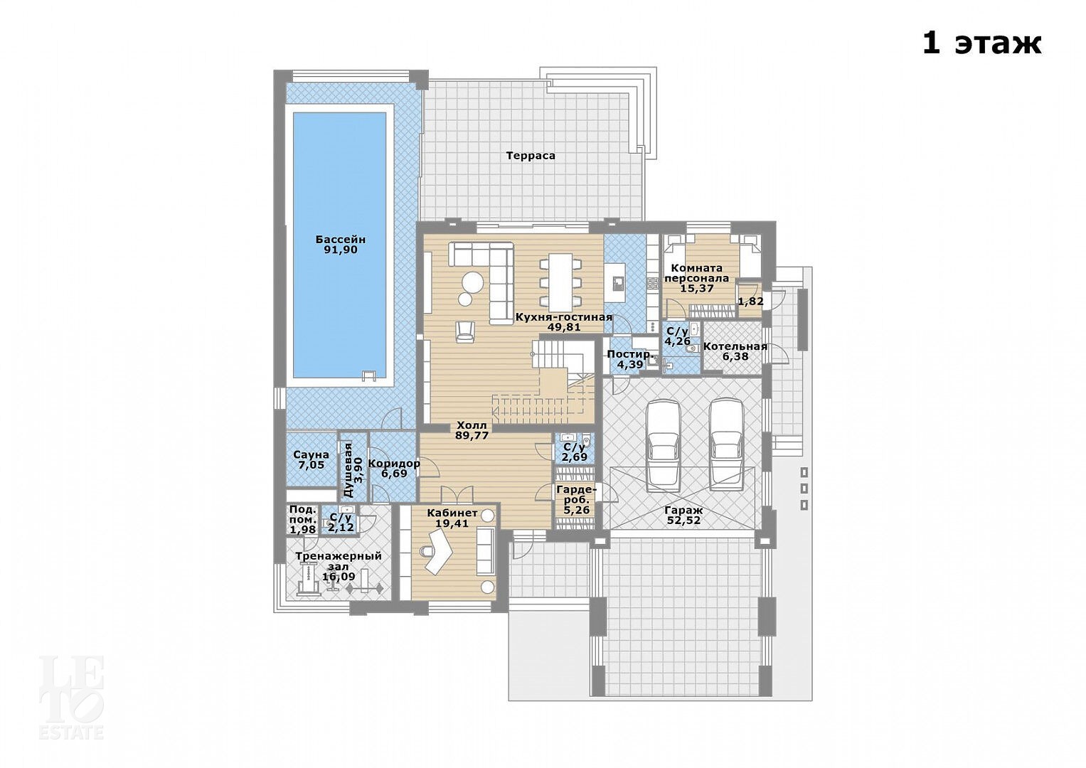Первый этаж: крыльцо, гардеробная, санузел, холл, кухня-гостиная со вторым светом и выходом на террасу, кабинет, постирочная, котельная, гараж, тренажерный зал, бассейн, сауна с душевой, холл, санузел, блок персонала: спальня с гардеробной и ванной комнатой.