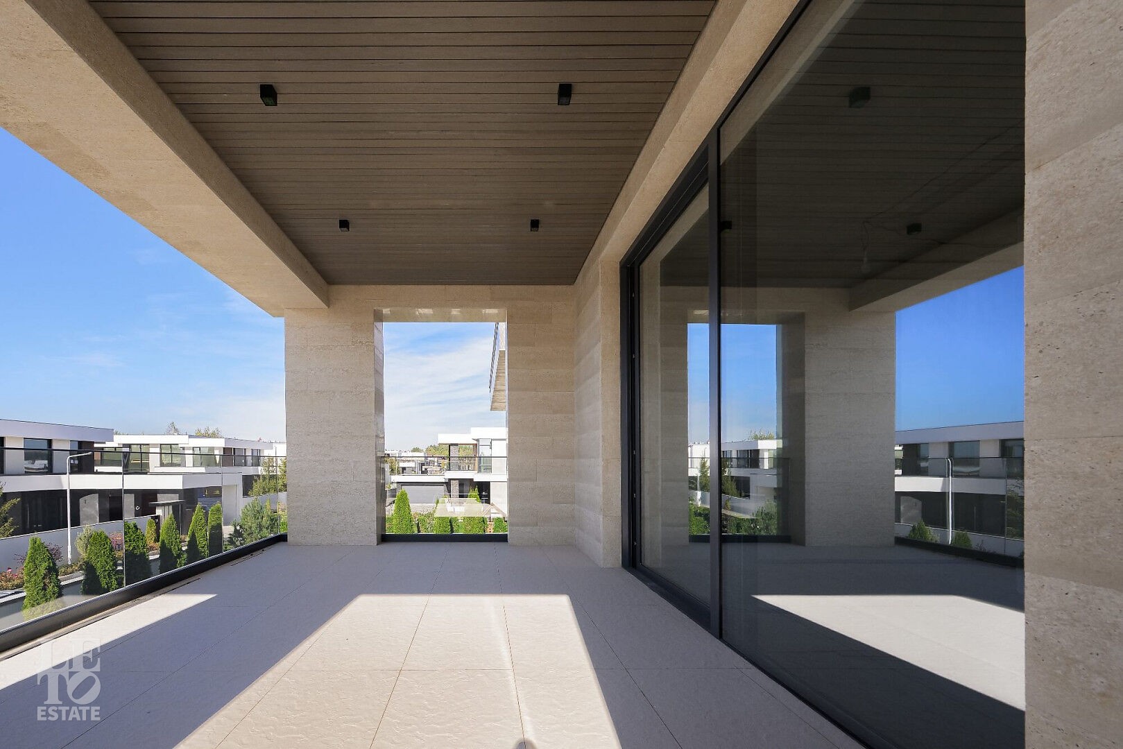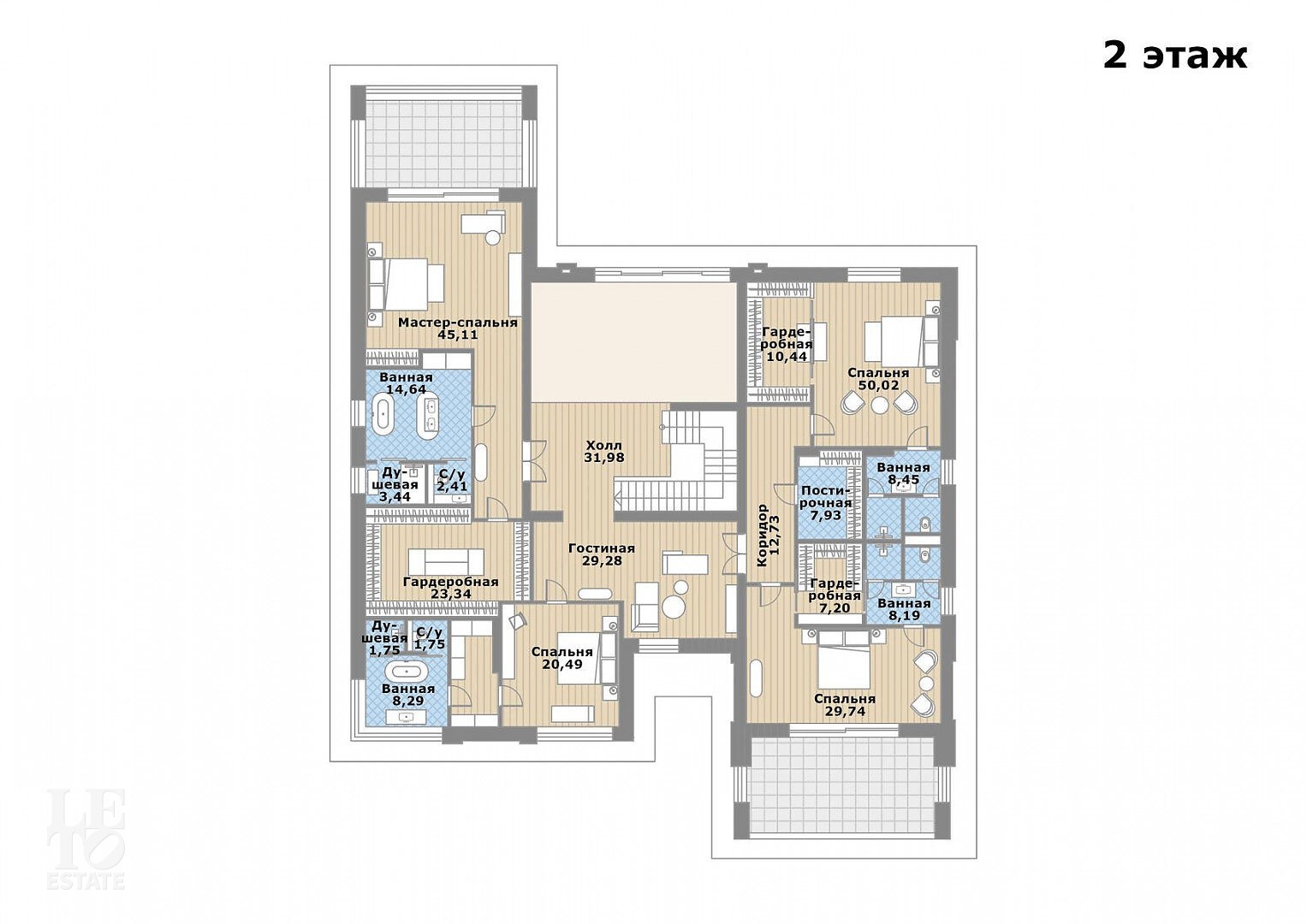 Второй этаж: 2 спальни с гардеробными, ванными комнатами и выходами на балкон, спальня с гардеробной и ванной комнатой, спальня с ванной комнатой, гостиная, коридор, постирочная.