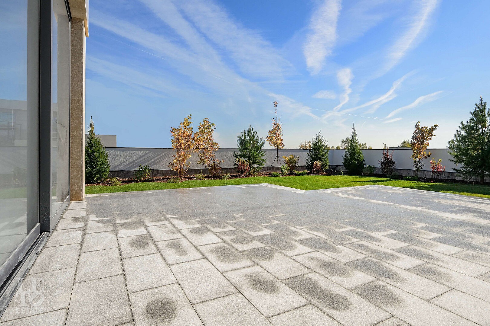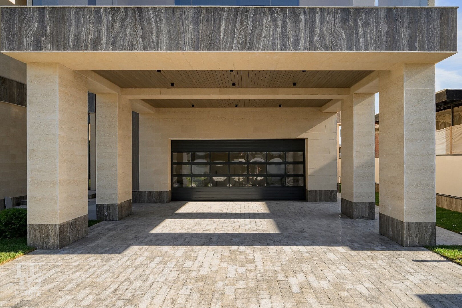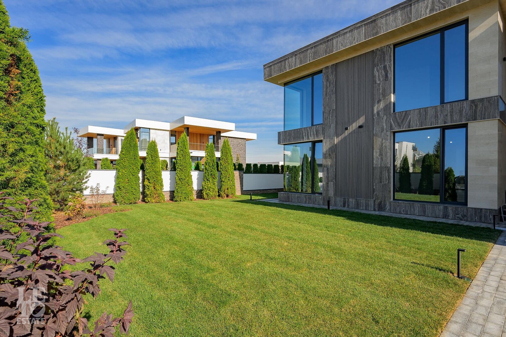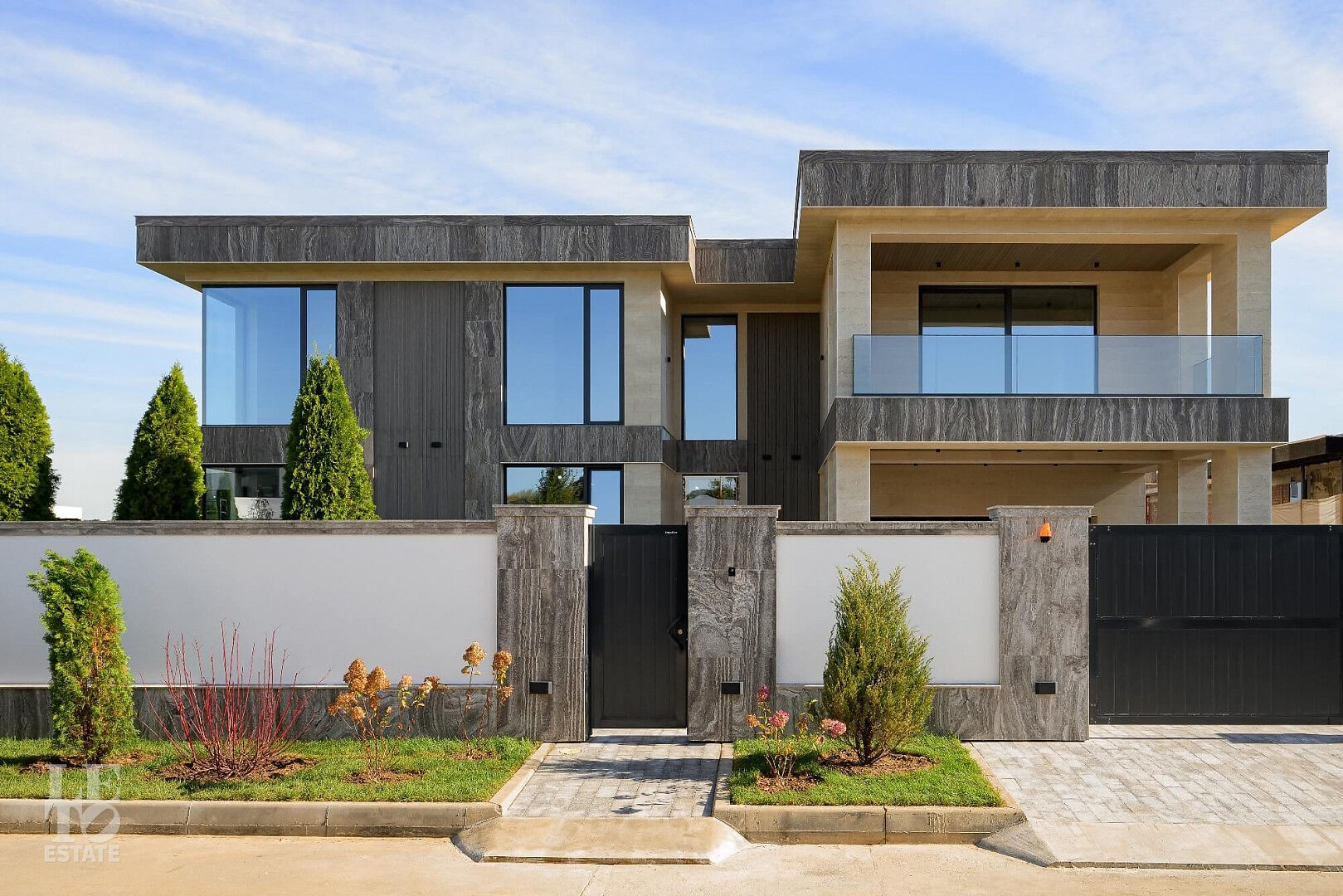 Огорожен капитальным забором, где фасадная часть отдела- на природным камнем, как и фасад дома. Брусчаткой вымощены дорожки и парковка на 4 м/м.