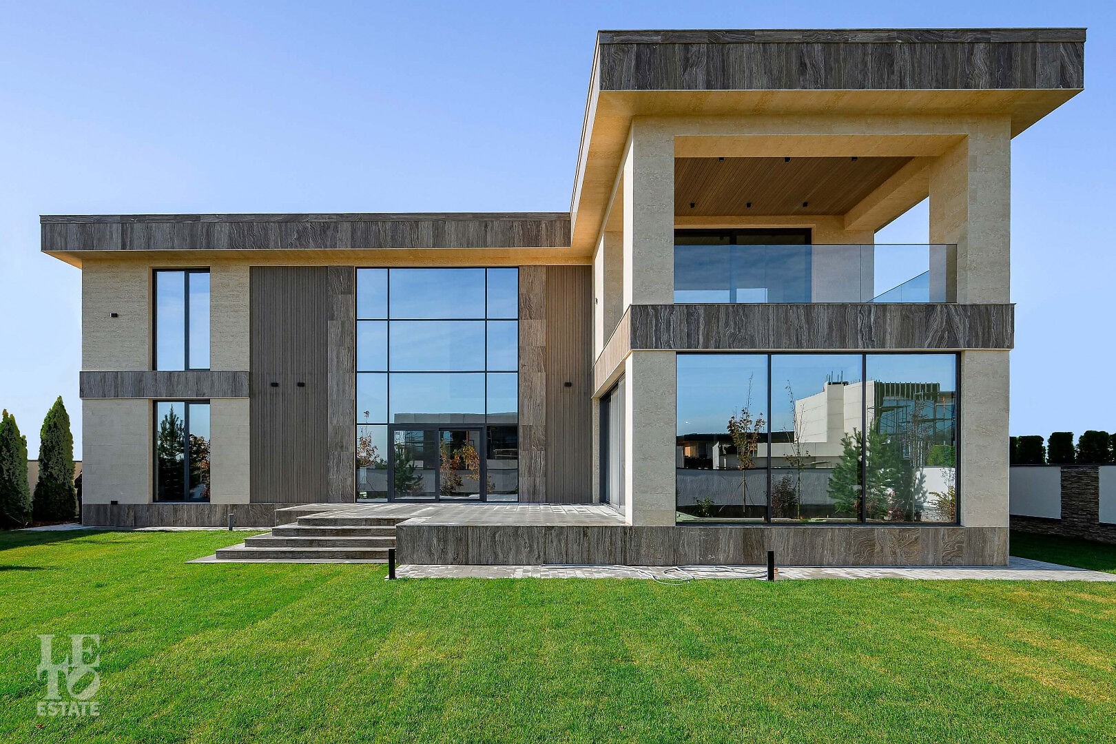 Особенности дома: большое остекление, второй свет в гостиной, высокие потолки, капитальный конструктив, натуральный камень на фасаде - травертин (приятно выделяет коттедж среди своих построен- ных соседей, особенно с вечер- ней подсветкой).