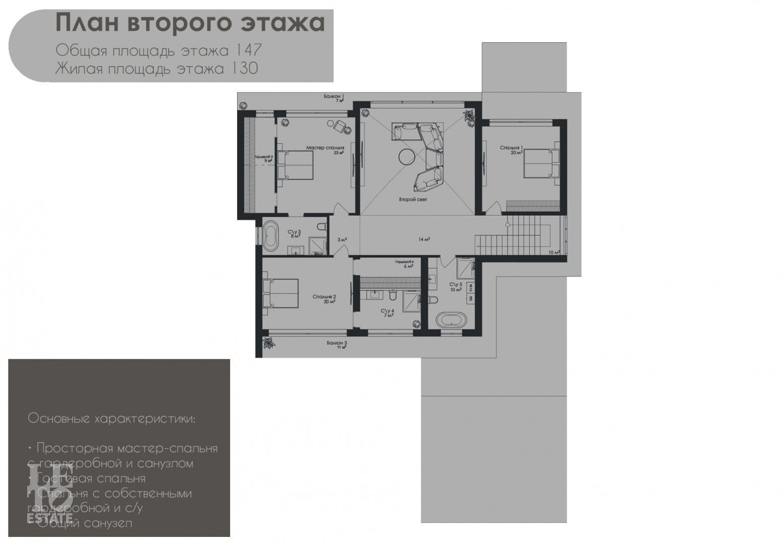 Второй этаж: холл, мастер-спальня с гардеробной и санузел с ванной и душевой, спальня с гардеробной и санузел с душевой, спальня