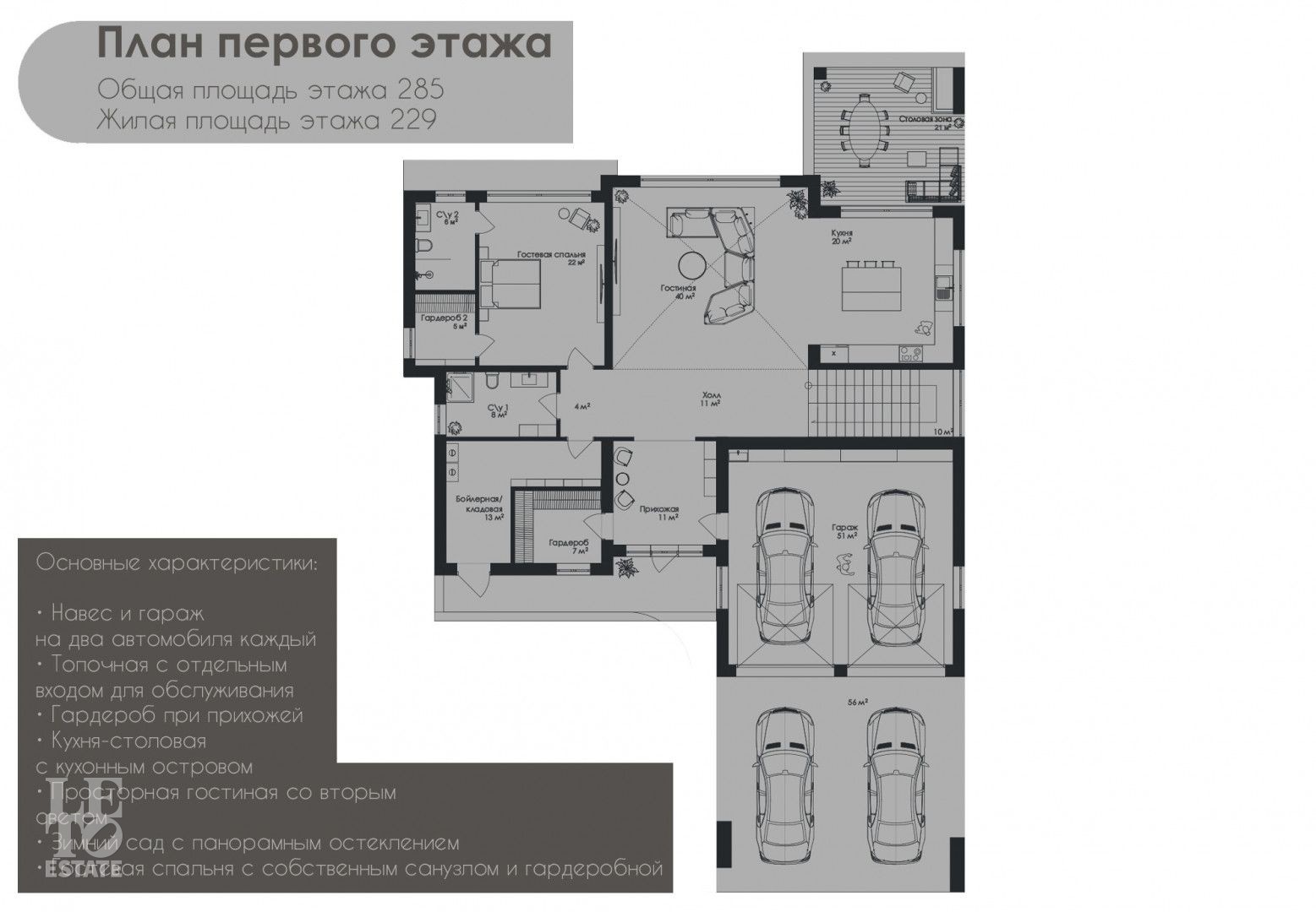 Первый этаж: прихожая, гардеробная, санузел, гостевая спальня с санузлом и гардеробной, санузел, гостиная со вторым светом, кухня с обеденной зоной, зимний сад столовая, бойлерная/кладовая, гараж на 2 автомобиля, навес на 2 автомобиля
