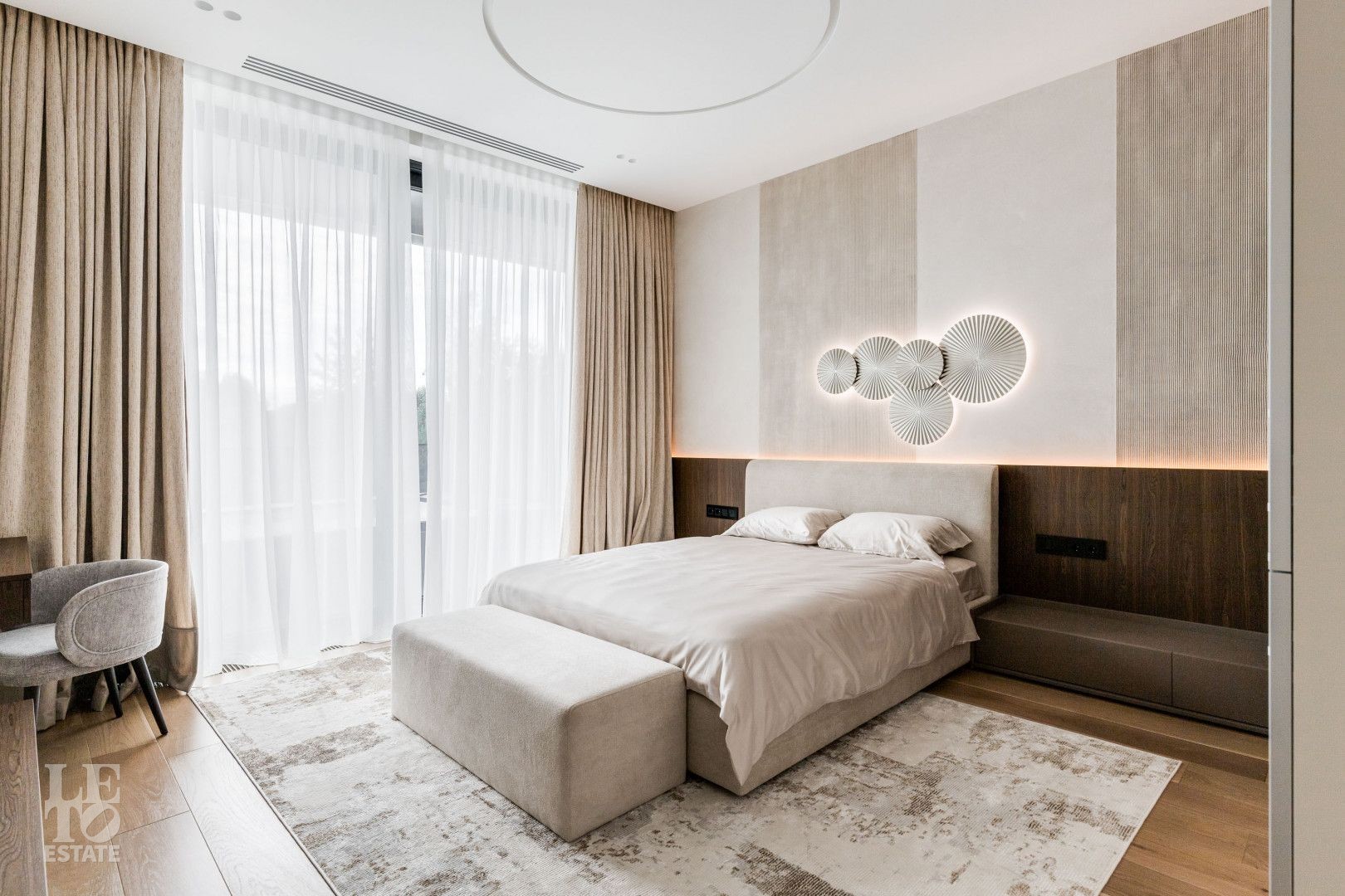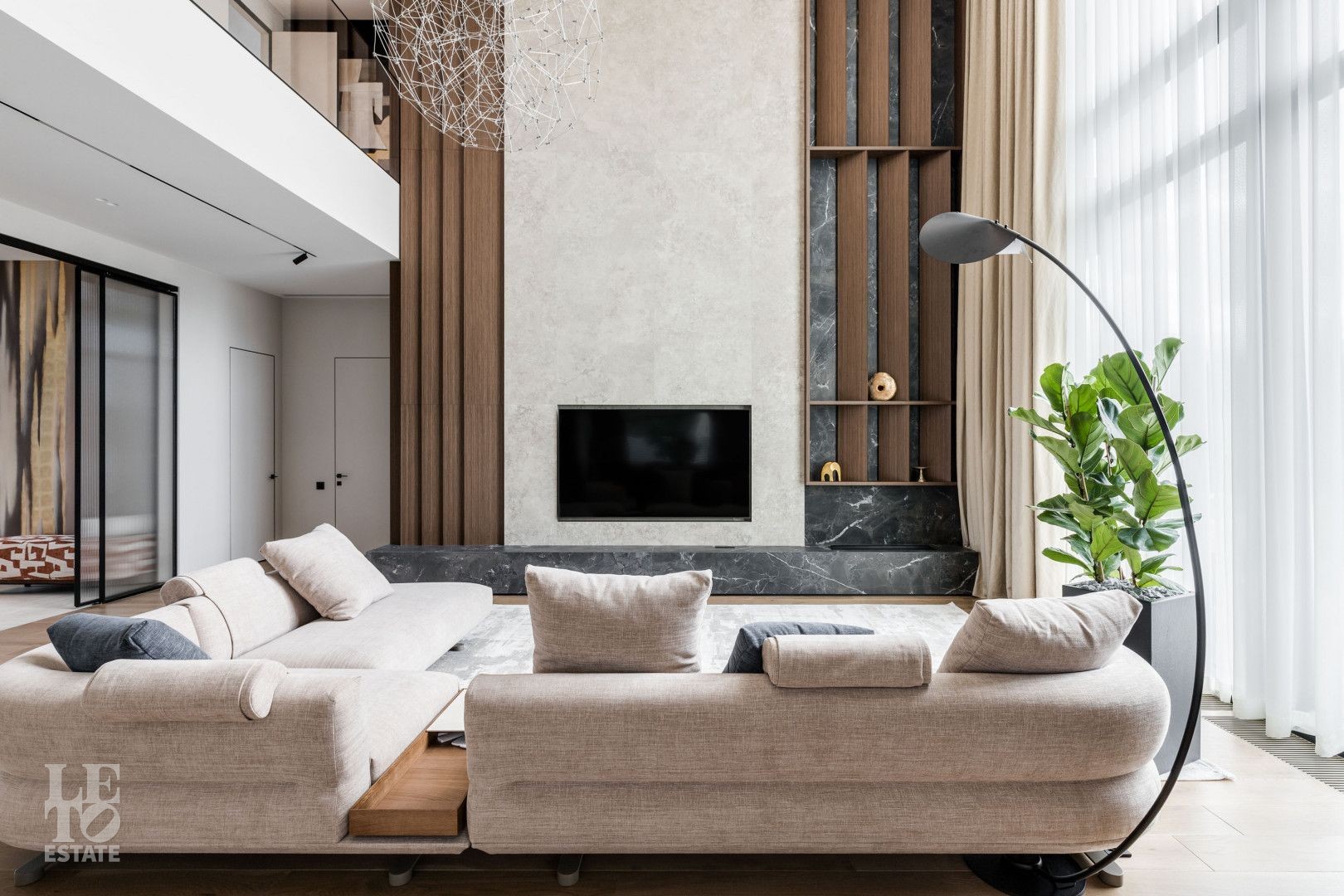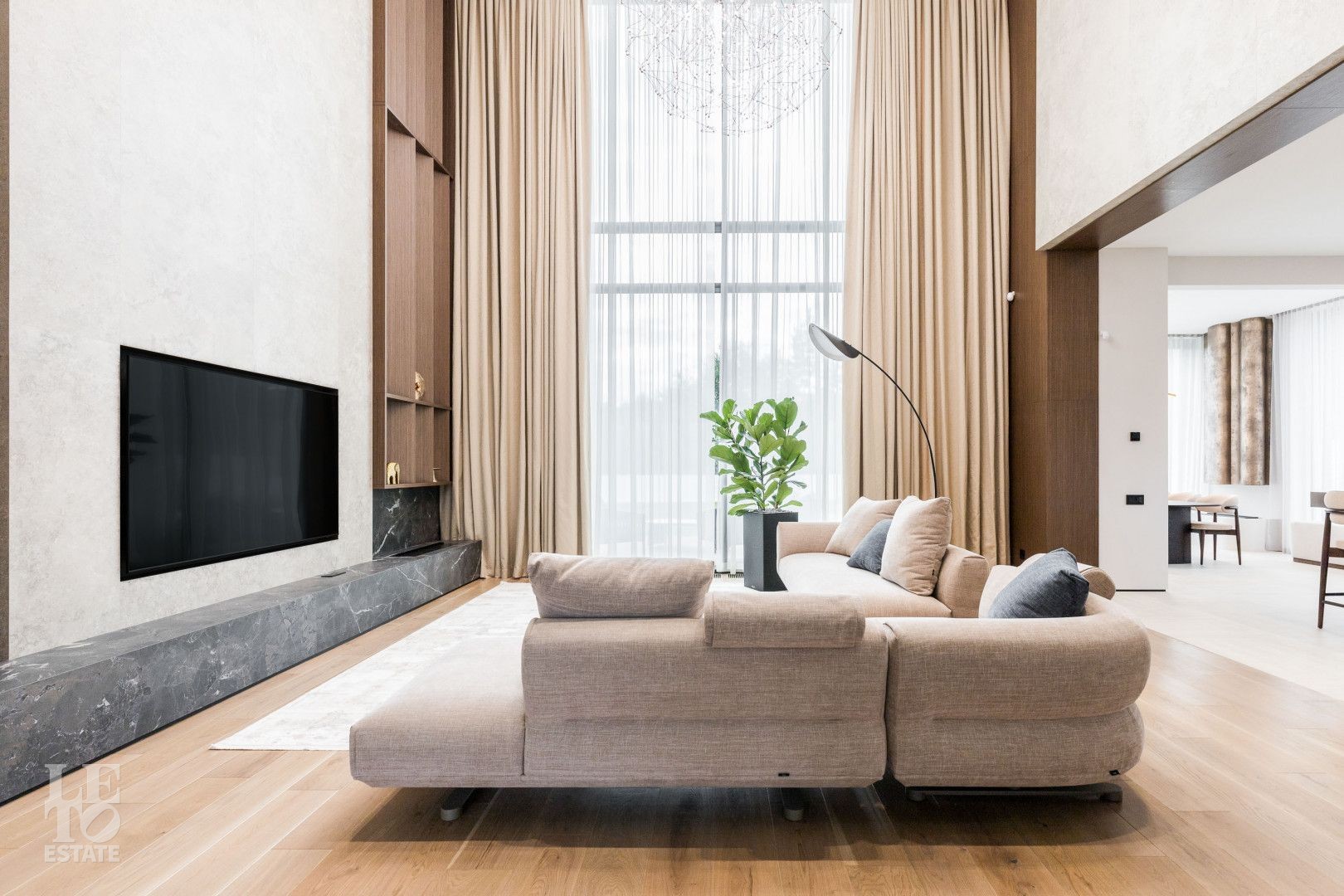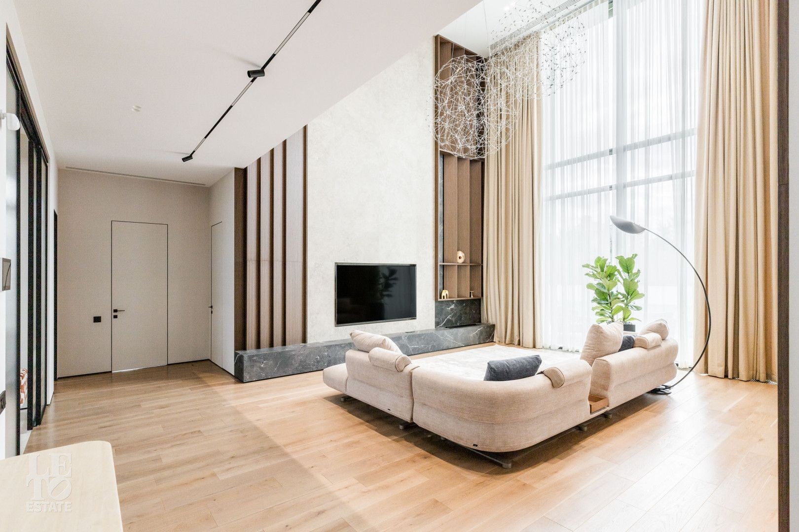 Современный интерьер выполнен в светлых тонах и создает атмосферу уюта и спокойствия. Отделка выполнена из премиальных материалов: итальянская плитка ITALON LAMINAM, Imola Infinity Brazil, Ariostea Marm, Mirage Ginger и др. На стенах использована декоративная штукатурка; напольное покрытие — паркет из дубовой доски; текстиль — из Италии.