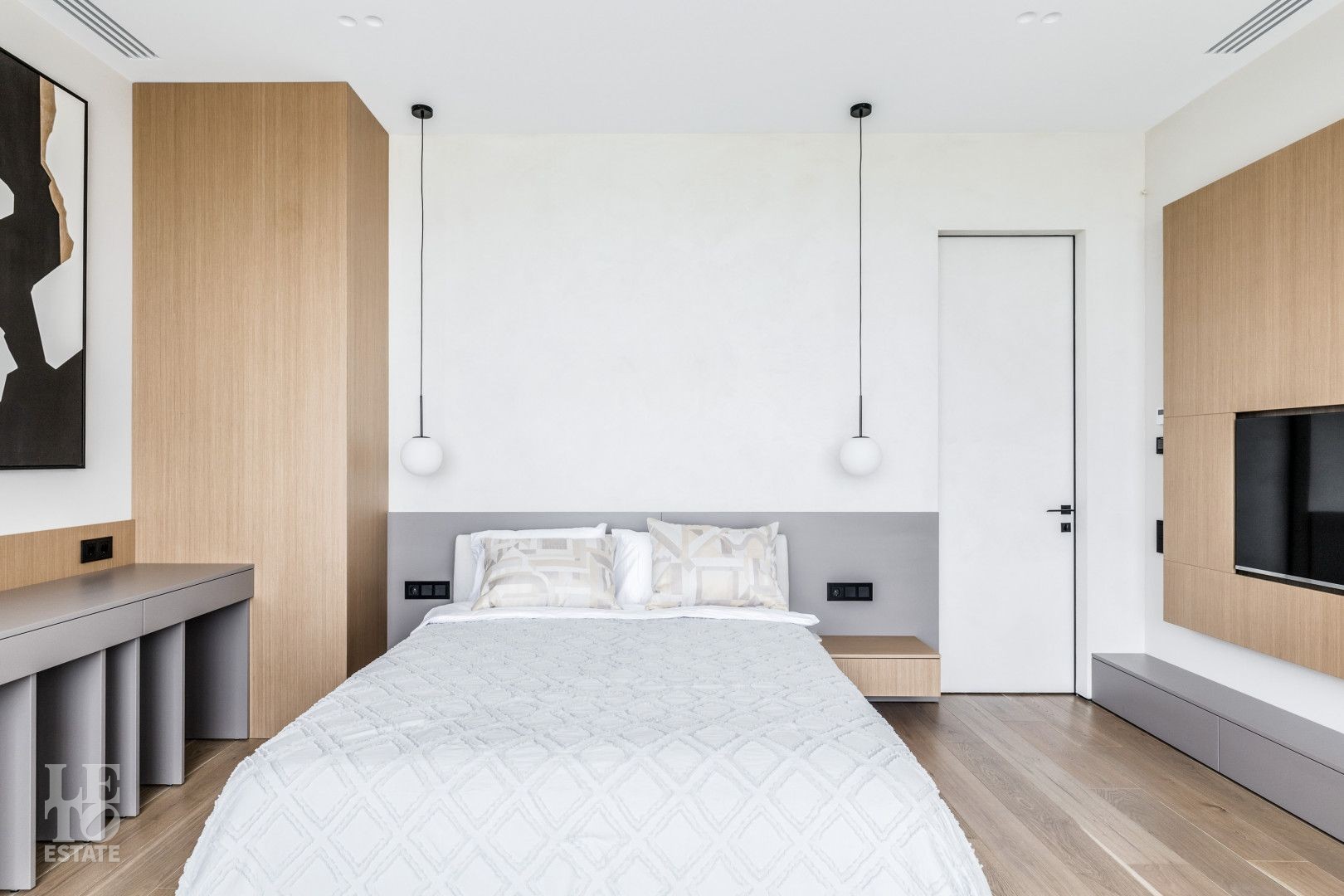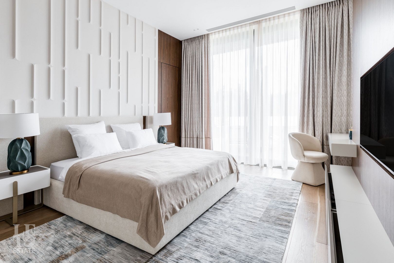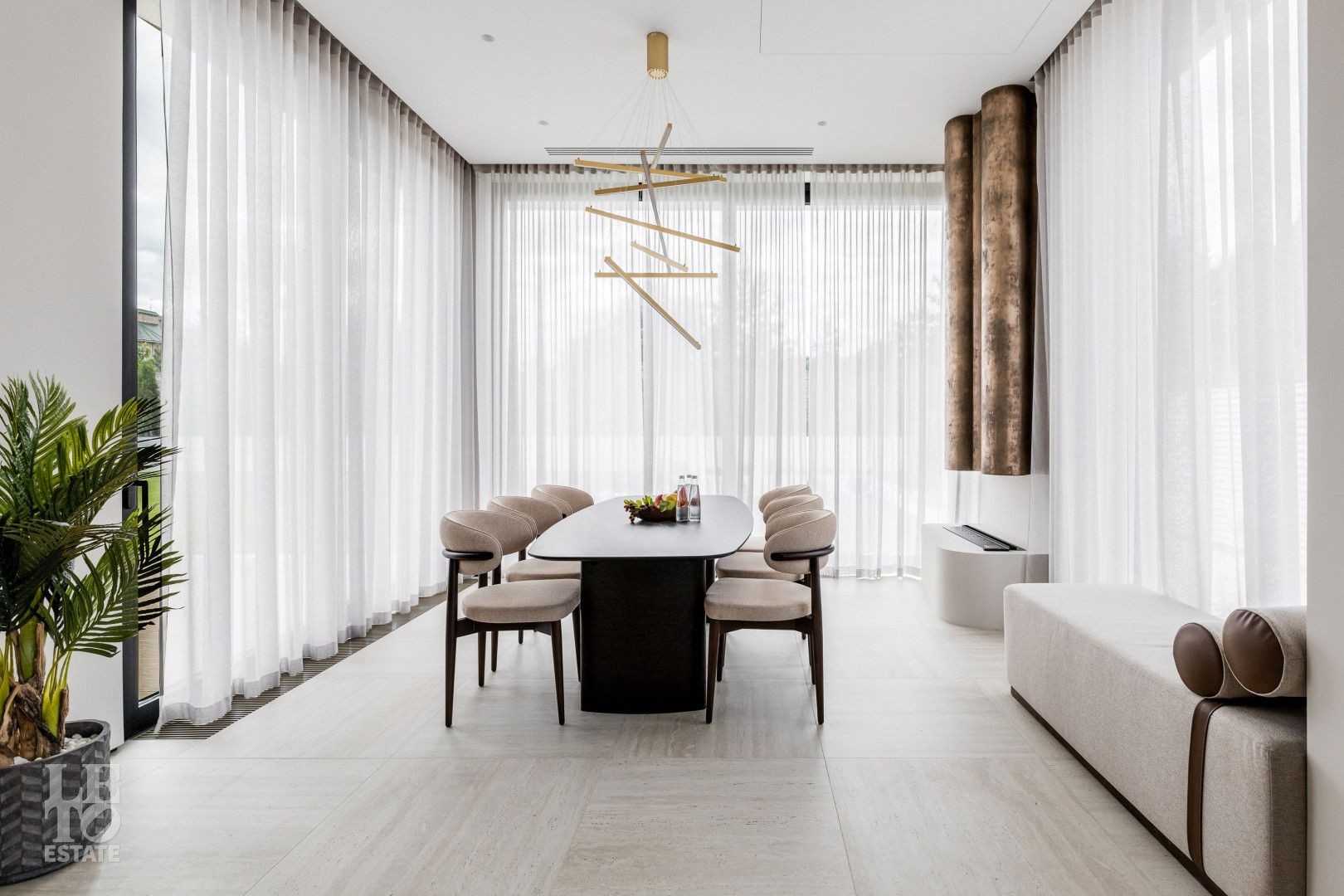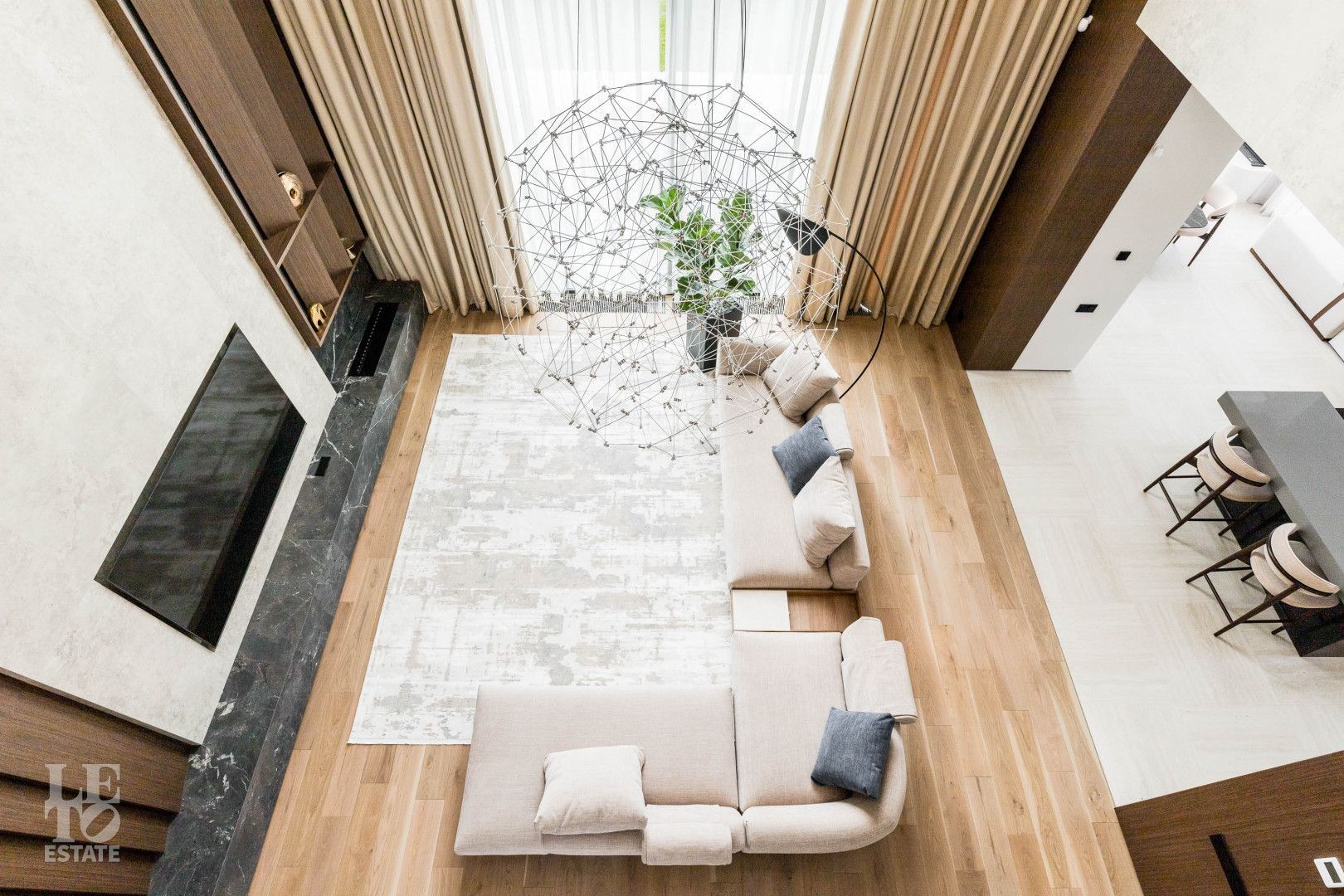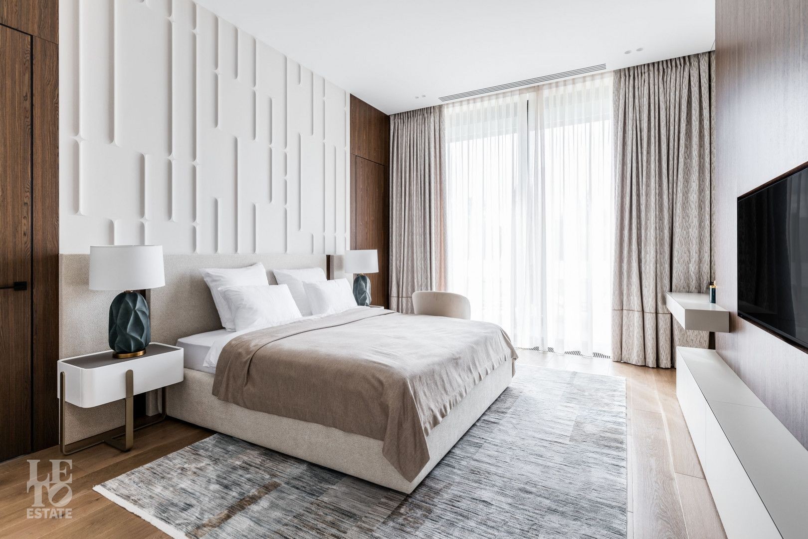 Современный интерьер выполнен в светлых тонах и создает атмосферу уюта и спокойствия. Отделка выполнена из премиальных материалов: итальянская плитка ITALON LAMINAM, Imola Infinity Brazil, Ariostea Marm, Mirage Ginger и др. На стенах использована декоративная штукатурка; напольное покрытие — паркет из дубовой доски; текстиль — из Италии.