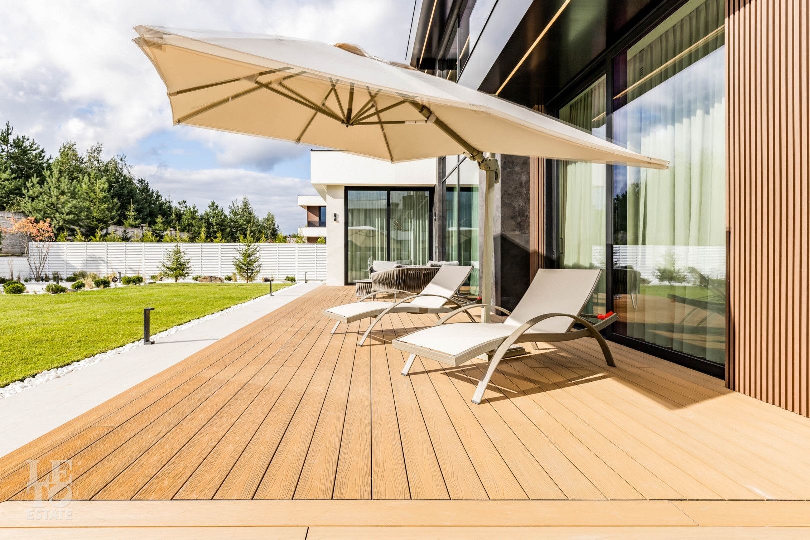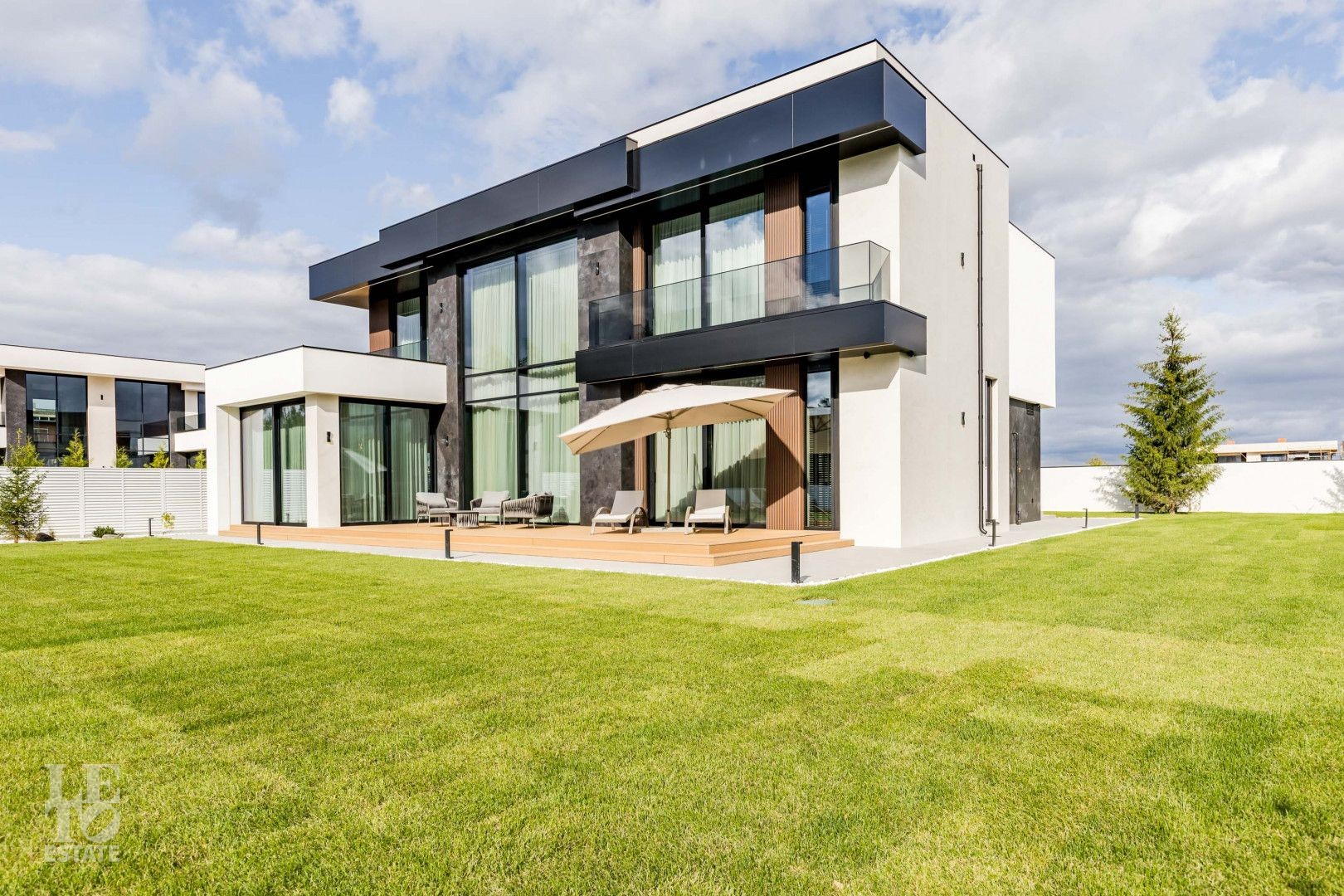 Фасад дома оформлен с использованием итальянской плитки, которая придает зданию утонченный и стильный внешний вид. Деревянные элементы гармонично сочетаются с плиткой, создавая теплый и уютный акцент. Декоративная штукатурка завершает общее оформление экстерьера, создавая интересные текстурные контрасты. Особое внимание привлекают темные ограждающие стекла на балконах, придающие дому современный и минималистичный вид.