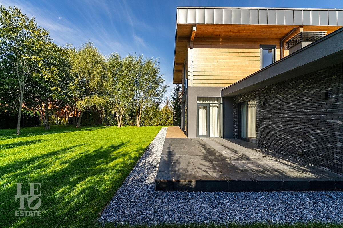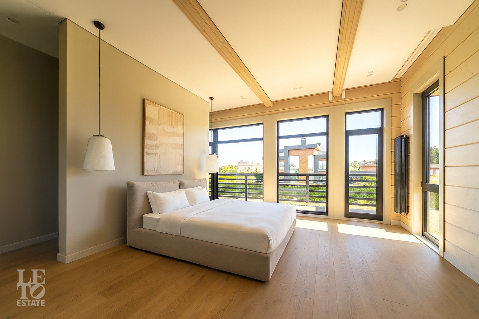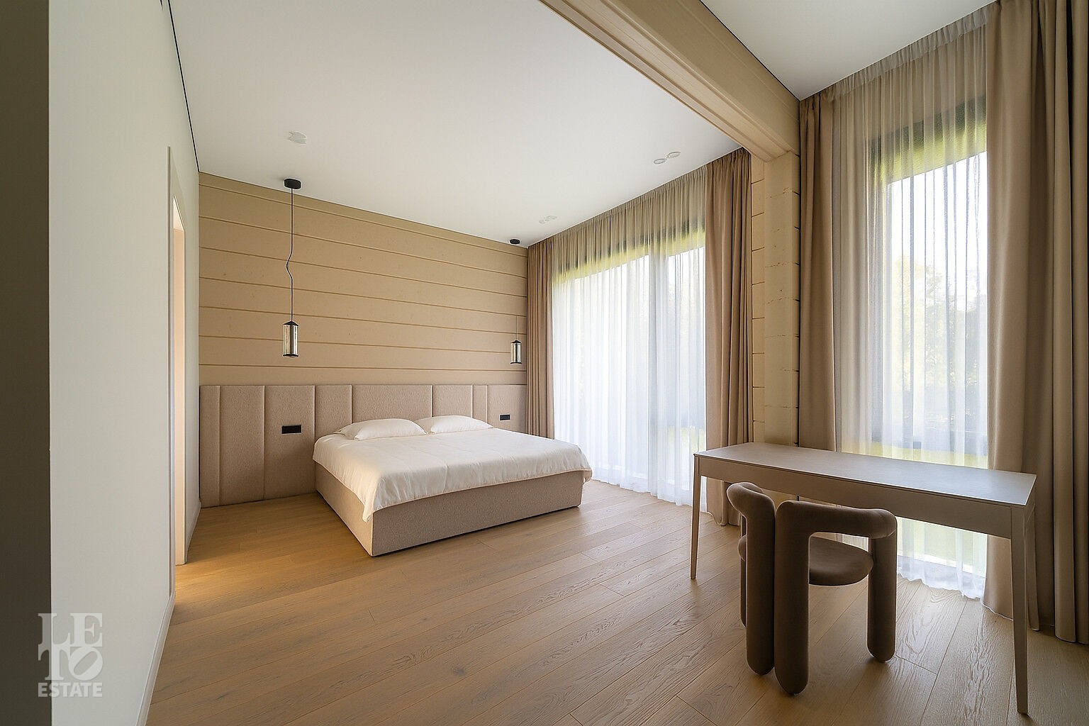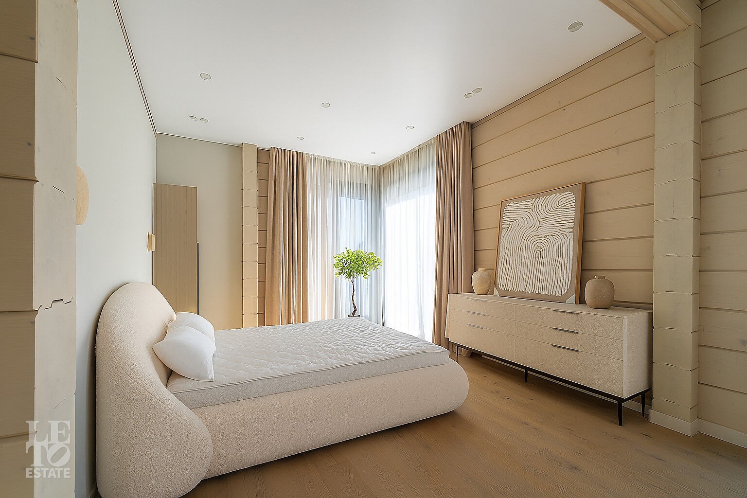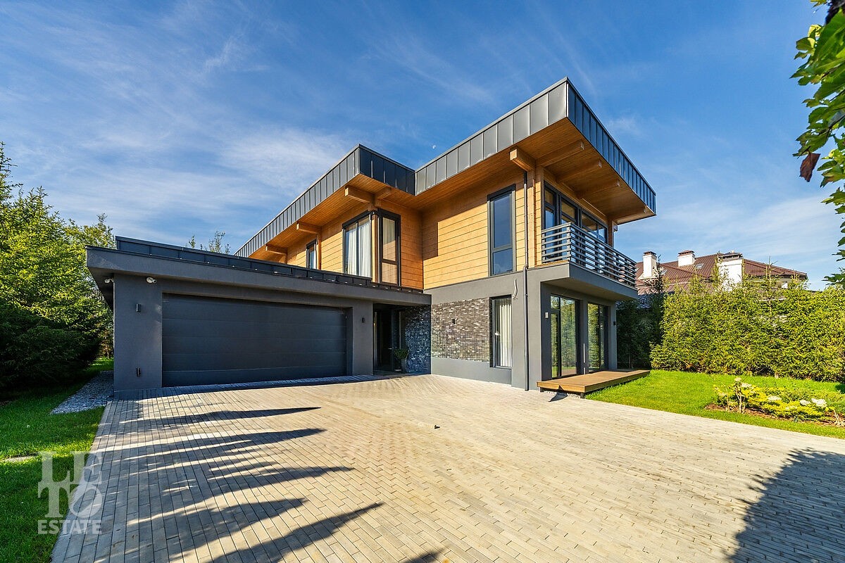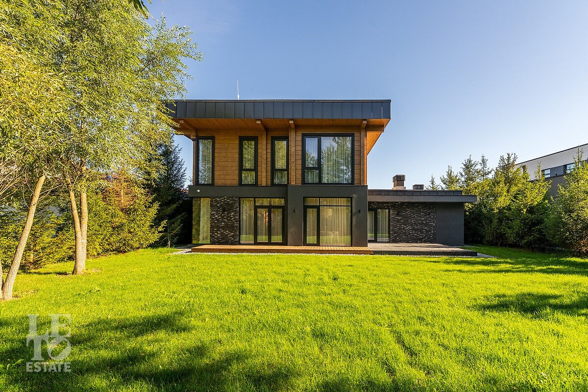 Дом построен в архитектурном стиле шале, который предполагает строительство первого этажа из кирпича, второго из бруса. В доме соблюдена эргономика пространства, за счет этого в доме комфортно размещаются 6 комнат, 5 из которых спальни, каждая с индивидуальным санузлом и гардеробной. На первом этаже удобно расположена кухонная зона, центральной зоной является столовая с гостиной и выходом на задний двор и террасу. Над гаражом обустроена эксплуатируемая кровля. Дом полностью готов к проживанию, продается с мебелью и бытовой техникой.