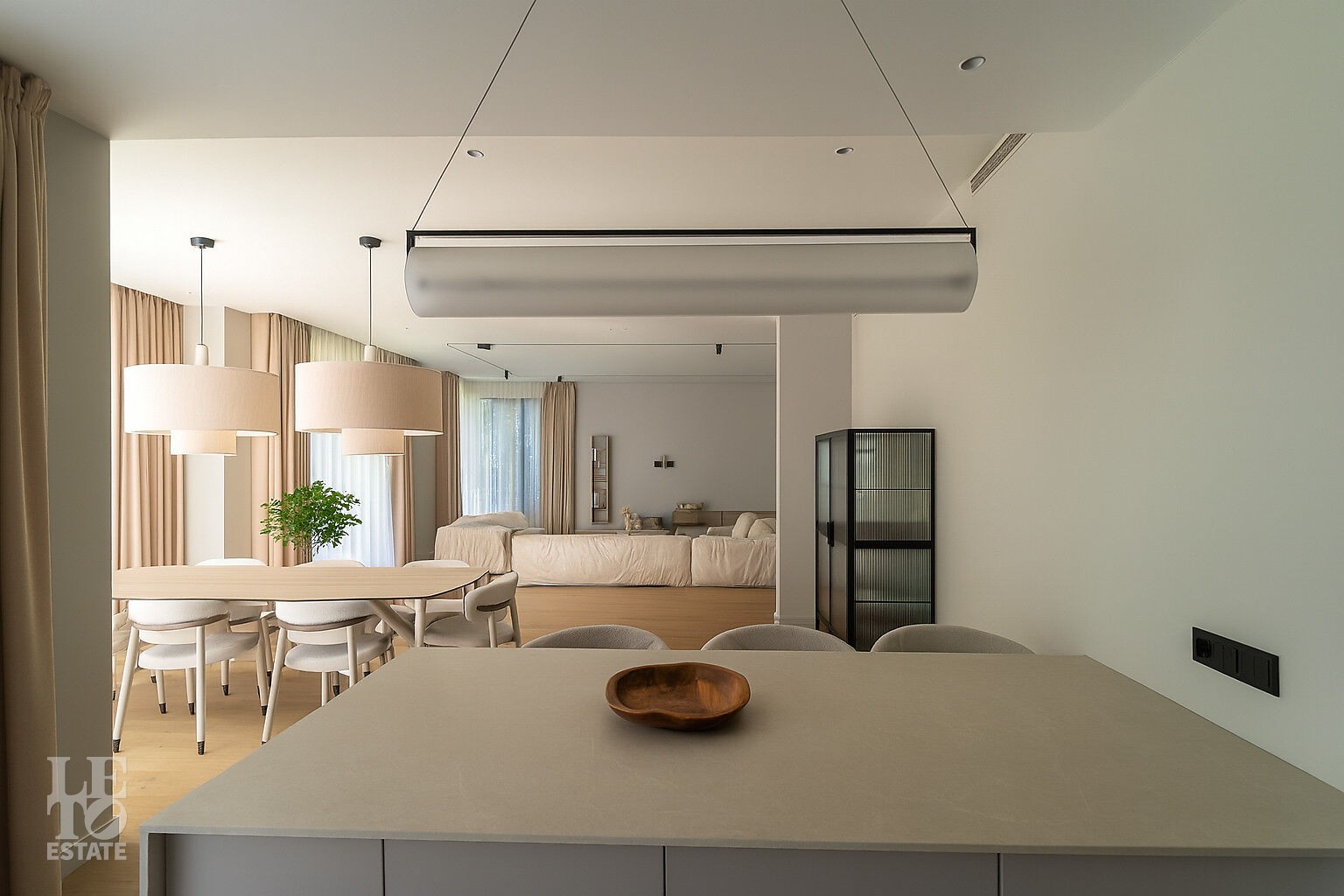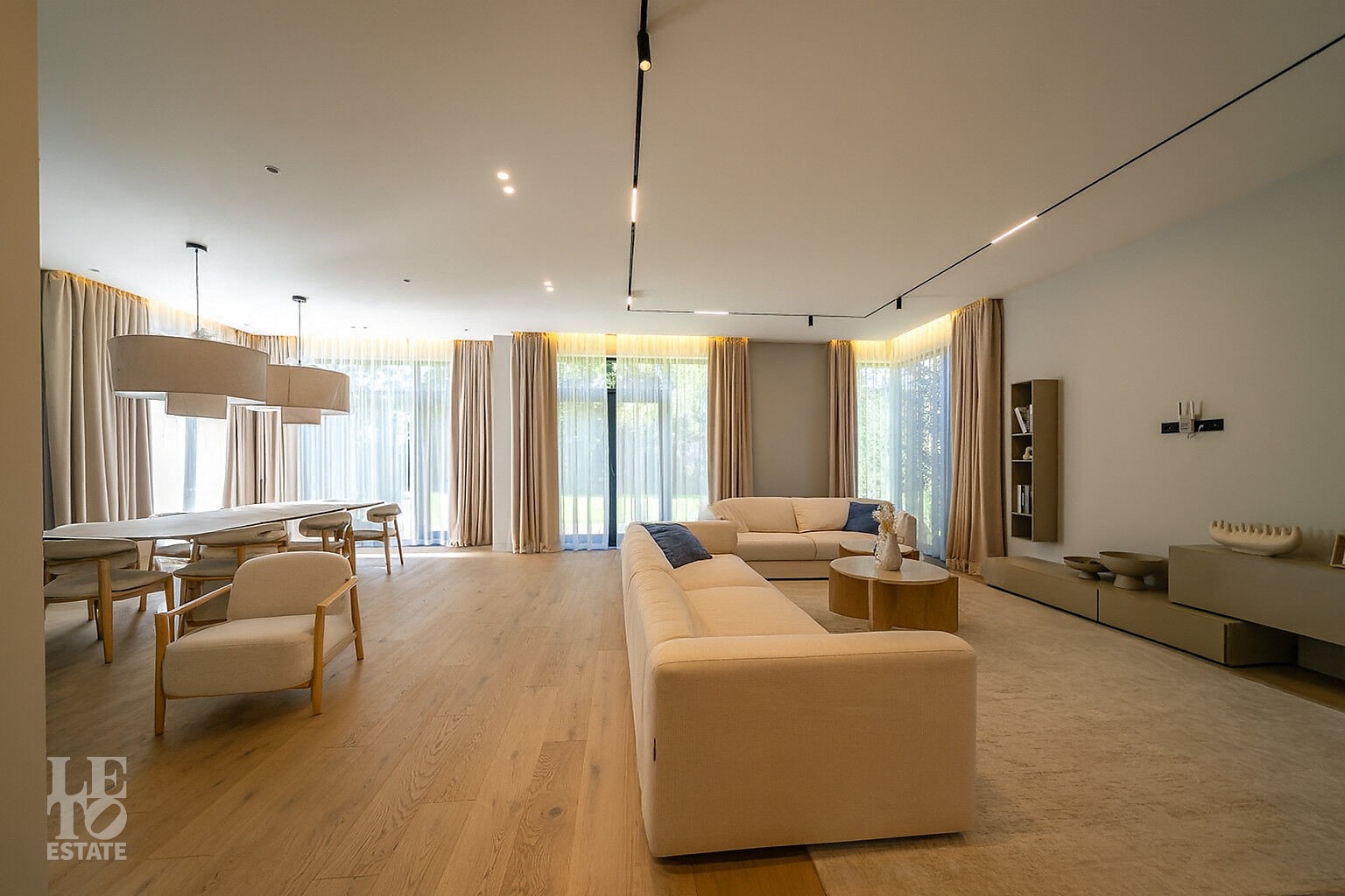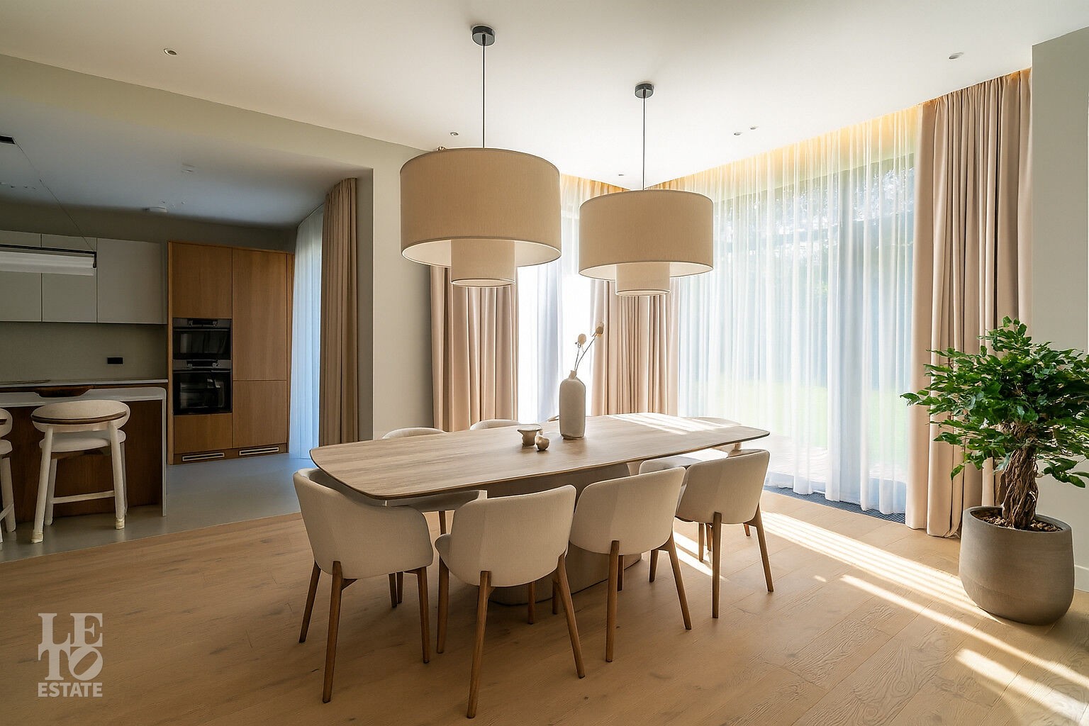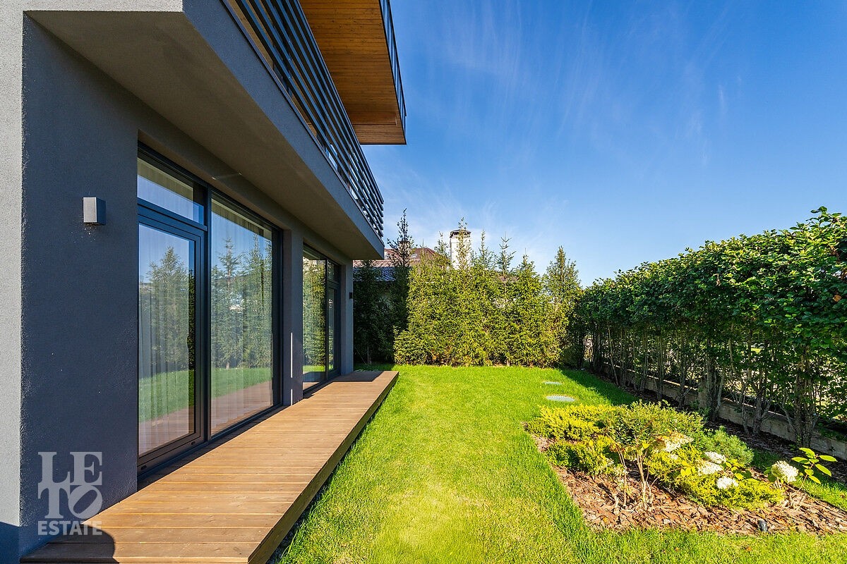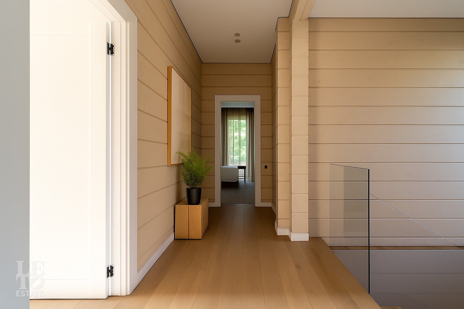 Дом построен в архитектурном стиле шале, который предполагает строительство первого этажа из кирпича, второго из бруса. В доме соблюдена эргономика пространства, за счет этого в доме комфортно размещаются 6 комнат, 5 из которых спальни, каждая с индивидуальным санузлом и гардеробной. На первом этаже удобно расположена кухонная зона, центральной зоной является столовая с гостиной и выходом на задний двор и террасу. Над гаражом обустроена эксплуатируемая кровля. Дом полностью готов к проживанию, продается с мебелью и бытовой техникой.