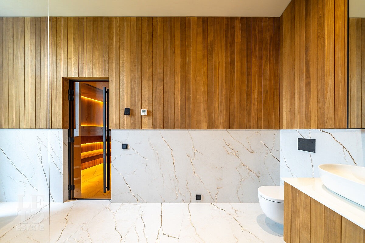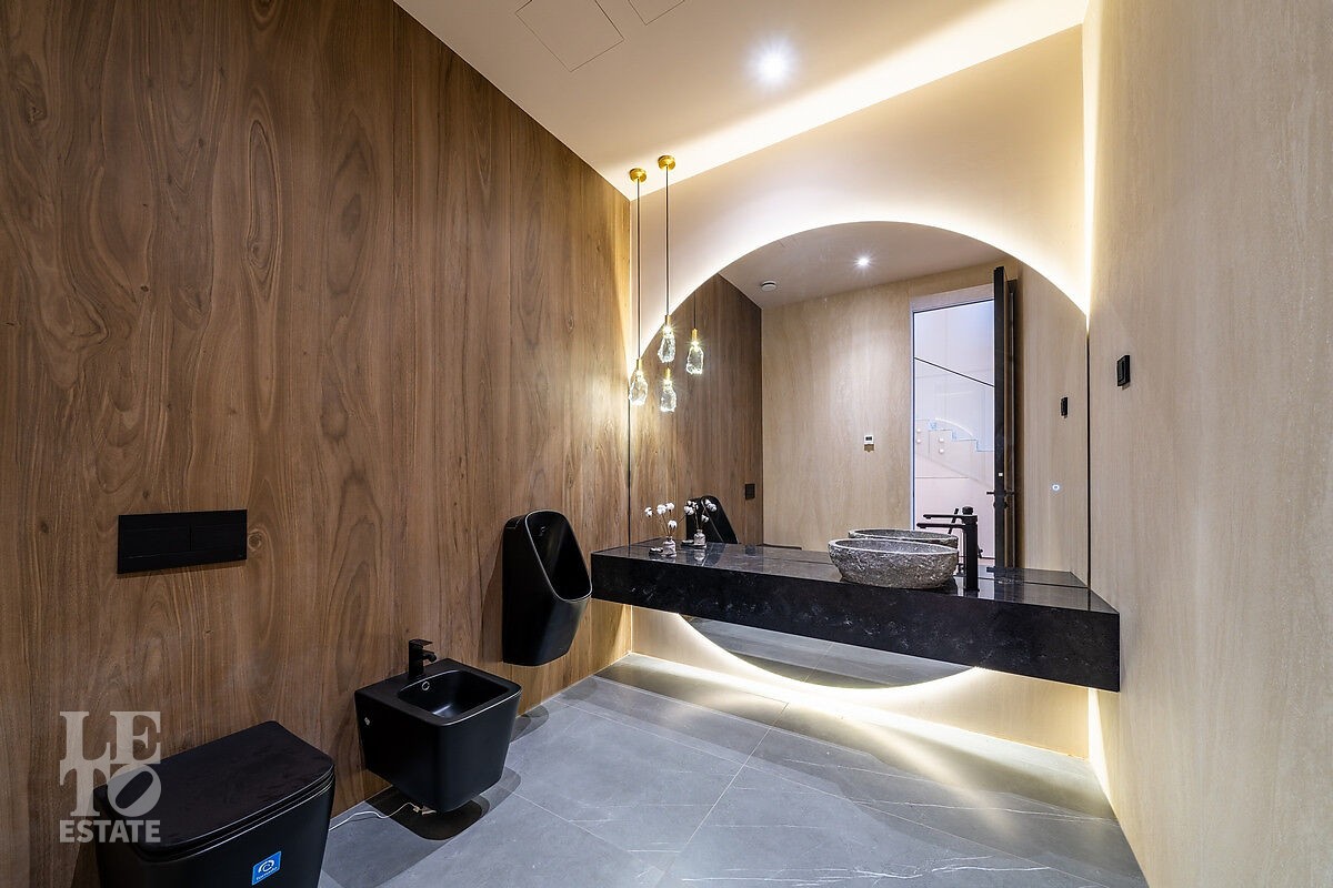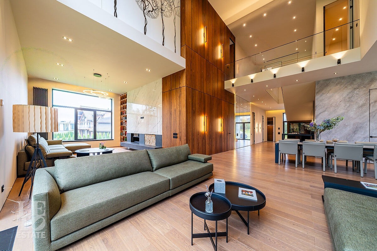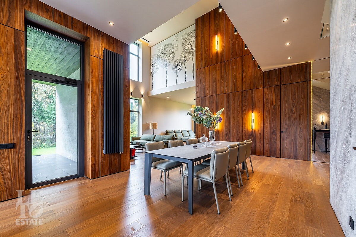 Общественная зона: Полностью укомплектованная мебелью гостиная-столовая-кухня - единое пространство со вторым светом, общей площадью 115 кв. м и объемом - 570 куб. м (выделено 5 функциональных зон: медиа зона с ТВ и дровяным камином, лаунж зона с двумя большими диванами, столовая со столом на 8 персон (с возможностью увеличения до 20), зона бара с двумя сервантами и барной стойкой, парадная кухня с островом 20 кв. м (с доступом в рабочую кухню 12 кв. м)). Окна этого пространства смотрят на восток, юг и запад. Блок свободного назначения с санузлом и сауной (общая площадь блока 37 кв. м, комната может использоваться как игровая, СПА, спортзал, кинотеатр, бильярдная и т.д.). Крытая терраса с видом на лес с доступом из кухни и столовой. Хозяйский санузел первого этажа, оснащенный умывальником, унитазом, биде и писсуаром.