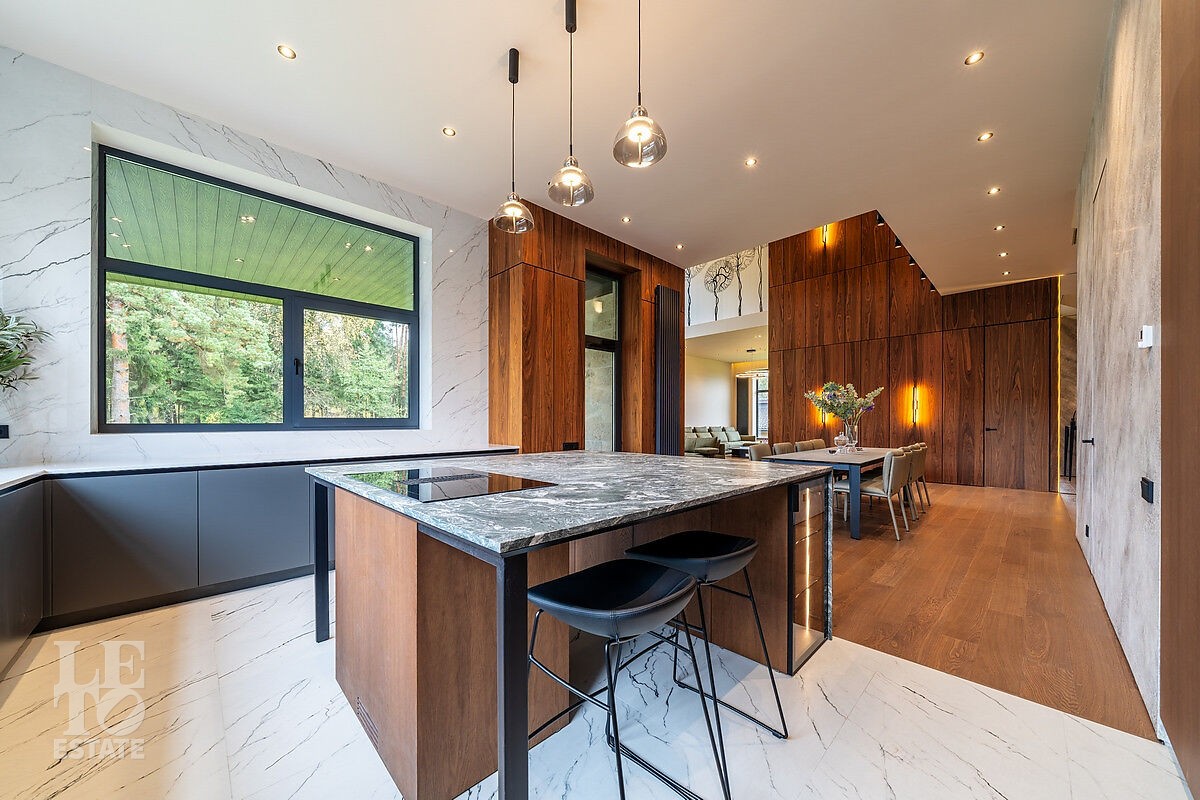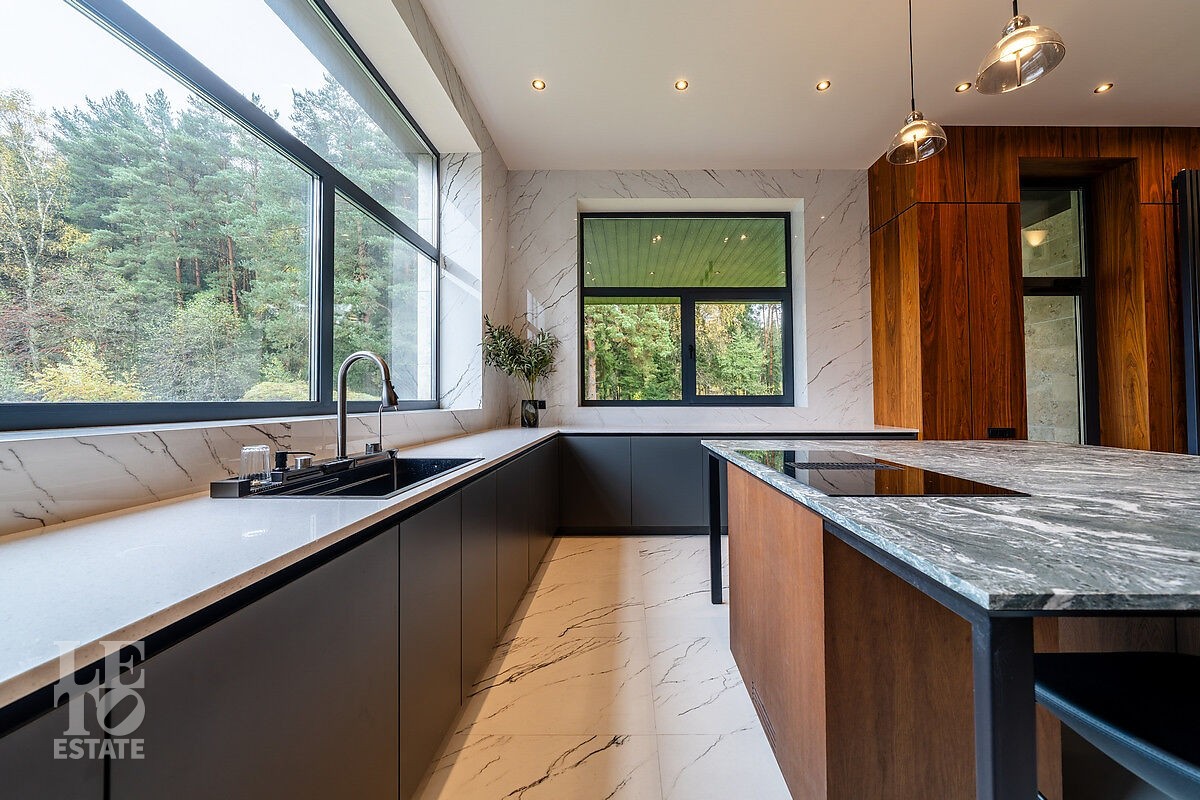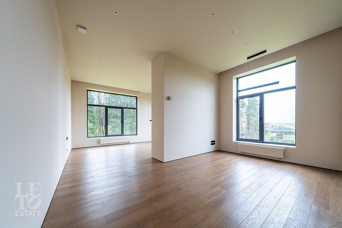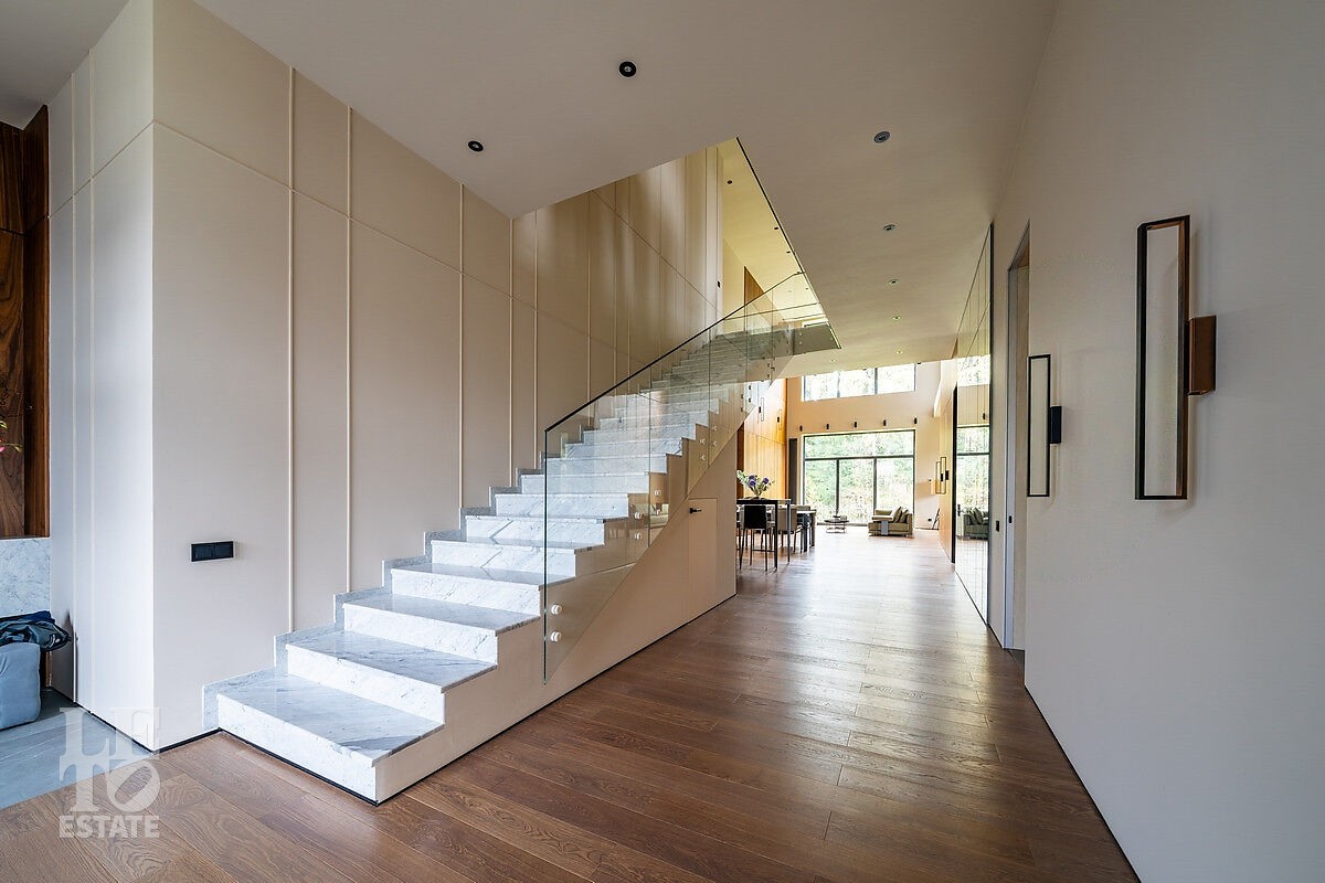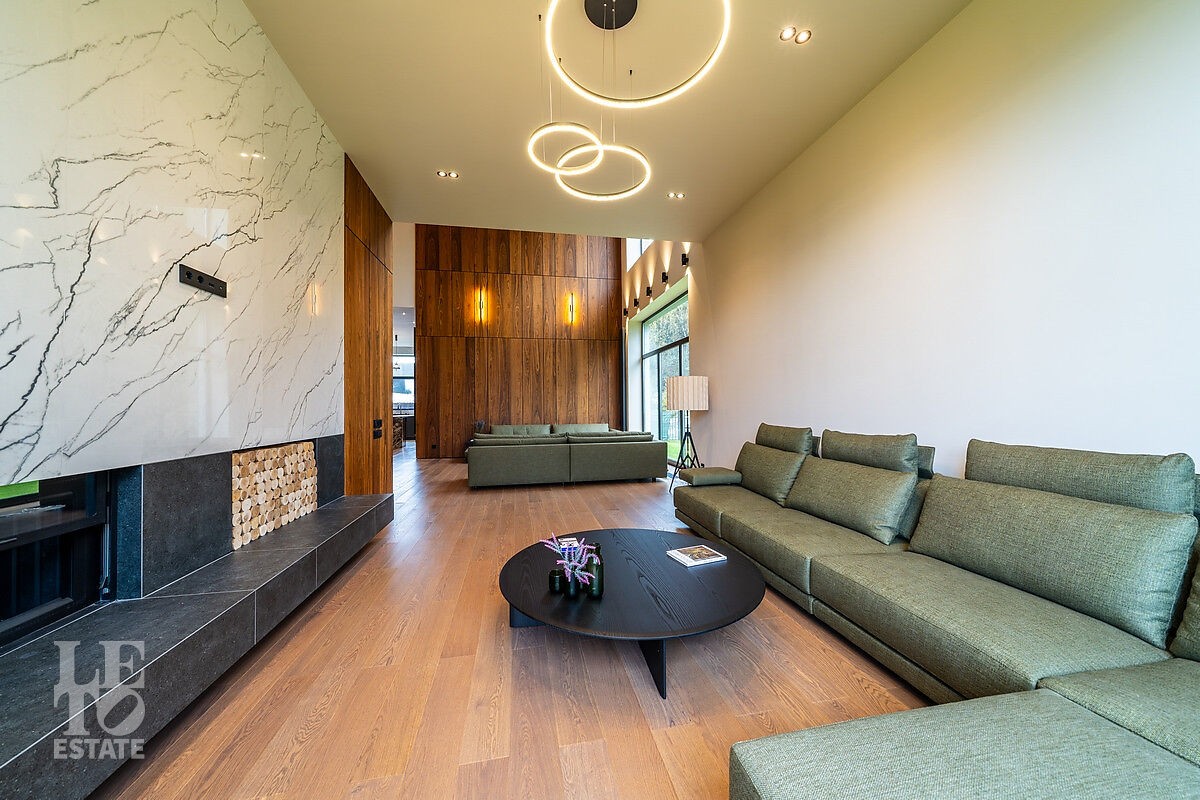 Общественная зона: Полностью укомплектованная мебелью гостиная-столовая-кухня - единое пространство со вторым светом, общей площадью 115 кв. м и объемом - 570 куб. м (выделено 5 функциональных зон: медиа зона с ТВ и дровяным камином, лаунж зона с двумя большими диванами, столовая со столом на 8 персон (с возможностью увеличения до 20), зона бара с двумя сервантами и барной стойкой, парадная кухня с островом 20 кв. м (с доступом в рабочую кухню 12 кв. м)). Окна этого пространства смотрят на восток, юг и запад. Блок свободного назначения с санузлом и сауной (общая площадь блока 37 кв. м, комната может использоваться как игровая, СПА, спортзал, кинотеатр, бильярдная и т.д.). Крытая терраса с видом на лес с доступом из кухни и столовой. Хозяйский санузел первого этажа, оснащенный умывальником, унитазом, биде и писсуаром.