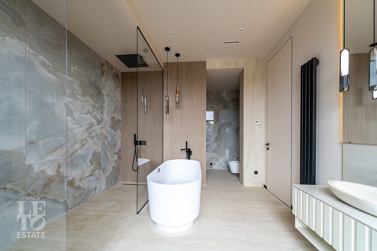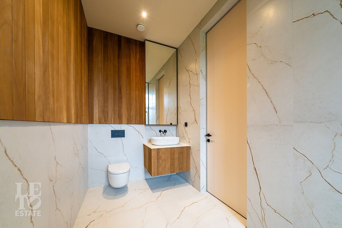 Приватная зона: мастер-блок 81 кв. м (спальня, две гардеробных 18 кв. м и 14 кв. м, санузел), три детских блока площадью 44, 55 и 56 кв. м (четкое зонирование, выделяющее кабинет-игровую-гардеробную, детскую и полноценный санузел с окном, ванной, душевой, умывальником, унитазом и биде), прачечная.