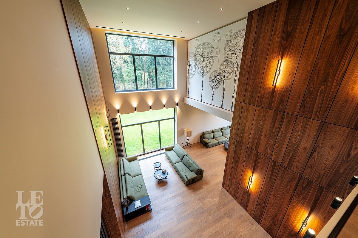 Ощущение пространства в доме обеспечивает большая площадь остекления и высота потолков в комнатах от 3,5 до 7,2 м.