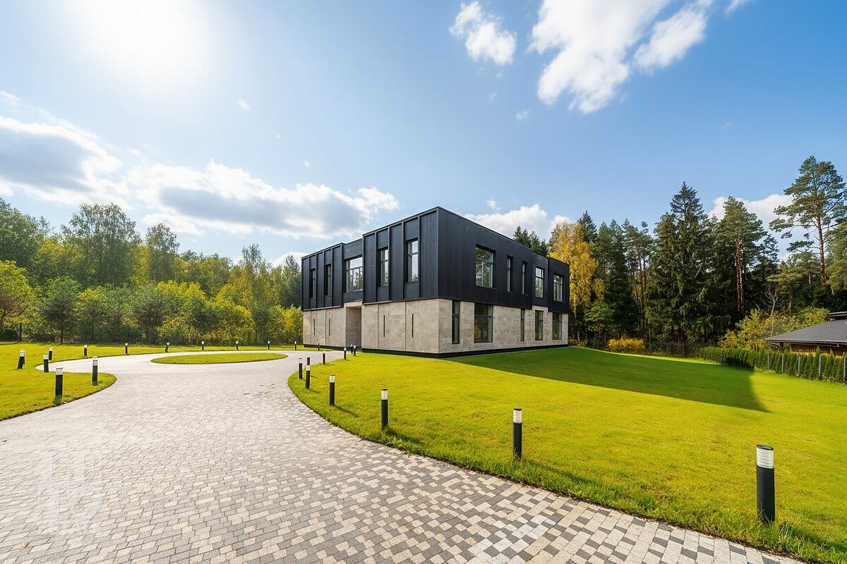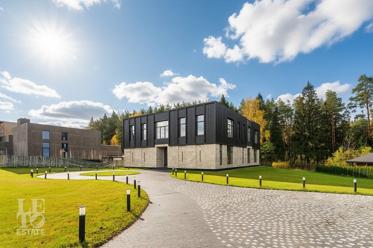 Одно из лучших расположений в поселке – первая линия от леса и вдали от транзитных дорог. Посадка дома учитывает соседние дома и обеспечивает вид на лес из окон трех сторон.