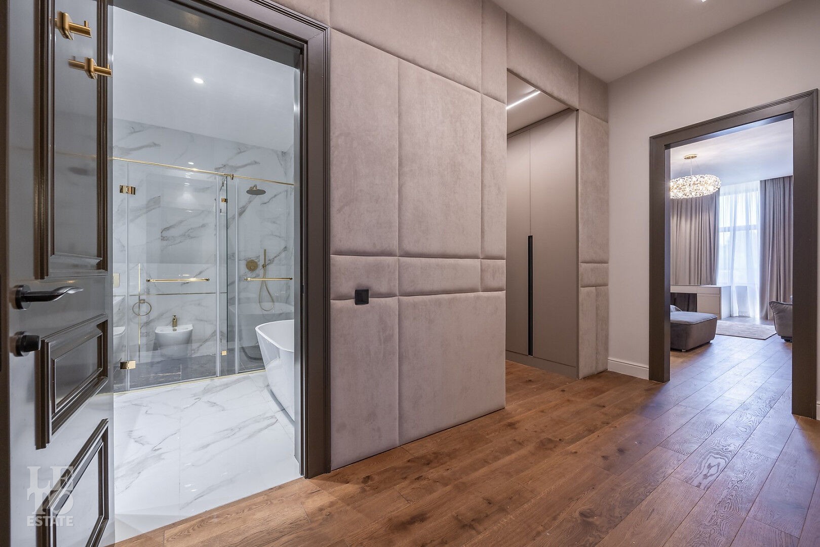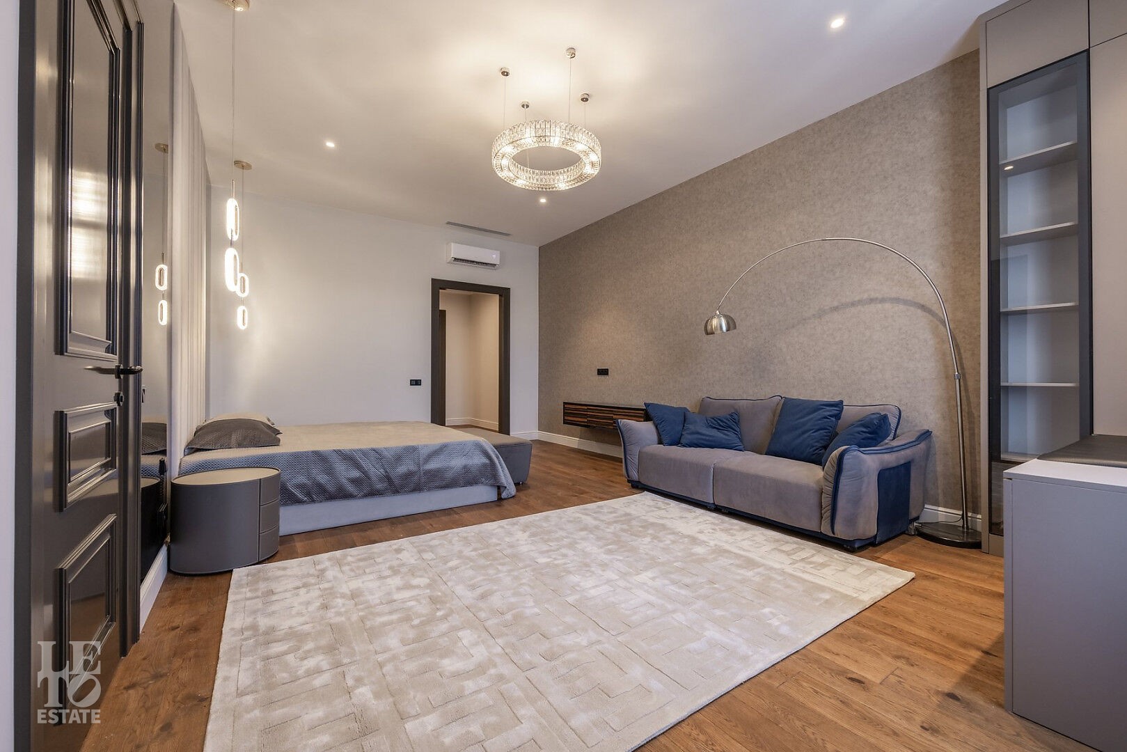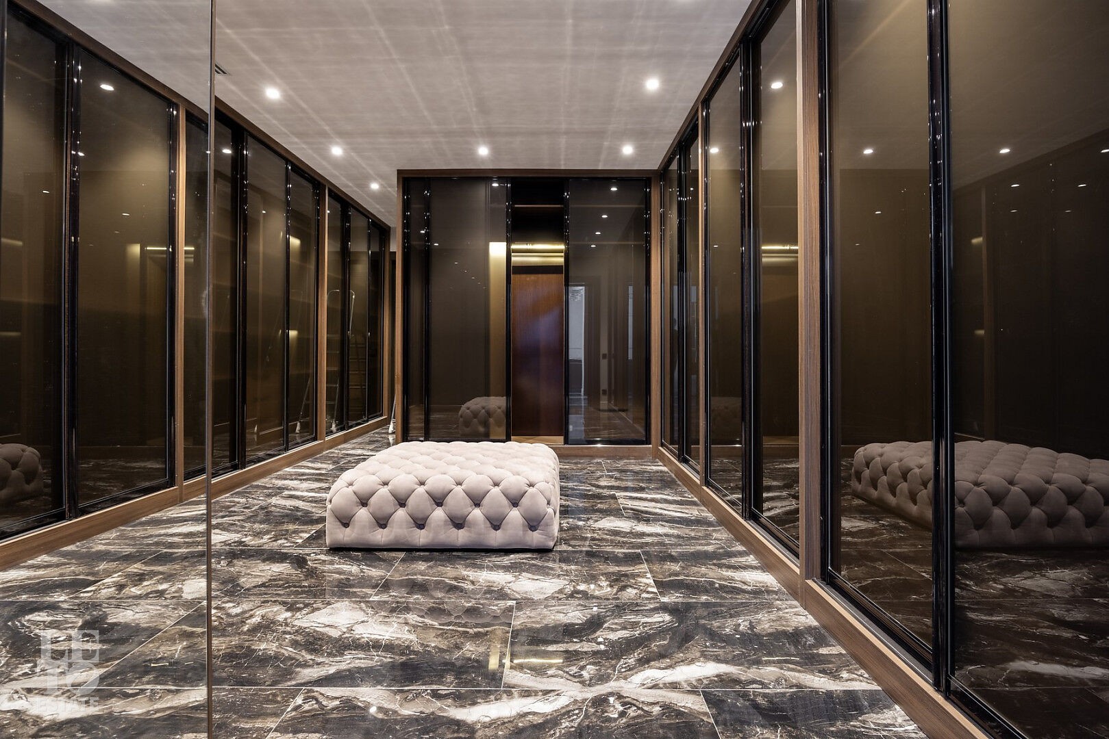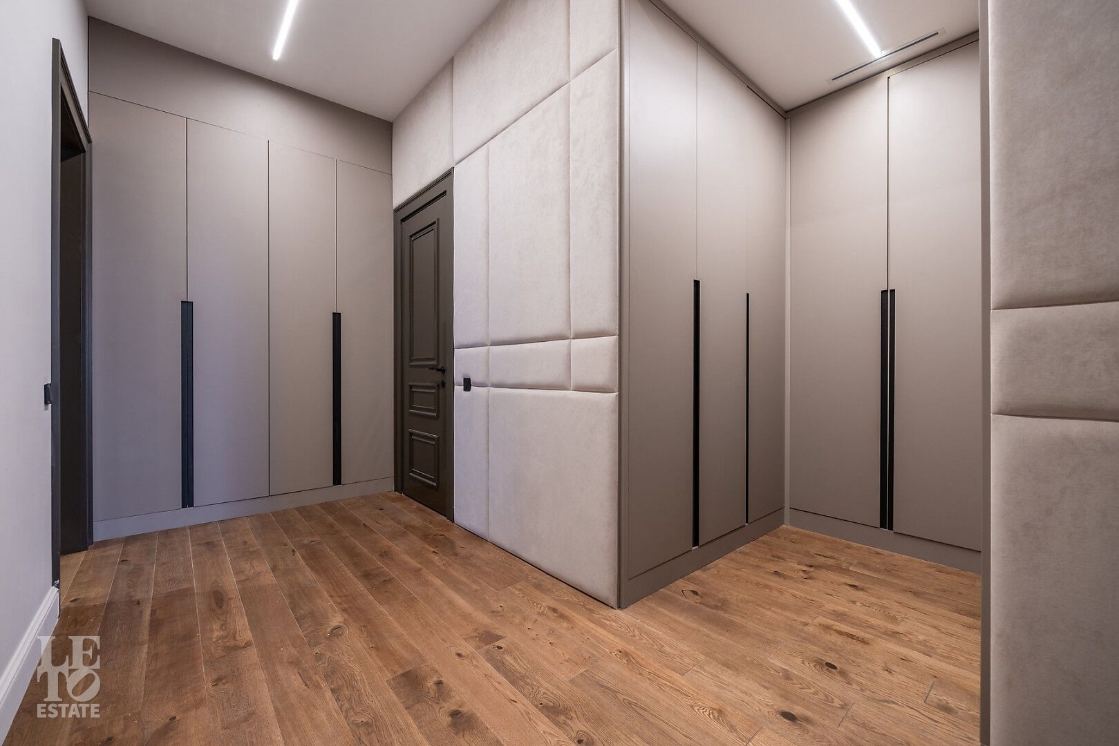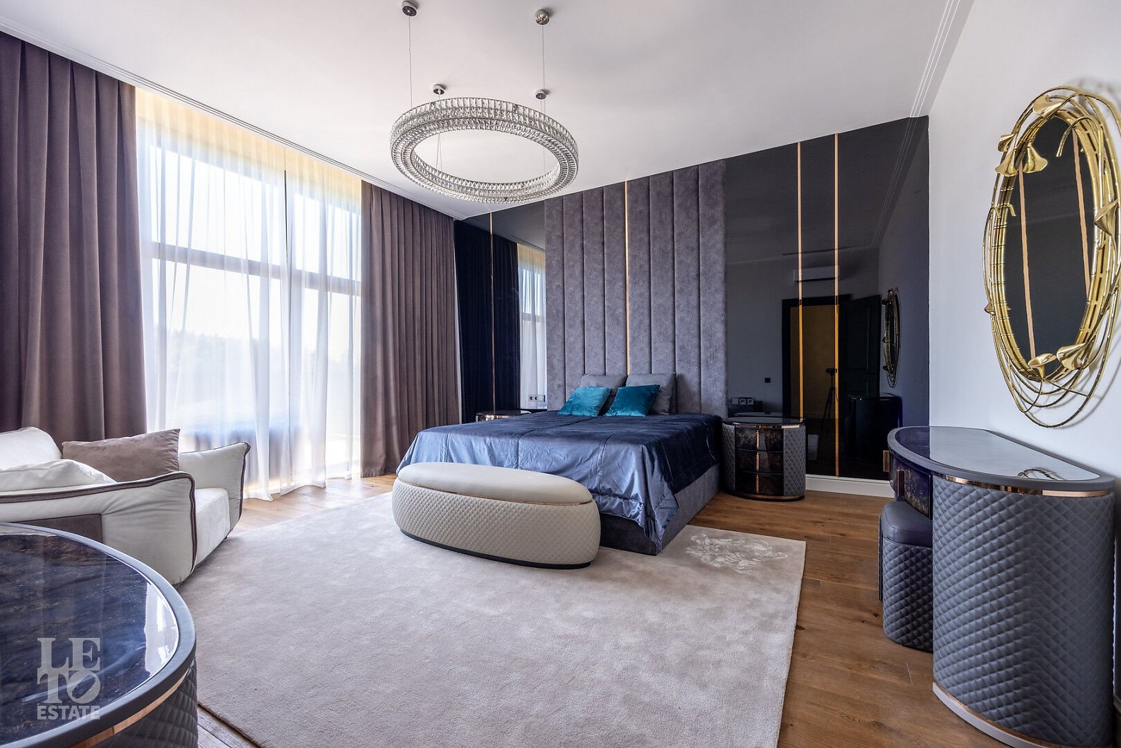 Второй этаж: мастер-спальня с гардеробной и двумя ванными комнатами, три спальни, каждая со своей гардеробной и ванной комнатами, кабинет.