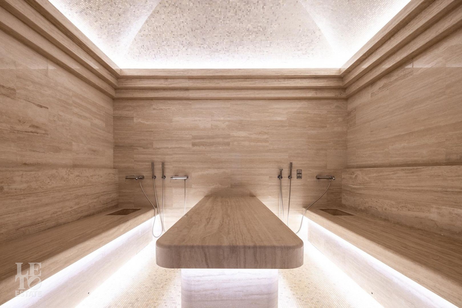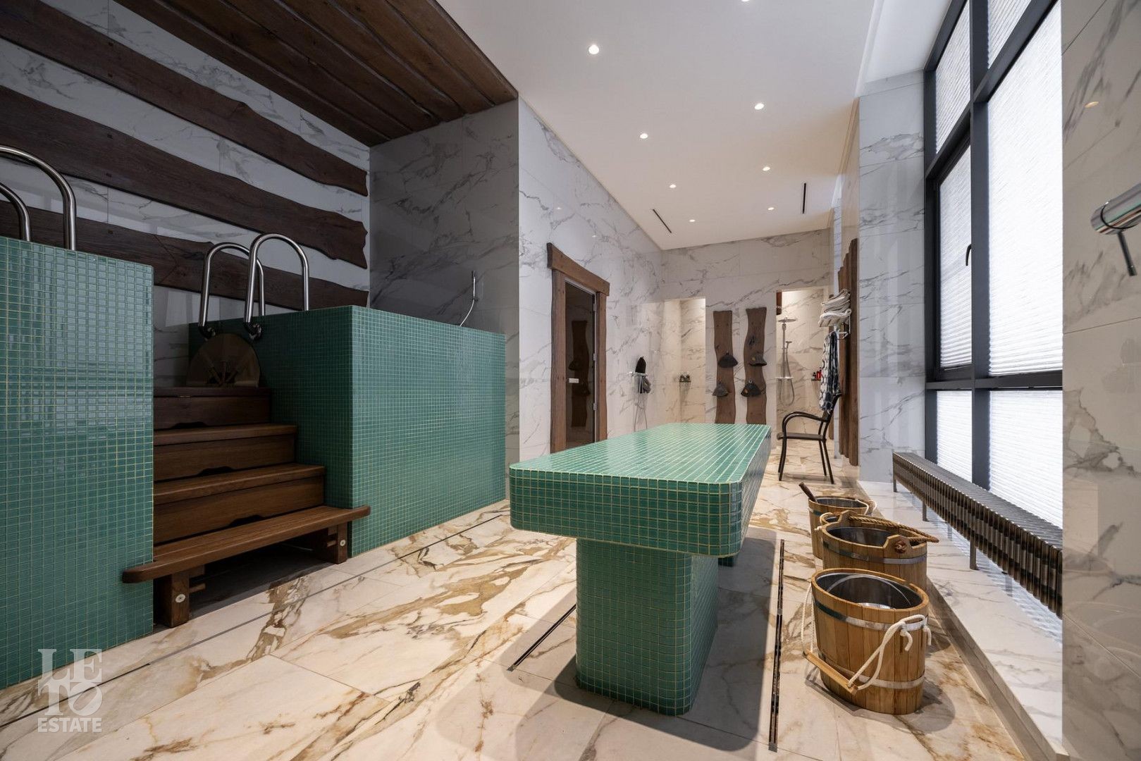 Первый этаж: холл, коридор, гостиная, кухня-столовая, вторая гостиная, 2 санузла, SPA-зона с хаммамом, техническое помещение, кладовая, постирочная, гараж на 2 автомобиля.