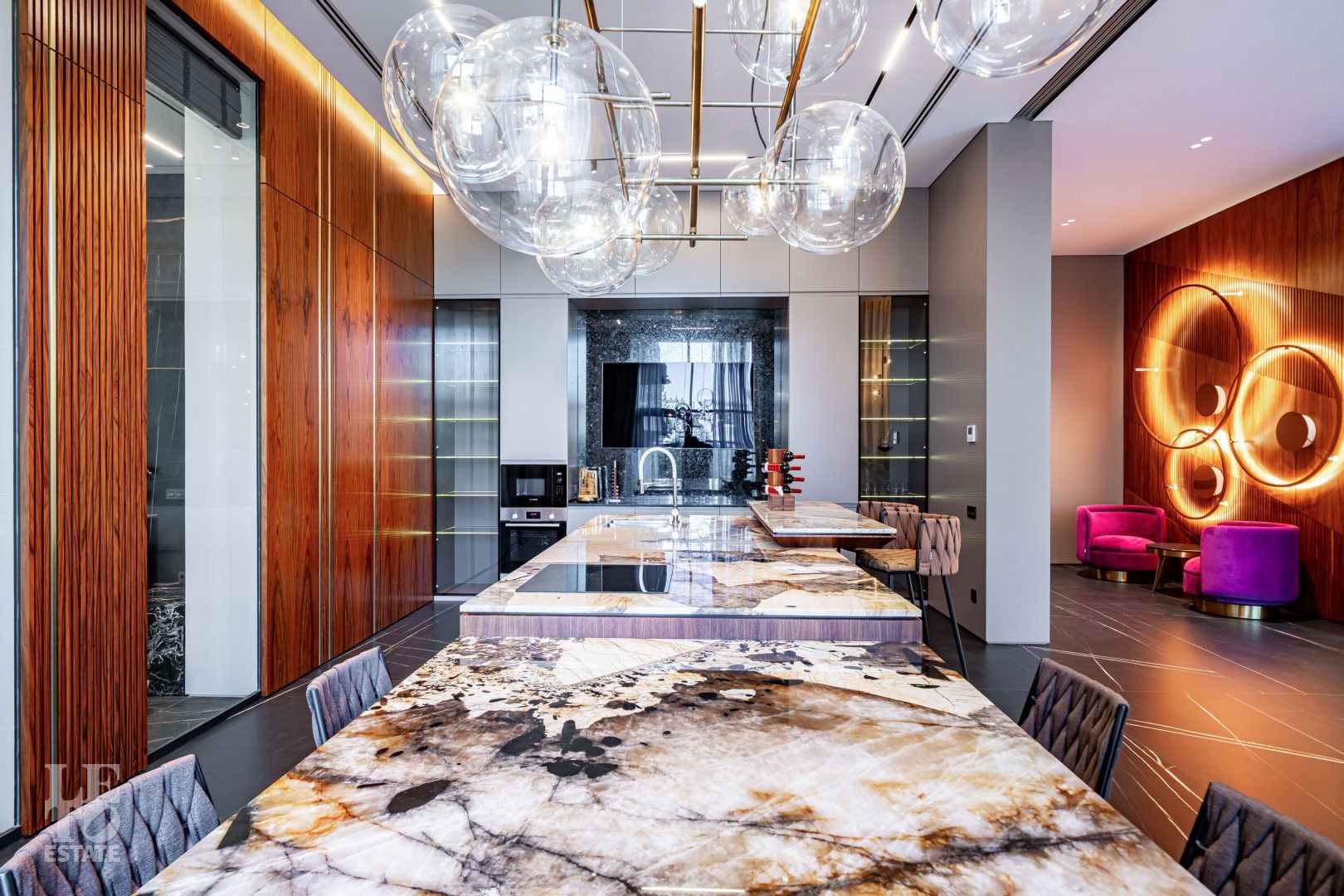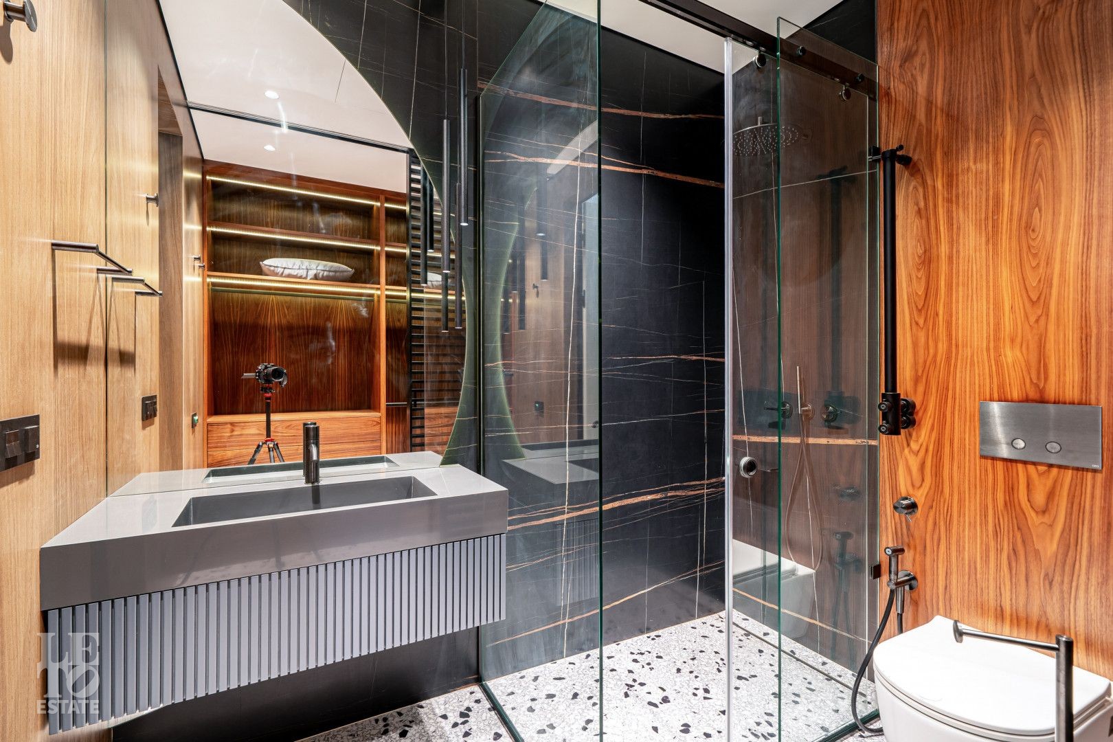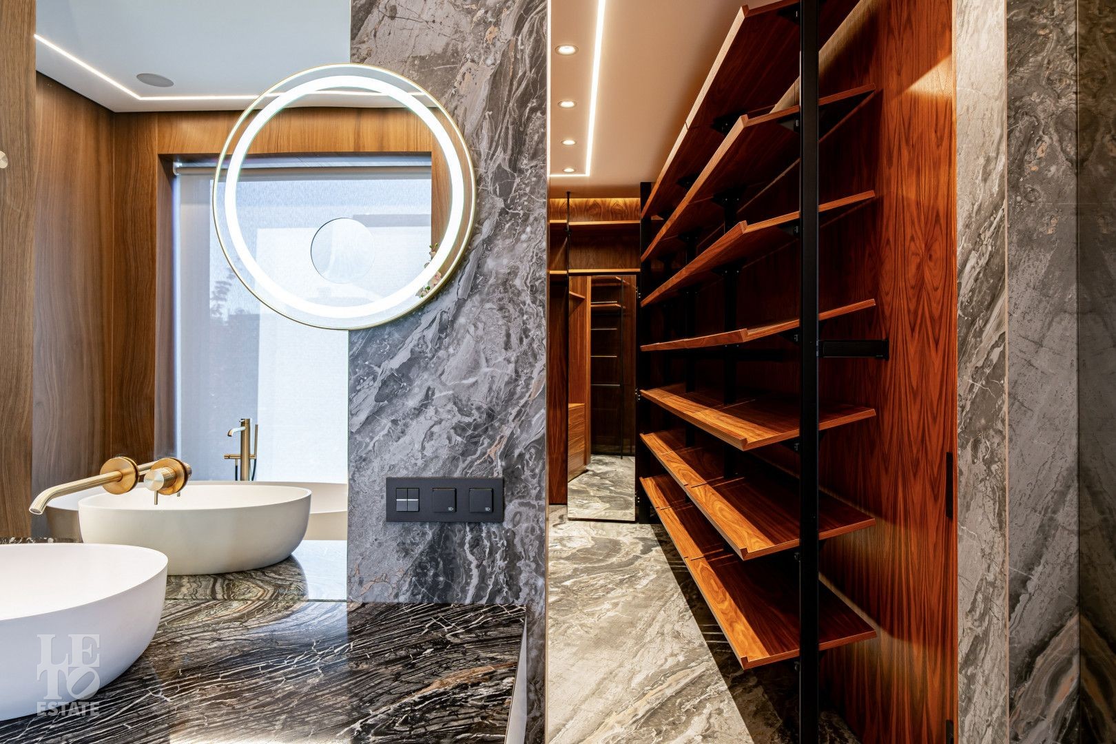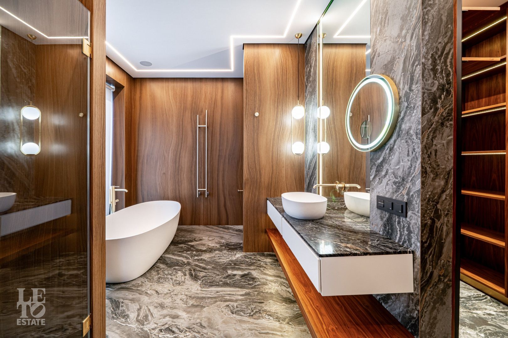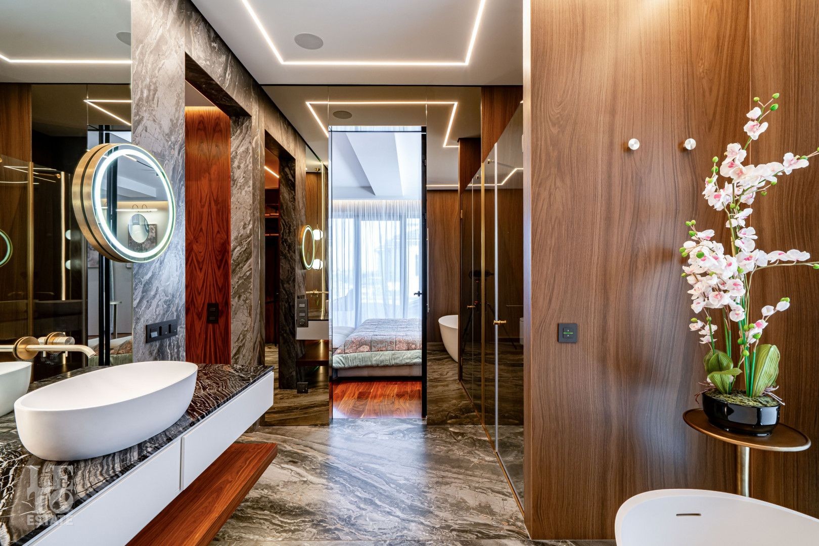 Интерьер создан студией Prosvirin Design и сочетает натуральные материалы и высокие технологии. В отделке использованы кварцит, редкие породы дерева, итальянская сантехника CEA и Antonio Lupi, свет от Центрсвет и ведущих итальянских брендов.