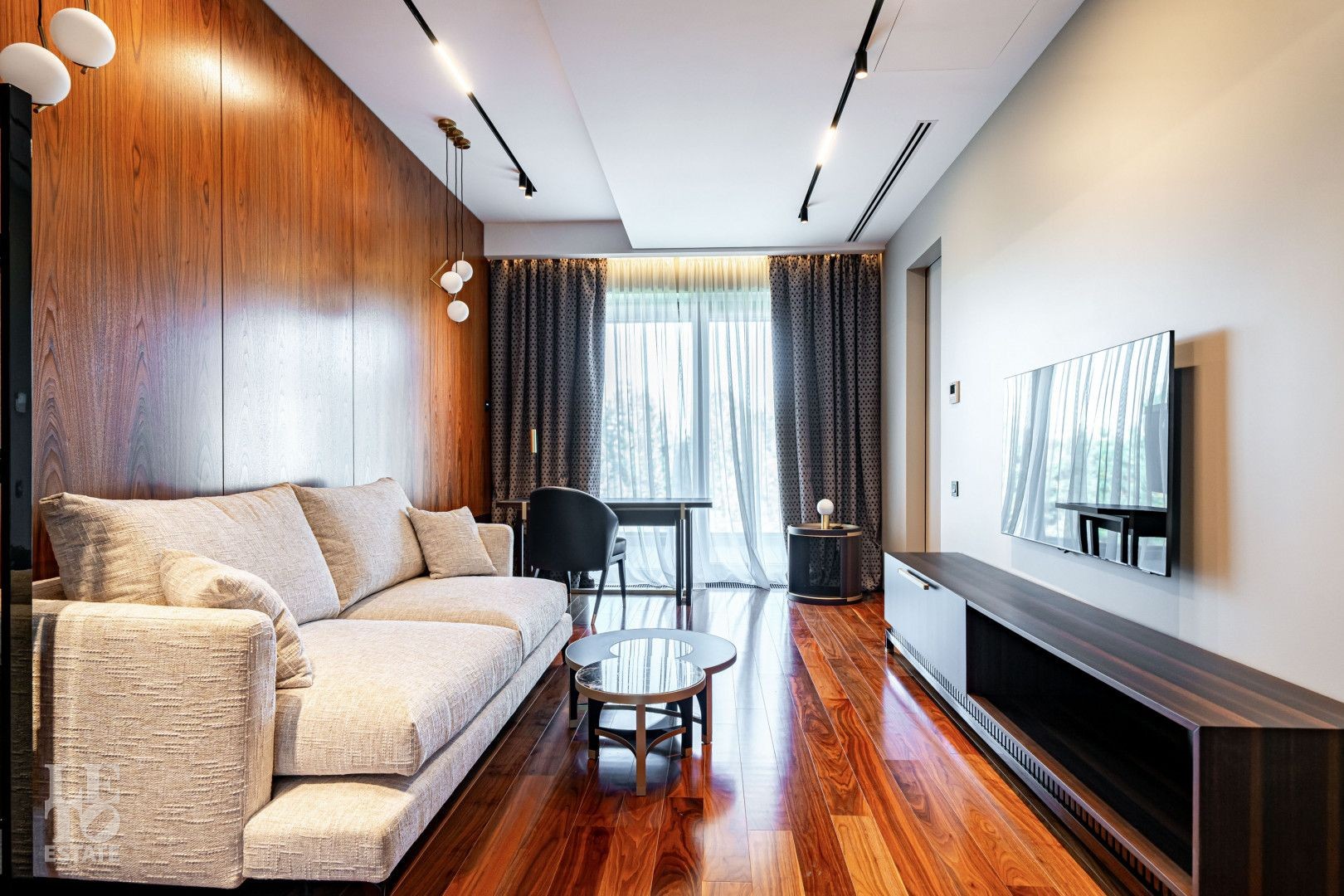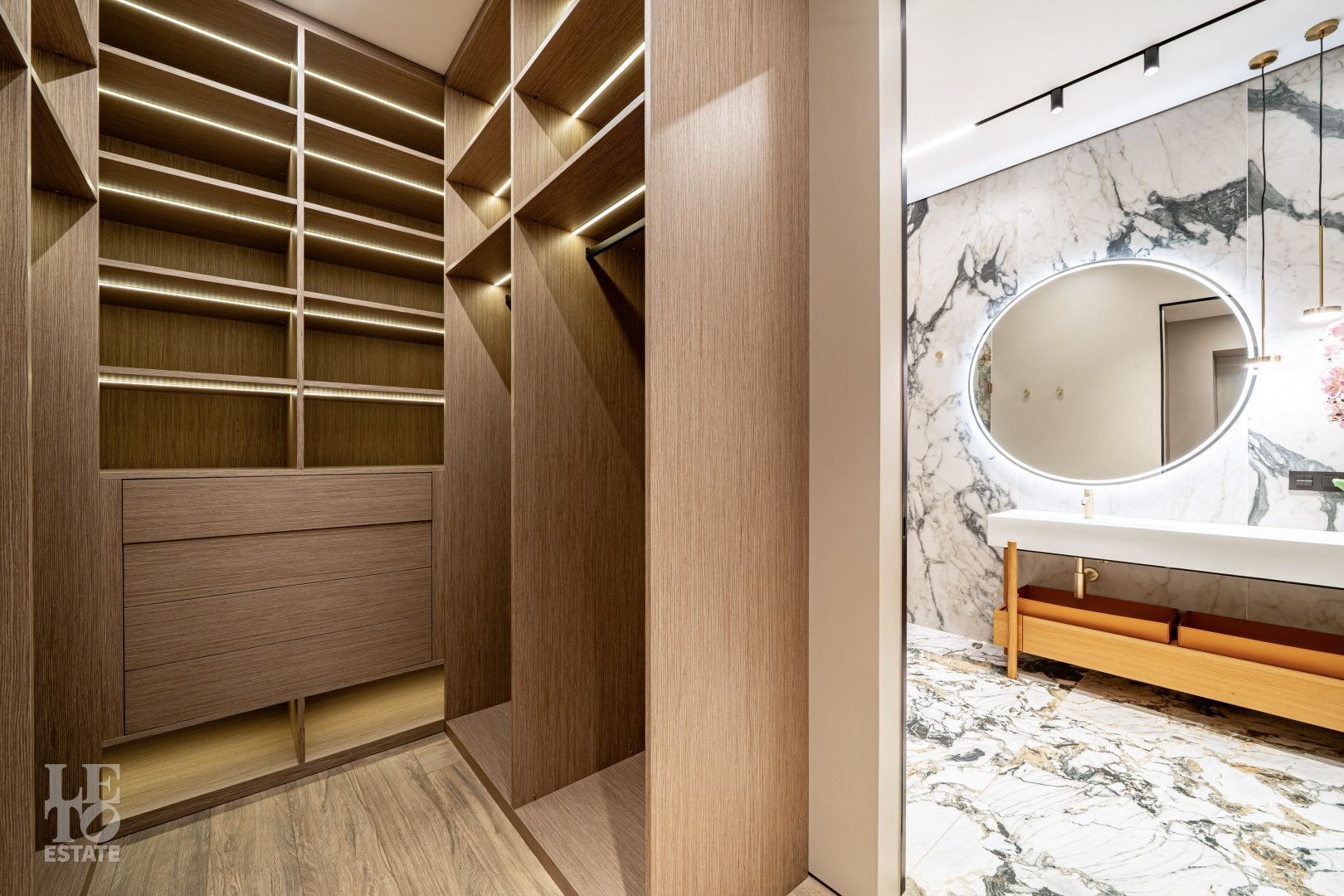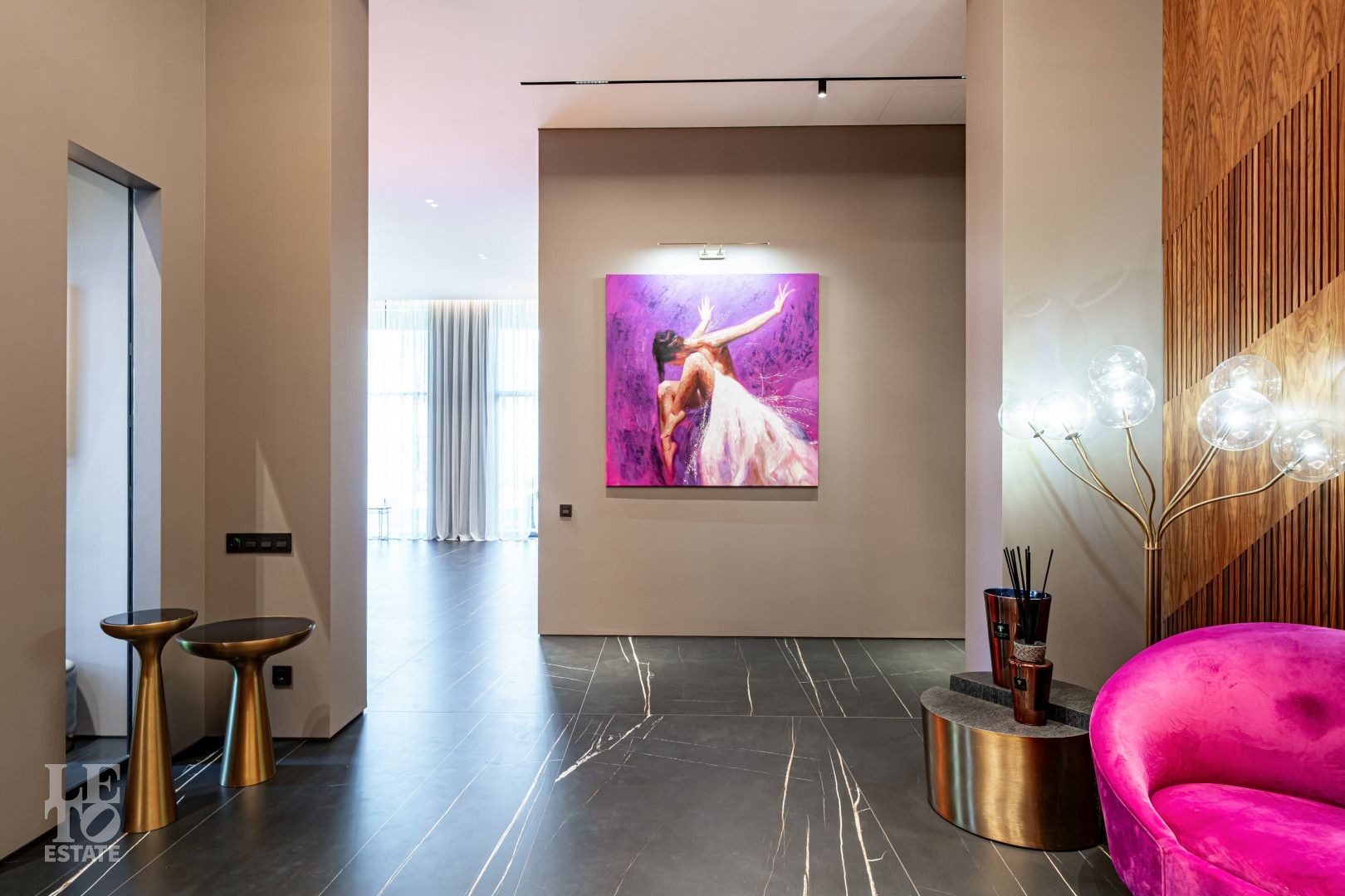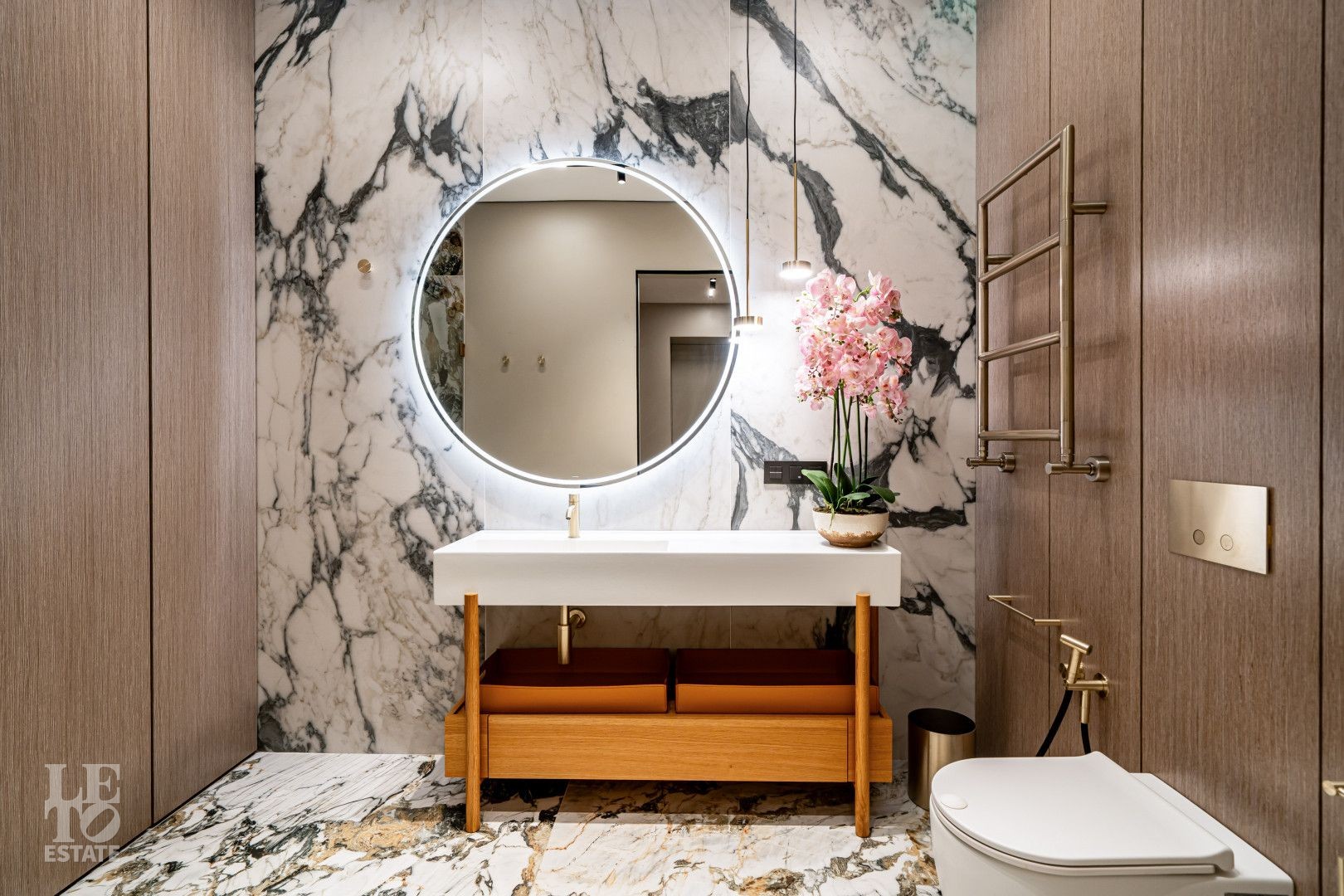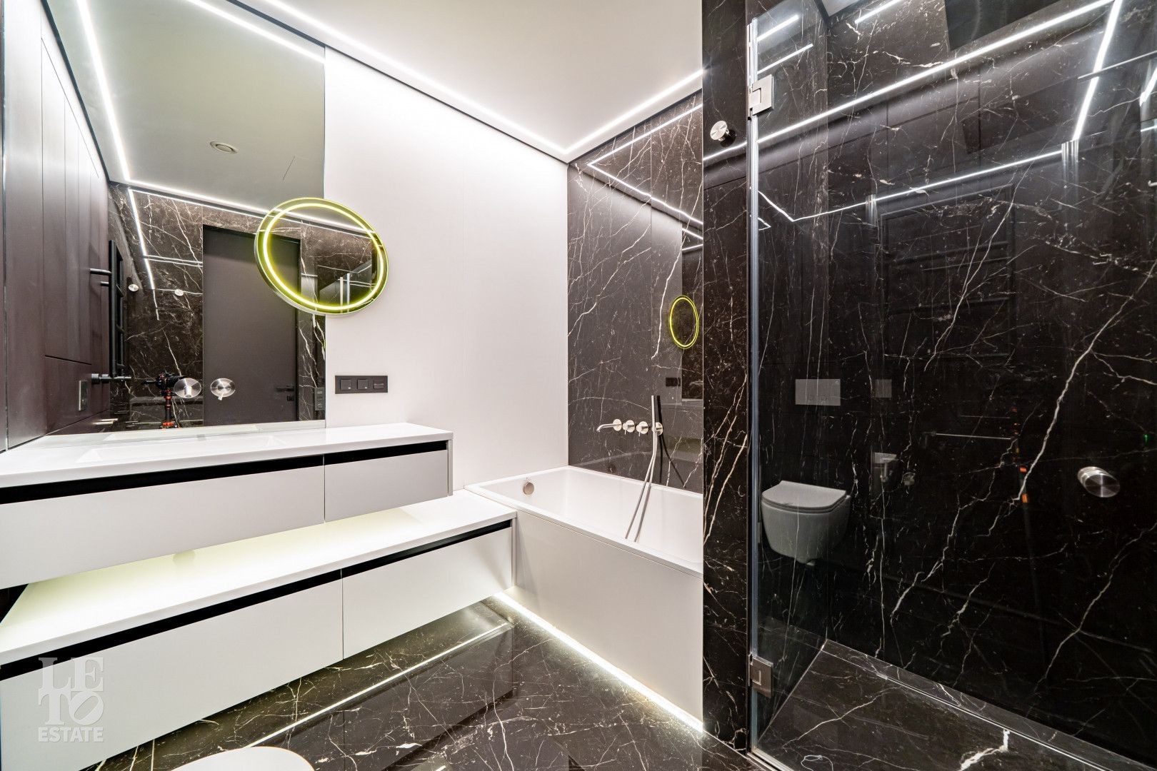 Интерьер создан студией Prosvirin Design и сочетает натуральные материалы и высокие технологии. В отделке использованы кварцит, редкие породы дерева, итальянская сантехника CEA и Antonio Lupi, свет от Центрсвет и ведущих итальянских брендов.