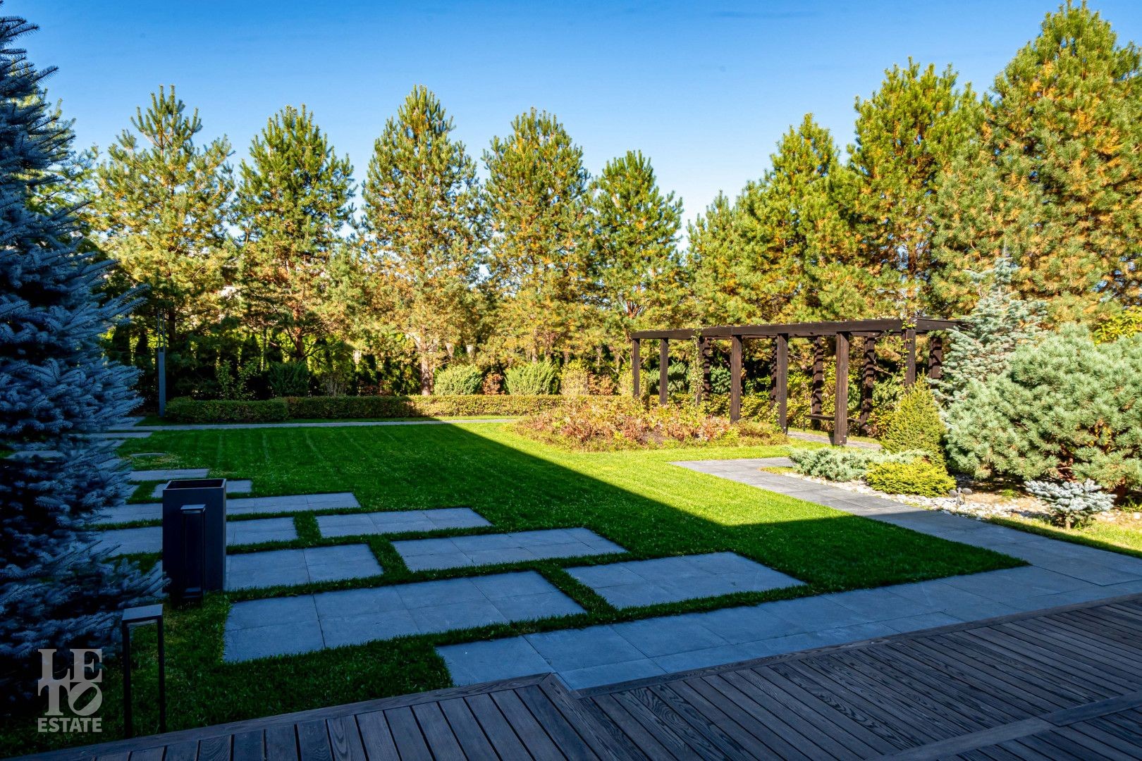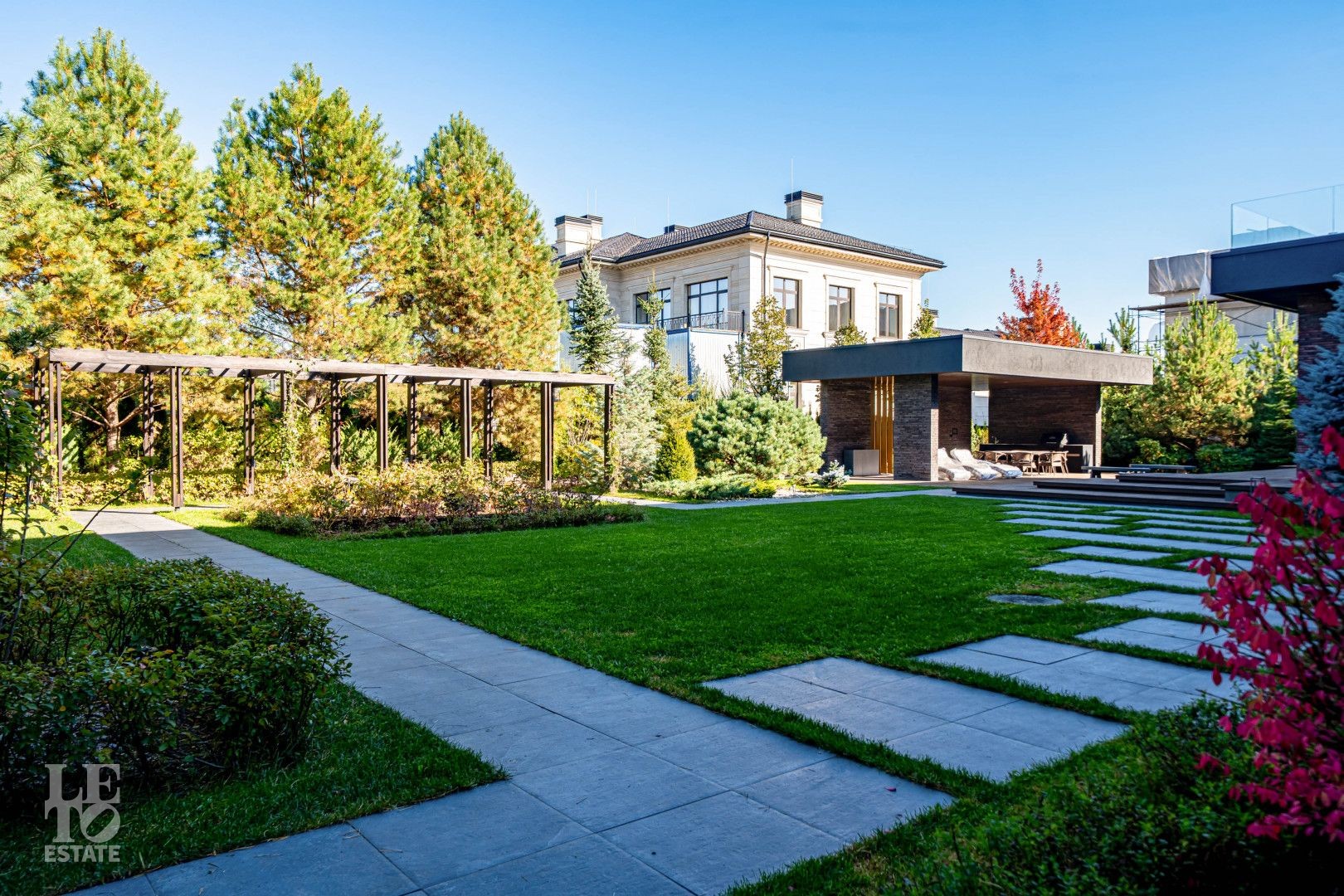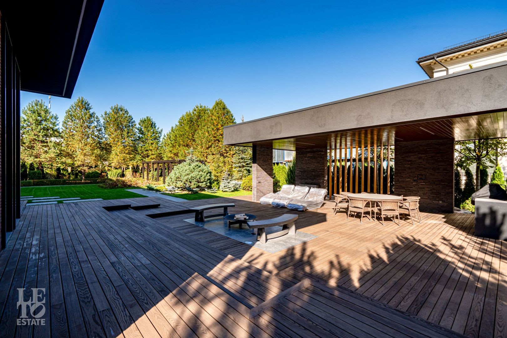 На участке выполнен ландшафтный дизайн с перголами, зелёными изгородями и уютными дорожками. Просторная терраса приглашает к отдыху на свежем воздухе и становится естественным продолжением дома в летние месяцы. Уличная кухня оборудована техникой Bosch и грилем Napoleon, что делает летние вечера особенно приятными.