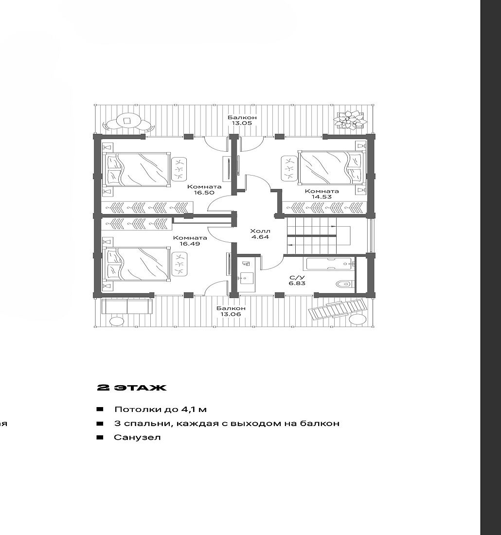 Второй этаж: спальня с балконом, детская комната с балконом, гостевая комната с балконом, санузел с балконом.