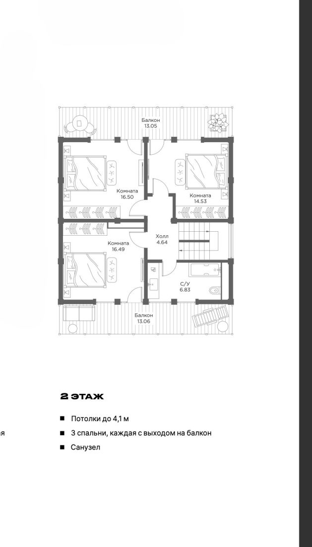 Второй этаж: спальня с балконом, детская комната с балконом, гостевая комната с балконом, санузел с балконом.