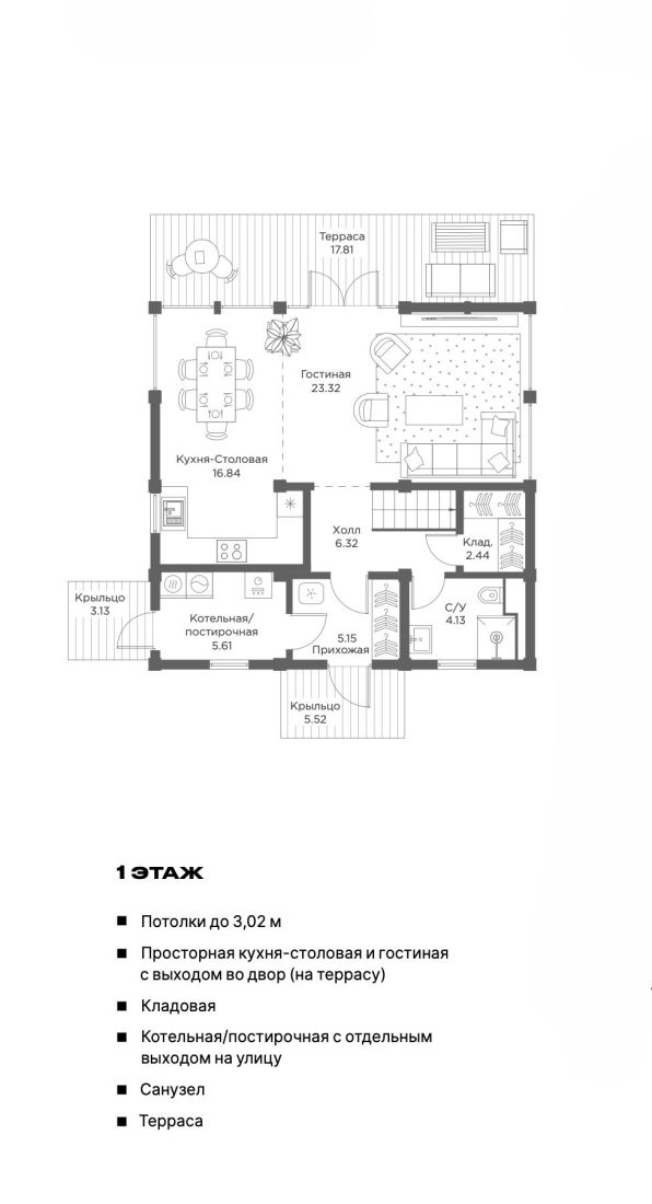 Первый этаж: прихожая, холл, кухня-столовая и гостиная с выходом на террасу, кладовая, санузел, котельная.