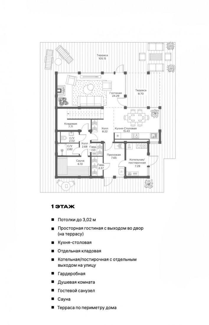Первый этаж: прихожая, кухня-столовая, гостиная с выходом на террасу, сауна с санузлом, гардеробная, санузел, котельная.